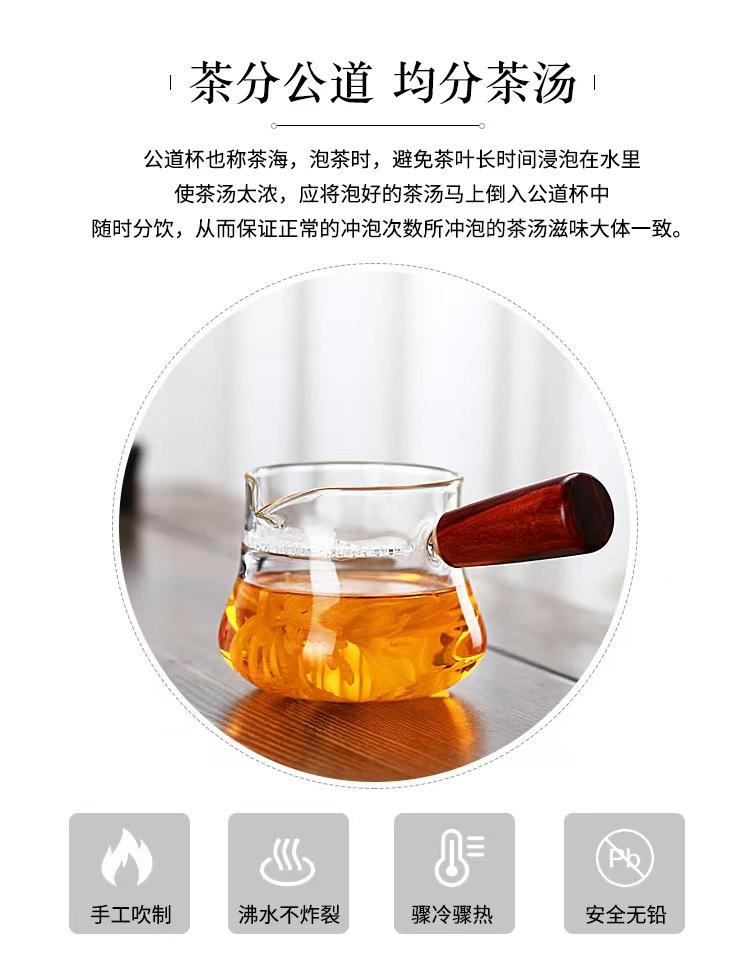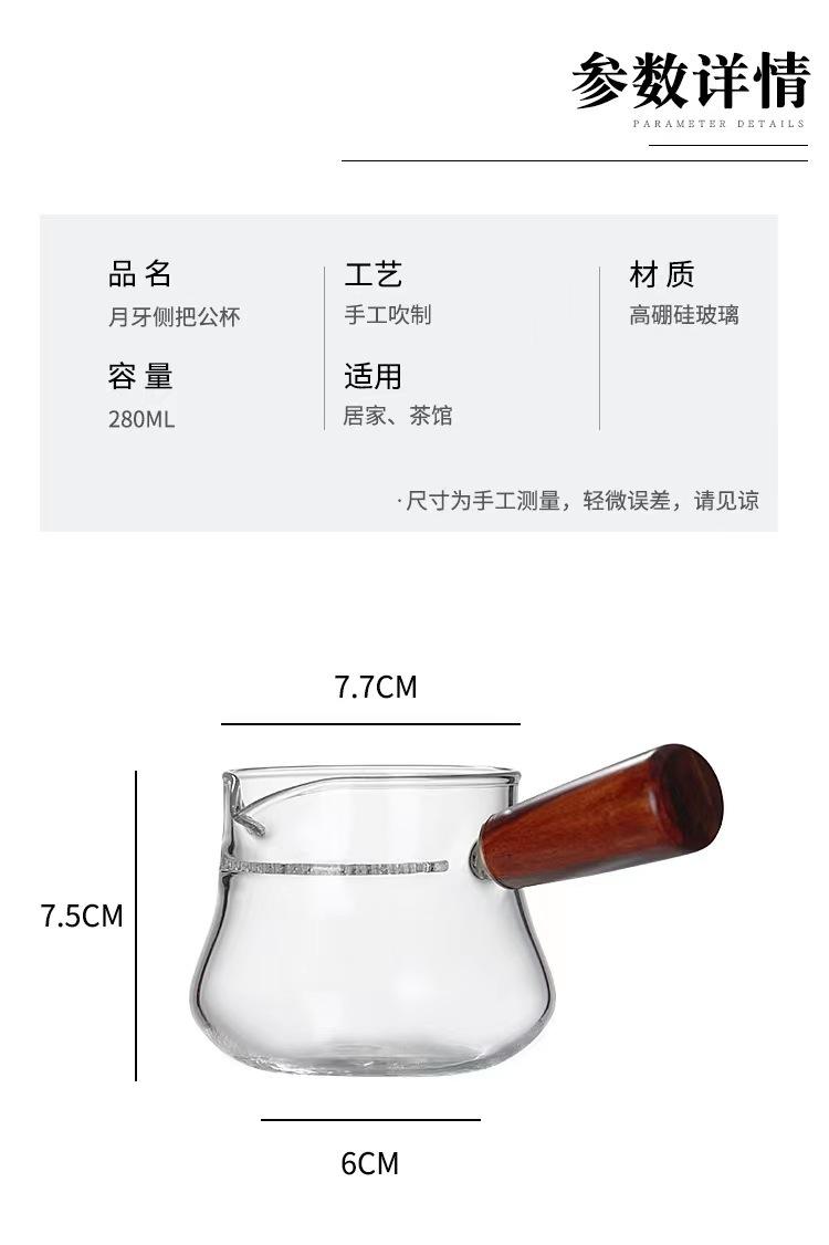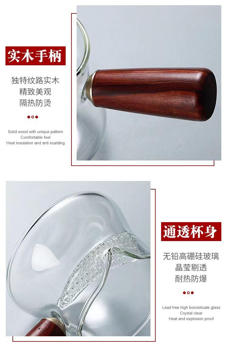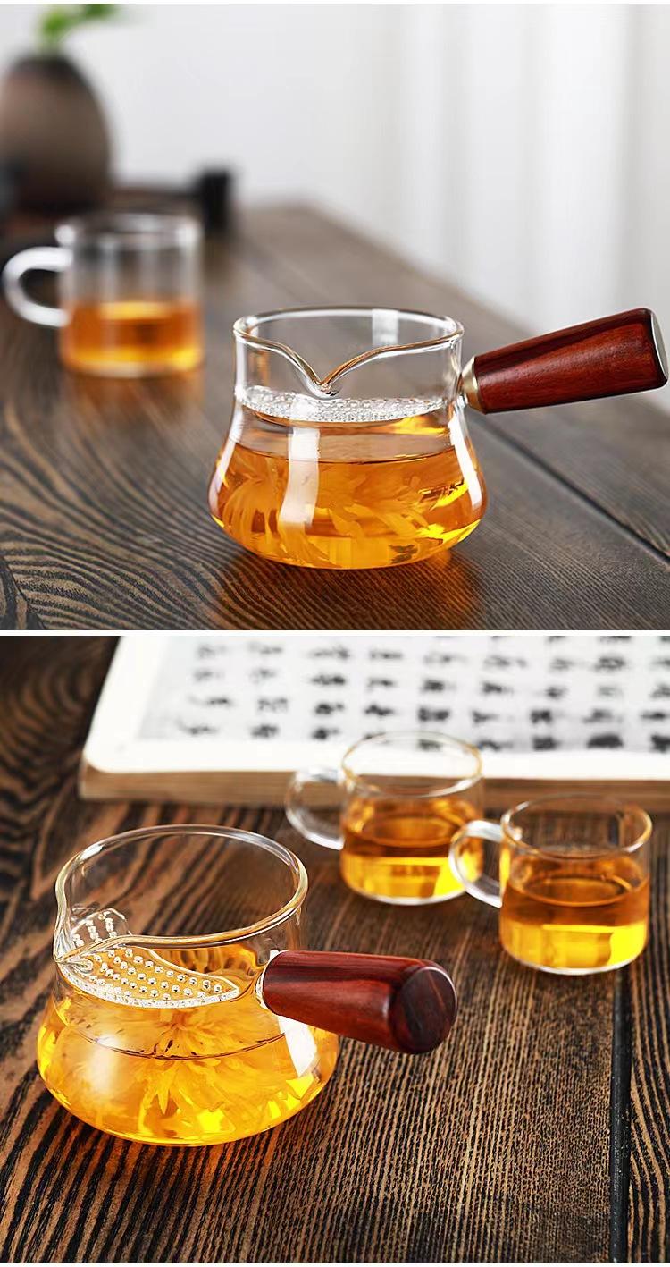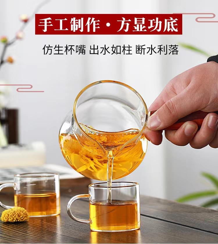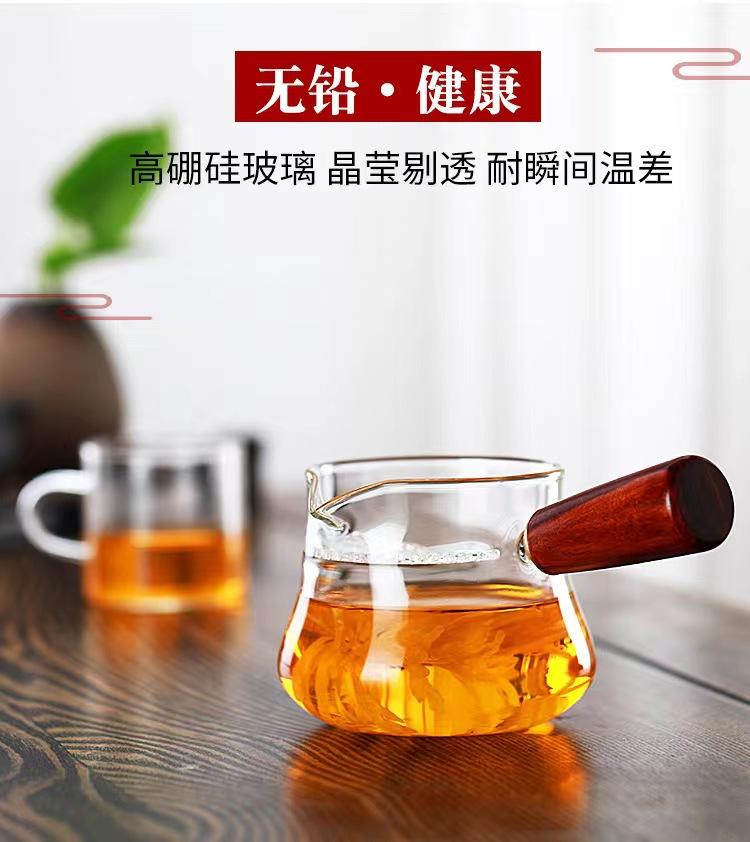 Taza Gongdao de vidrio de borosilicato con pieza en forma de media luna, asa lateral de madera, juego de té de kung fu marino de vidrio transparente, dispensador de té, taza uniforme