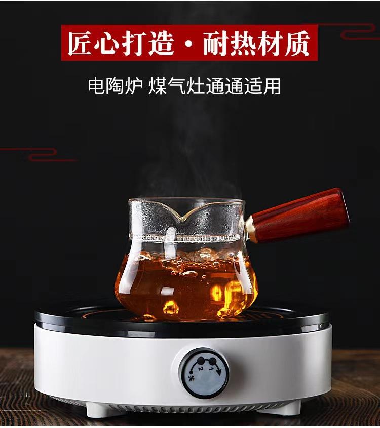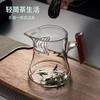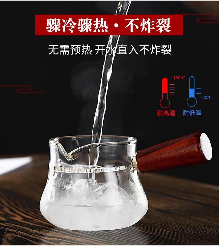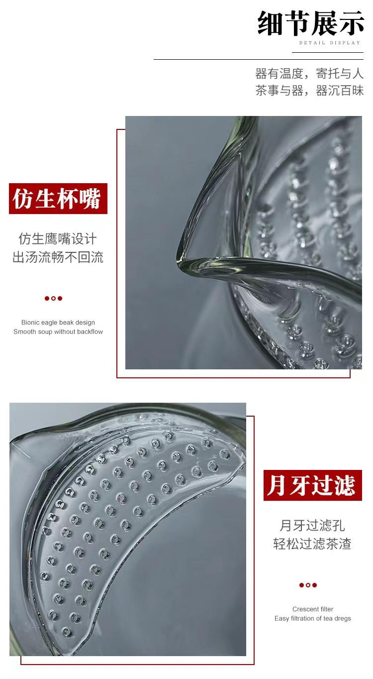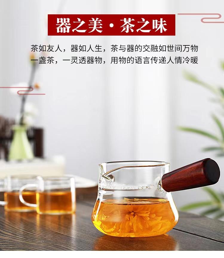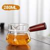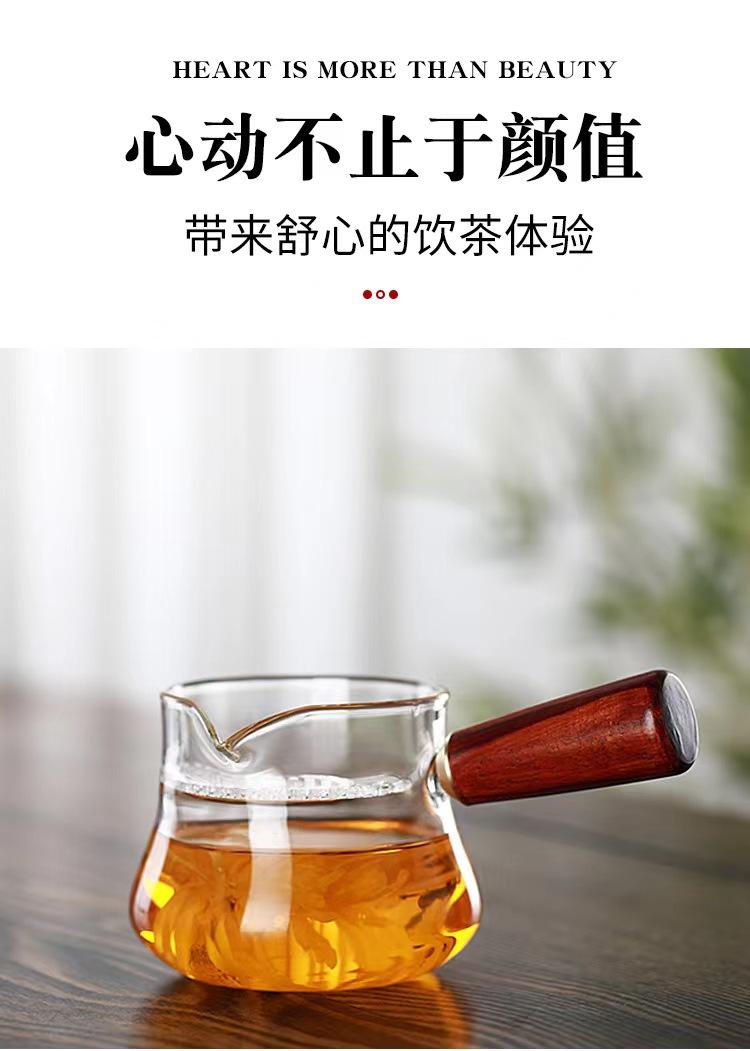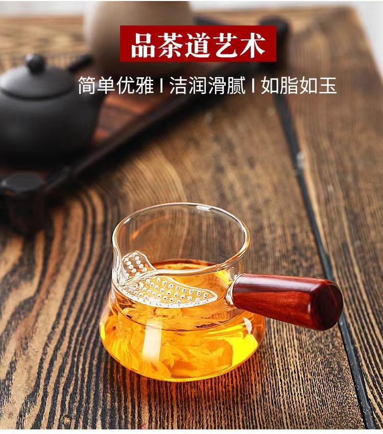 Taza Gongdao de vidrio de borosilicato con pieza en forma de media luna, asa lateral de madera, juego de té de kung fu marino de vidrio transparente, dispensador de té, taza uniforme