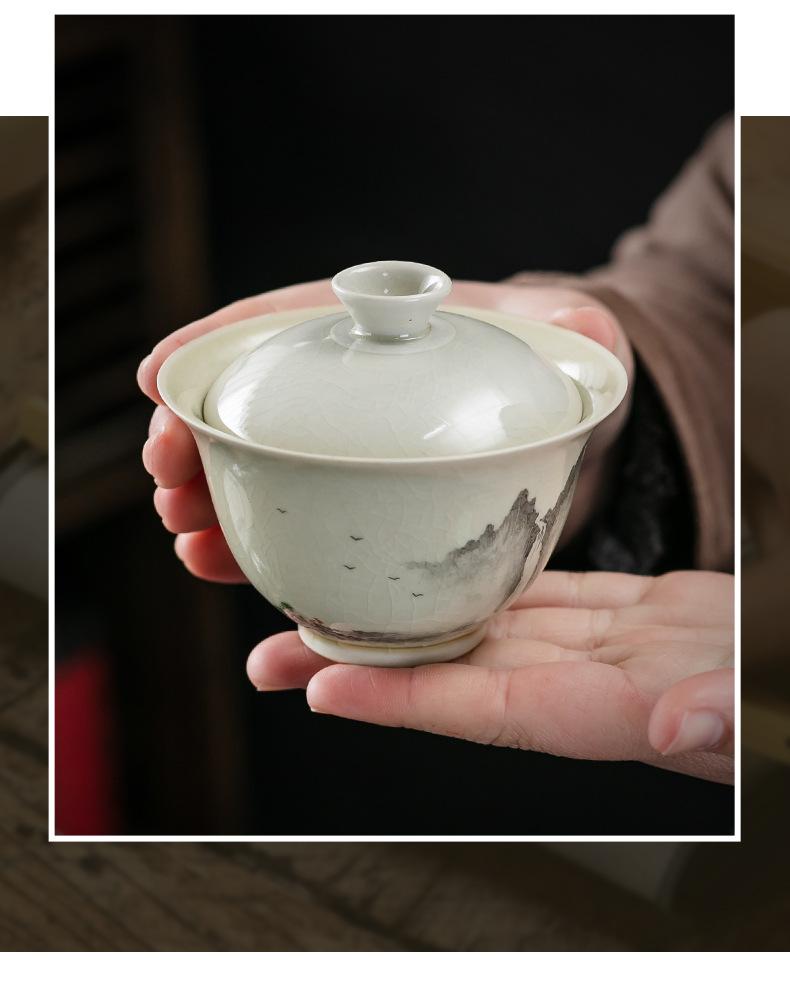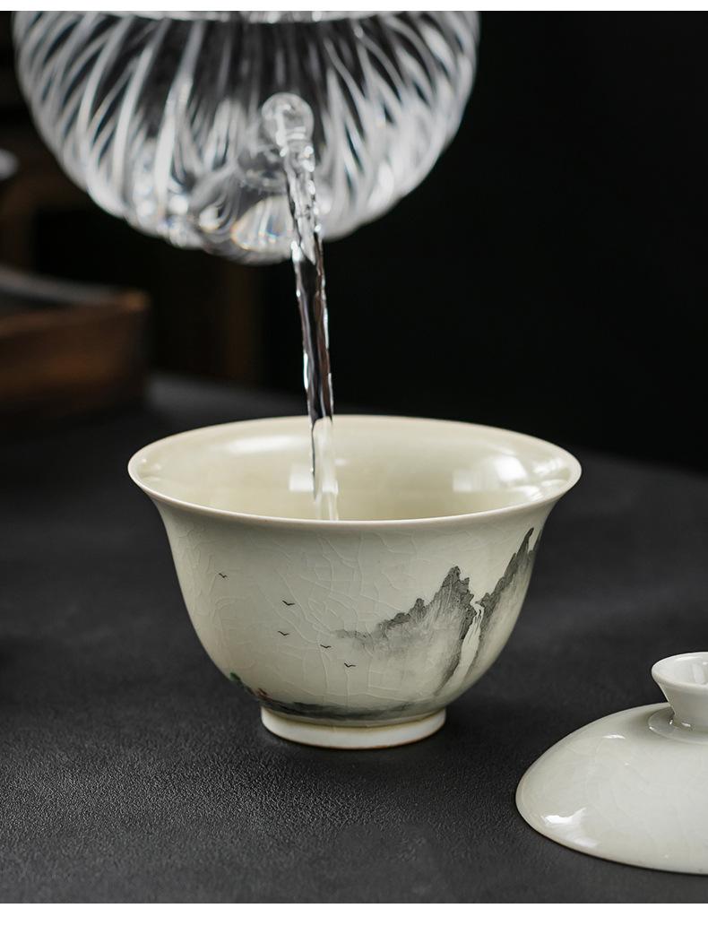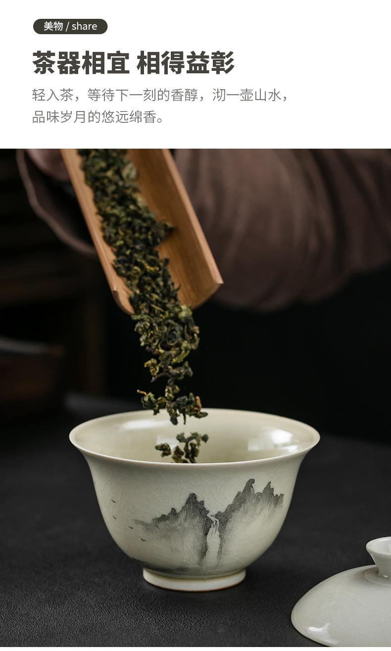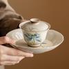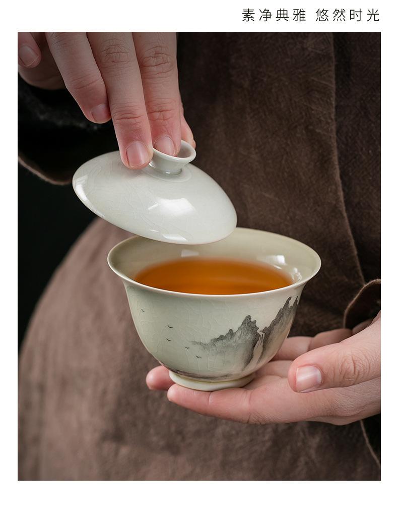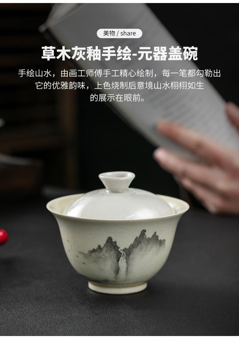 Tazón de té individual de alta gama, taza mediana de estilo chino, juego de té de cerámica Kung Fu para el hogar, con cubierta de tres talentos y esmaltado gris vegetal, antiescaldaduras