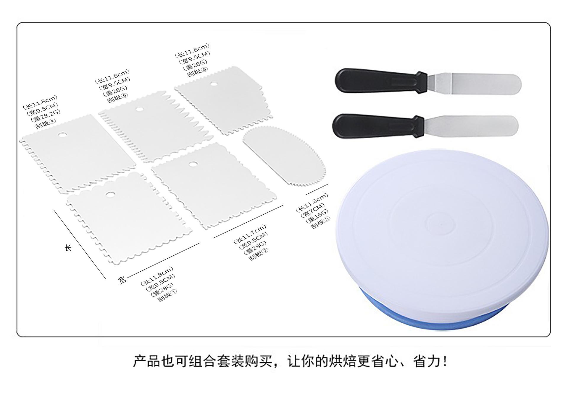 Kit de producto: Incluye un plato giratorio antideslizante para pasteles, un raspador con una espátula curva y otra recta, y 10 raspadores. Para necesidades específicas, contacte con el servicio de atención al cliente.