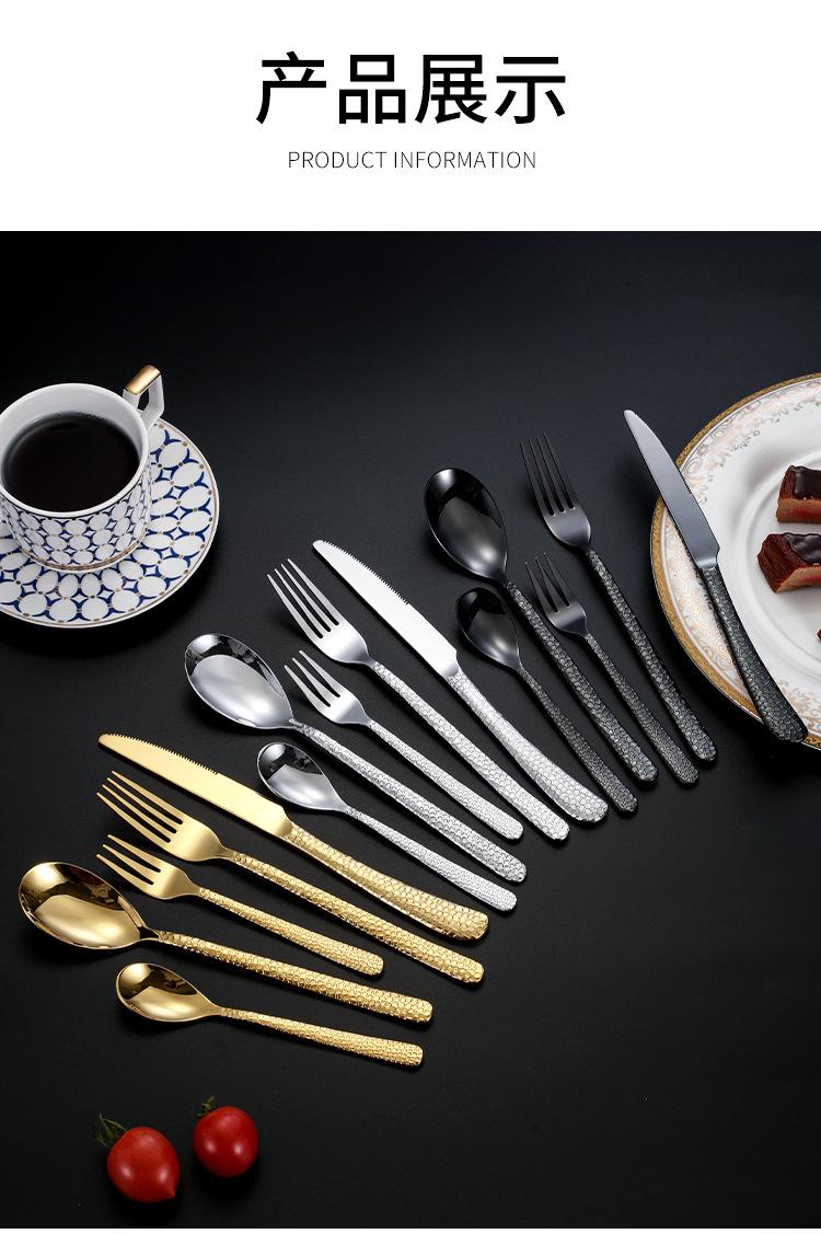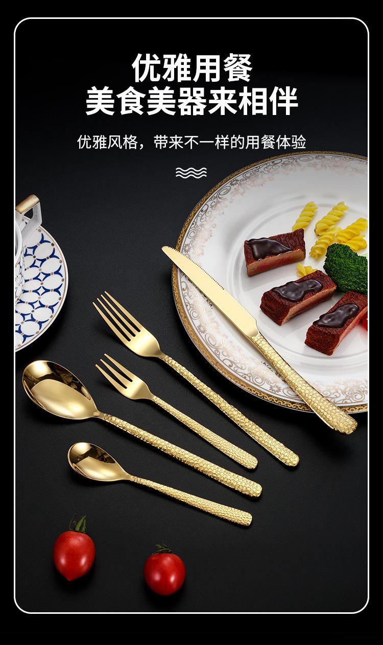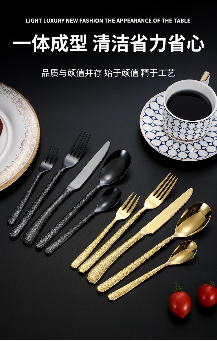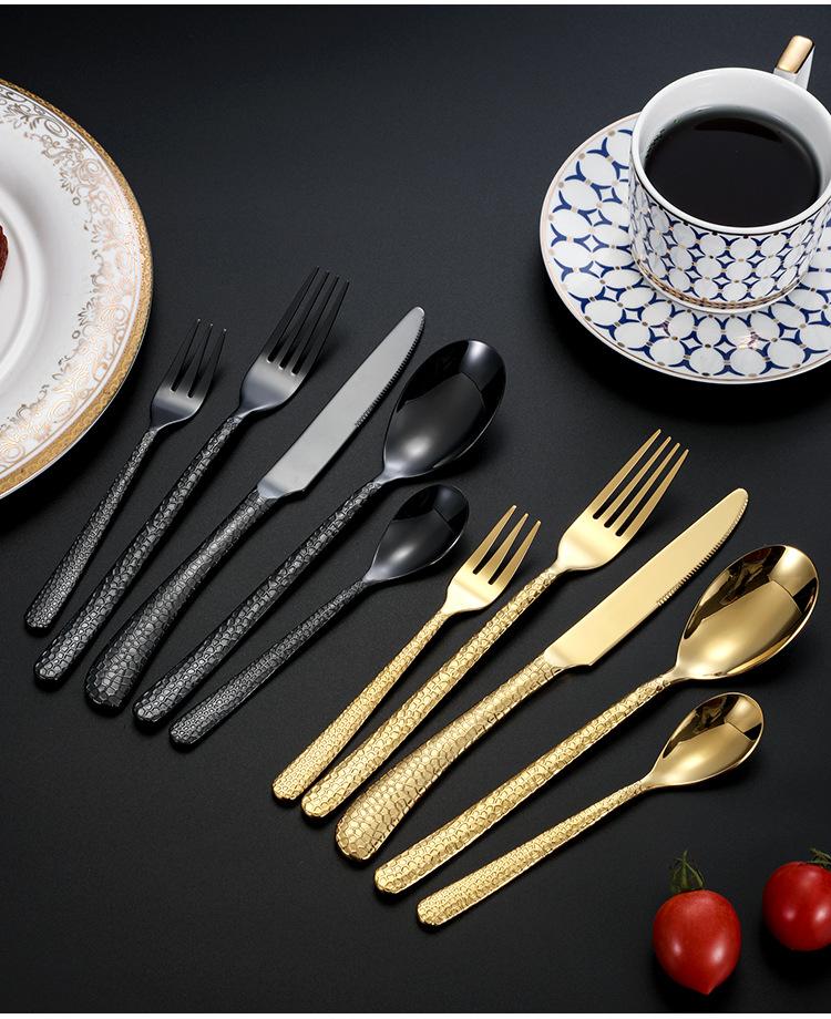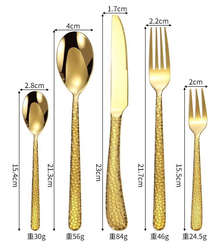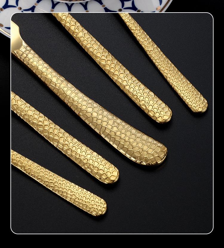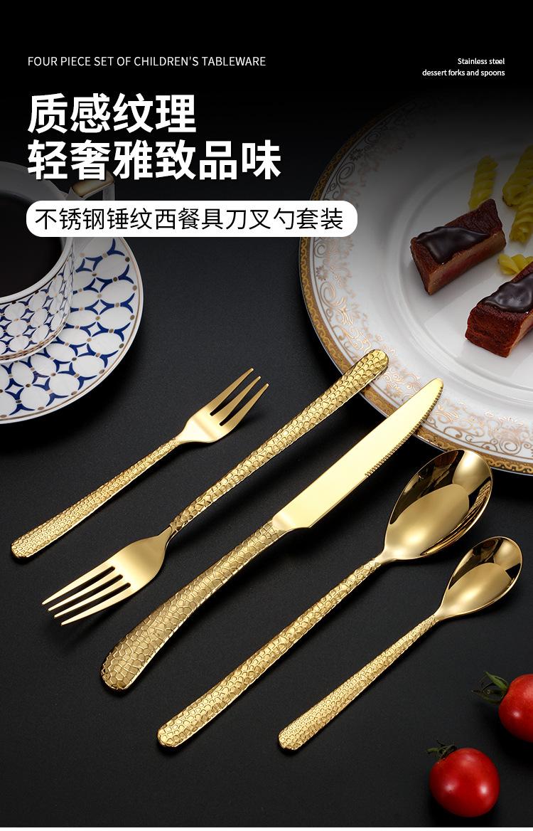 Juego de cinco piezas de cuchillo, tenedor y cuchara de vajilla occidental de estilo europeo con escala de acero inoxidable, patrón de martillo chapado en oro, cuchillo para carne engrosado, tenedor y cuchara de postre.