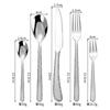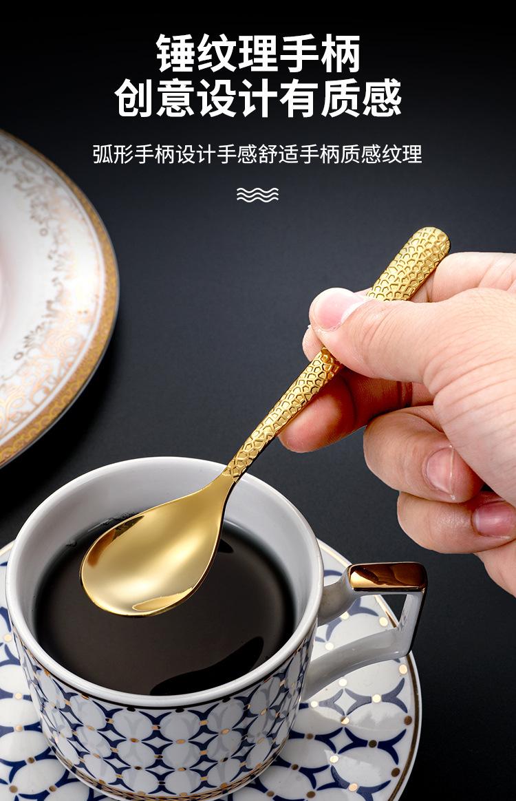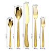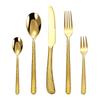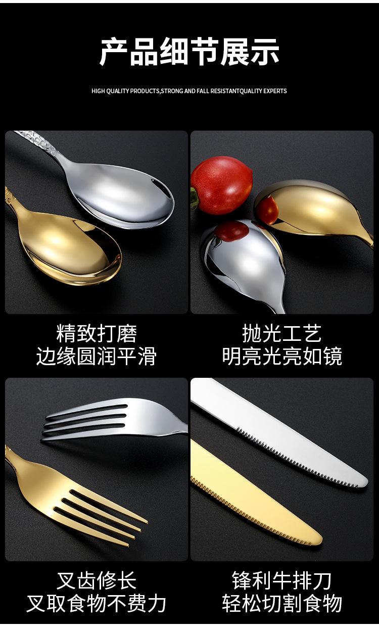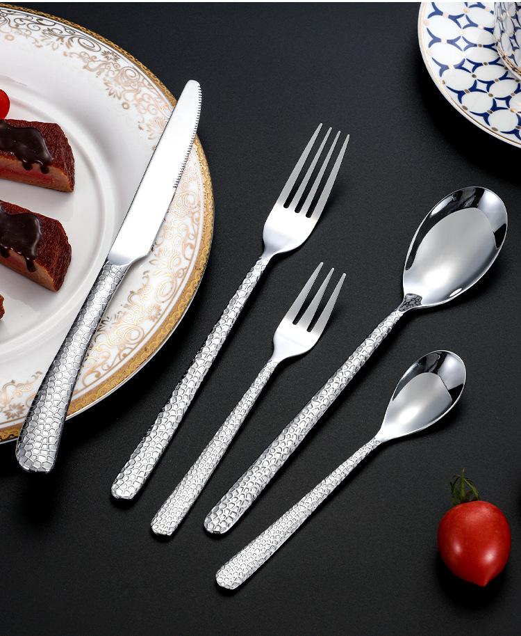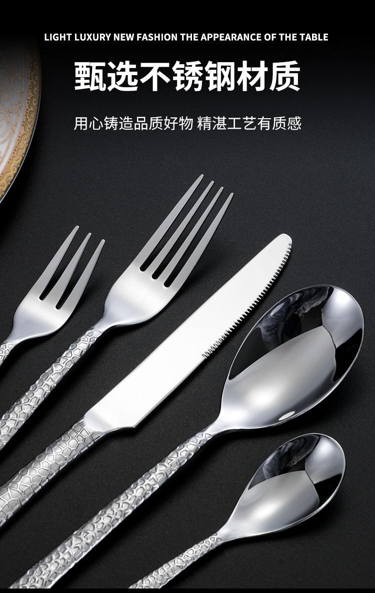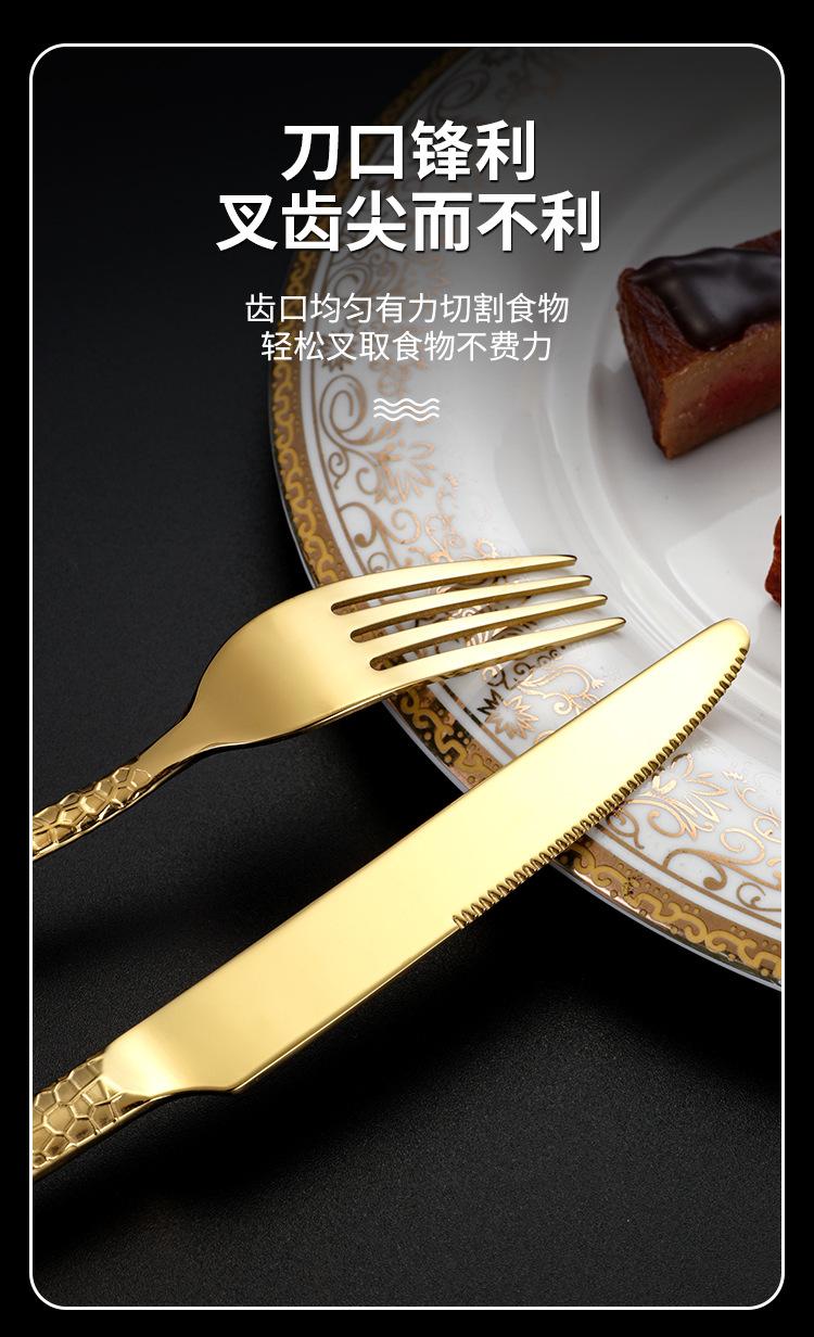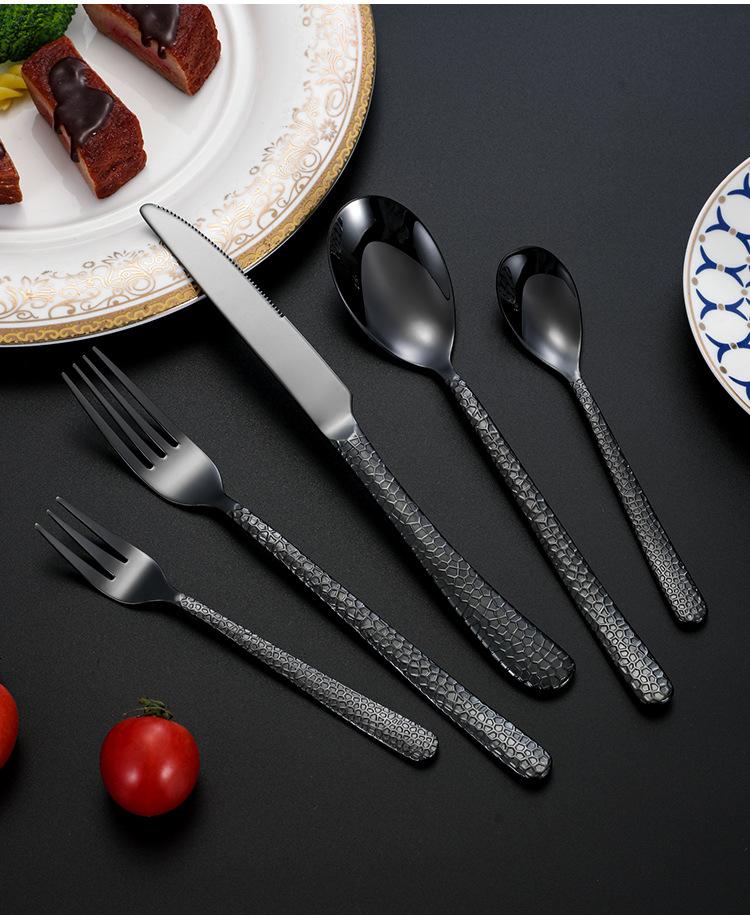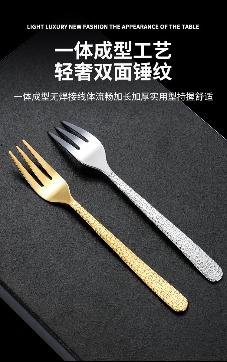 Juego de cinco piezas de cuchillo, tenedor y cuchara de vajilla occidental de estilo europeo con escala de acero inoxidable, patrón de martillo chapado en oro, cuchillo para carne engrosado, tenedor y cuchara de postre.