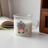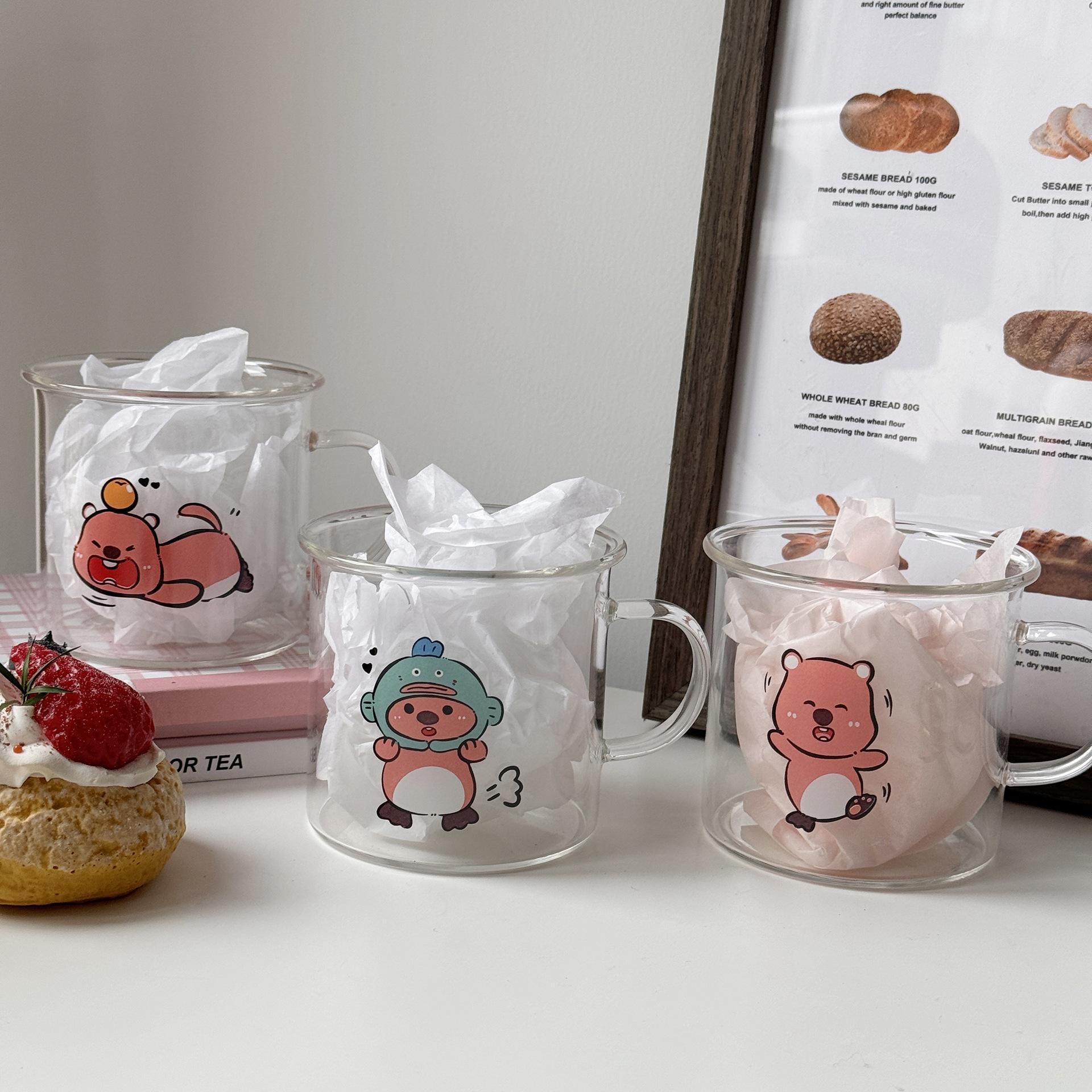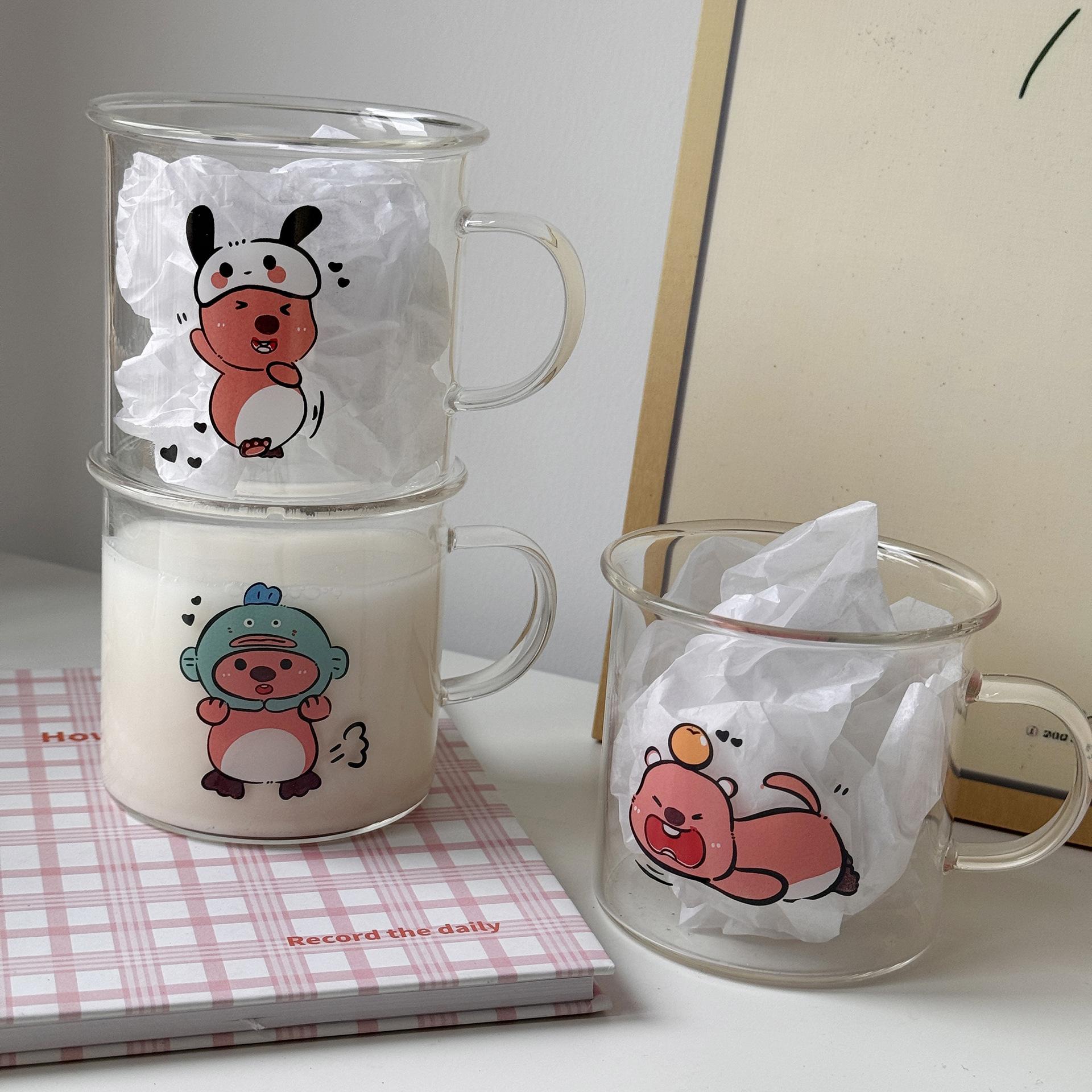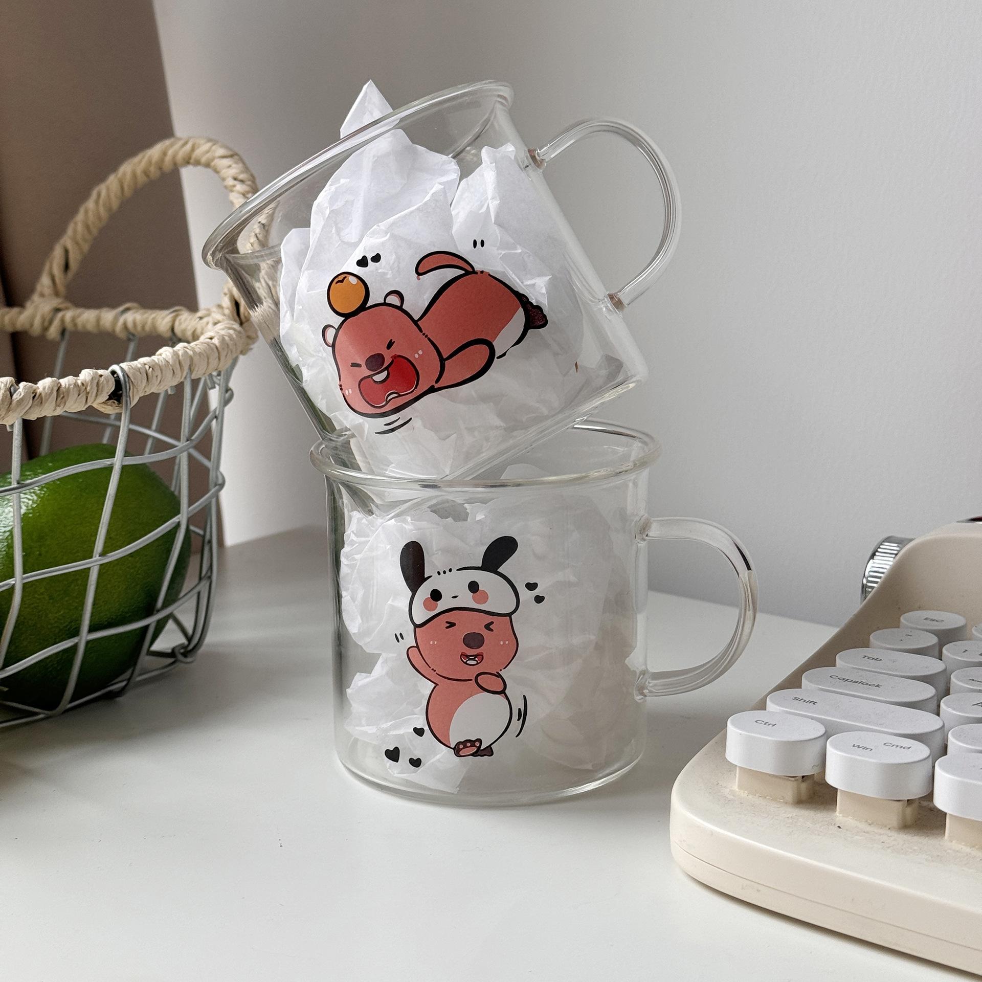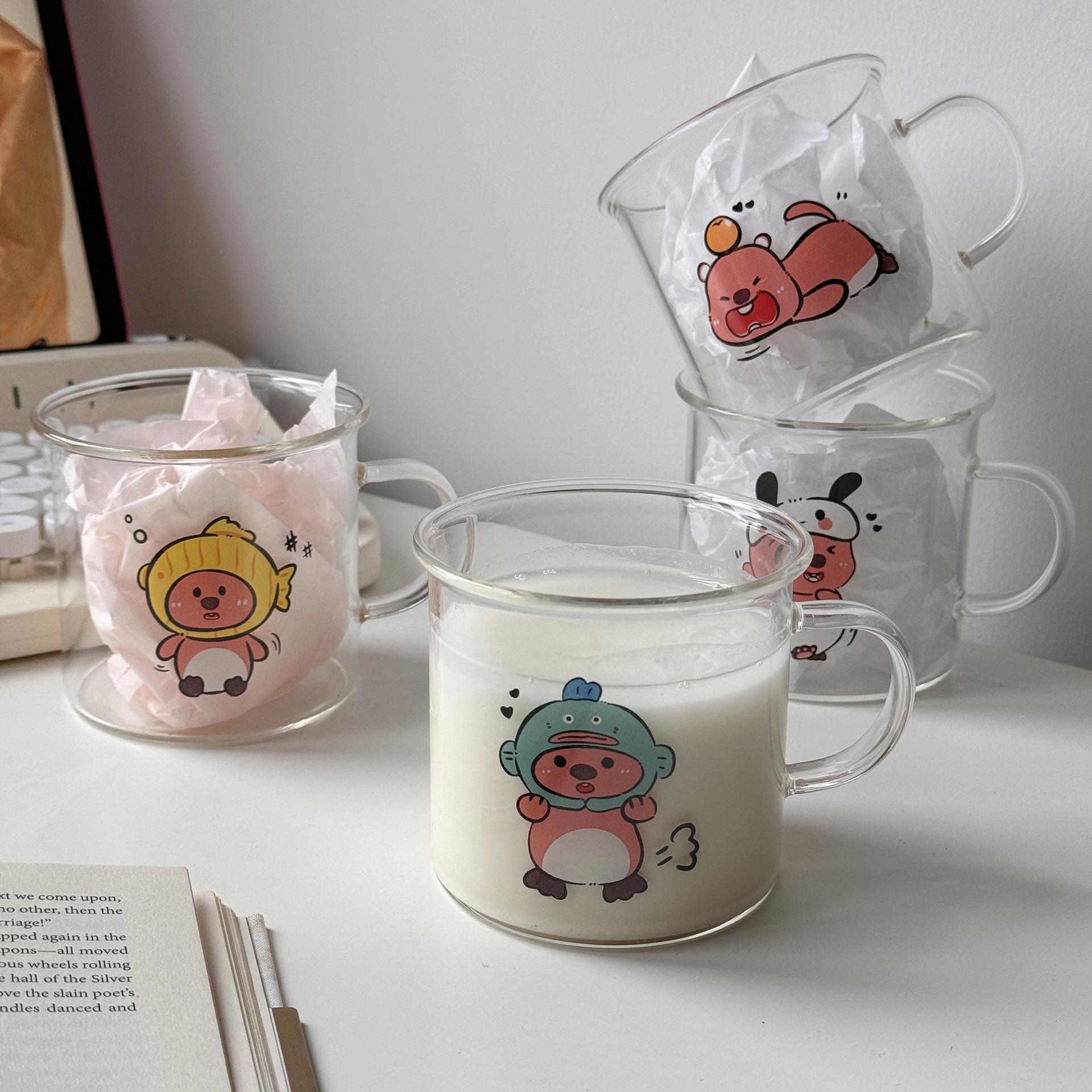Bonita taza de café resistente al calor con forma de bucle, taza de vidrio, taza de agua, taza de leche para desayuno, taza de vidrio con impresión de dibujos animados con asa