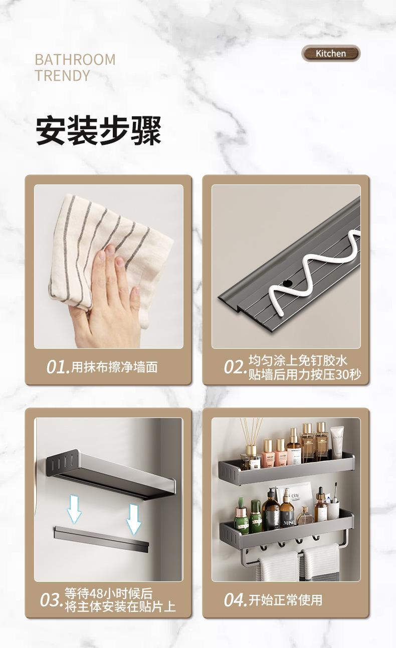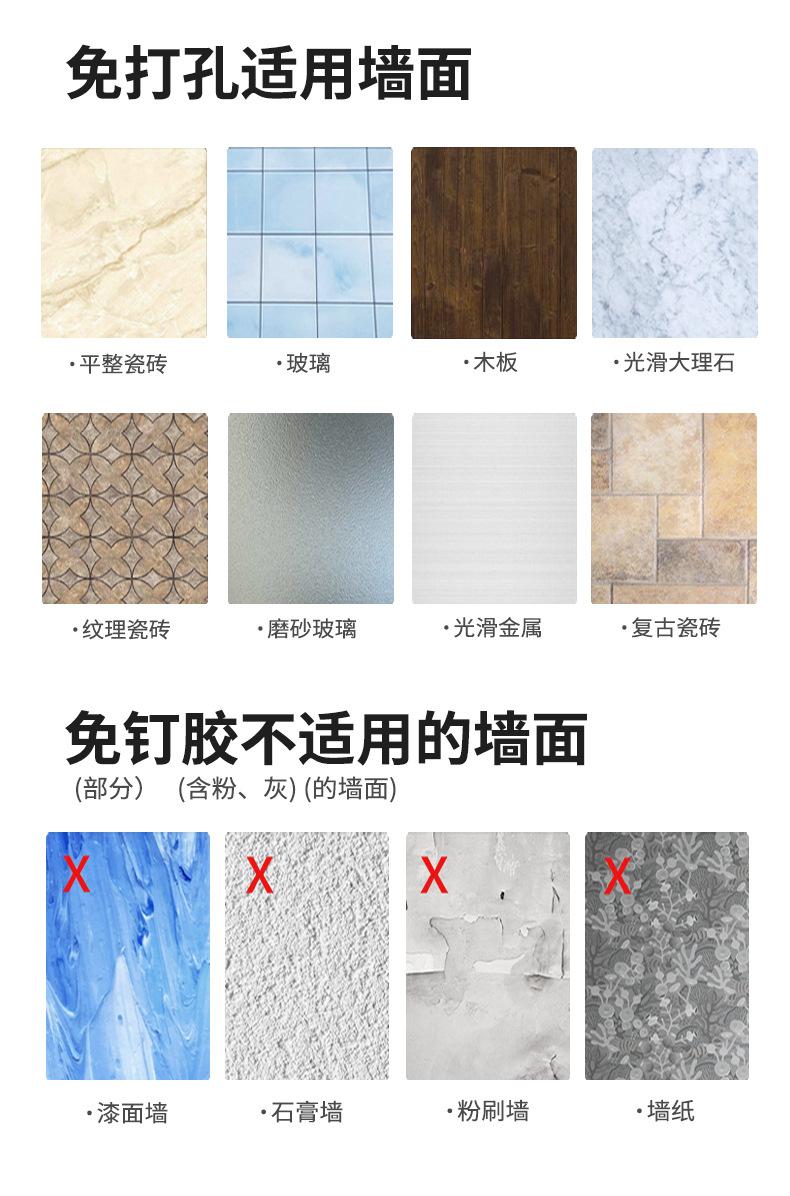 (2) Tenga en cuenta que la superficie de la pared debe ser plana y sólida, como baldosas de vidrio.No disponible enEn paredes irregulares e inestables como paredes pintadas, papel tapiz, paredes de cal, etc. Después de aplicar el pegamento en la pared, debe esperar de 3 a 5 días para que el pegamento sin clavos se seque completamente antes de usarlo.