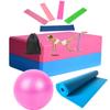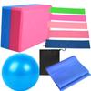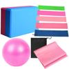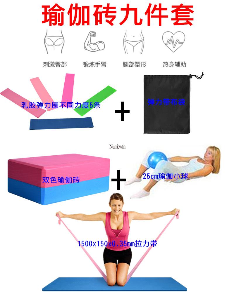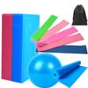 Un juego de nueve bloques de yoga bicolores (un bloque de yoga + 5 anillas de látex para piernas de diferentes grosores, una pequeña bolsa de tela + una pelota de yoga de 25 cm con tapón de aire y pajita + correa de tensión de 1500 x 150 x 0,35 mm) pesa aproximadamente 380 g y mide aproximadamente 26 x 20 x 10 cm. El juego completo se presenta en una bolsa de polipropileno y está disponible en azul y rosa.