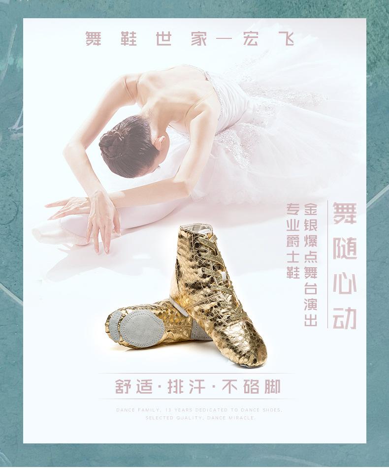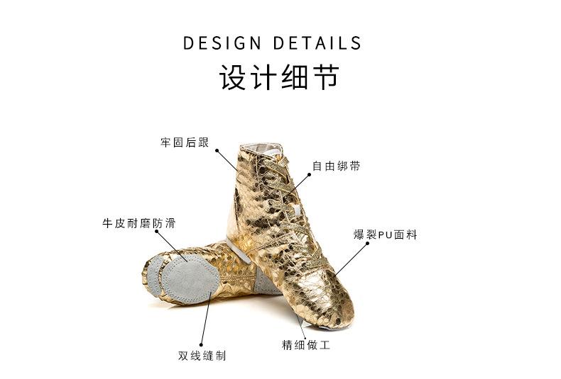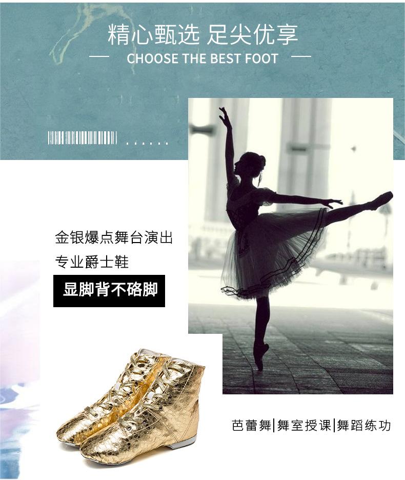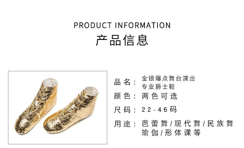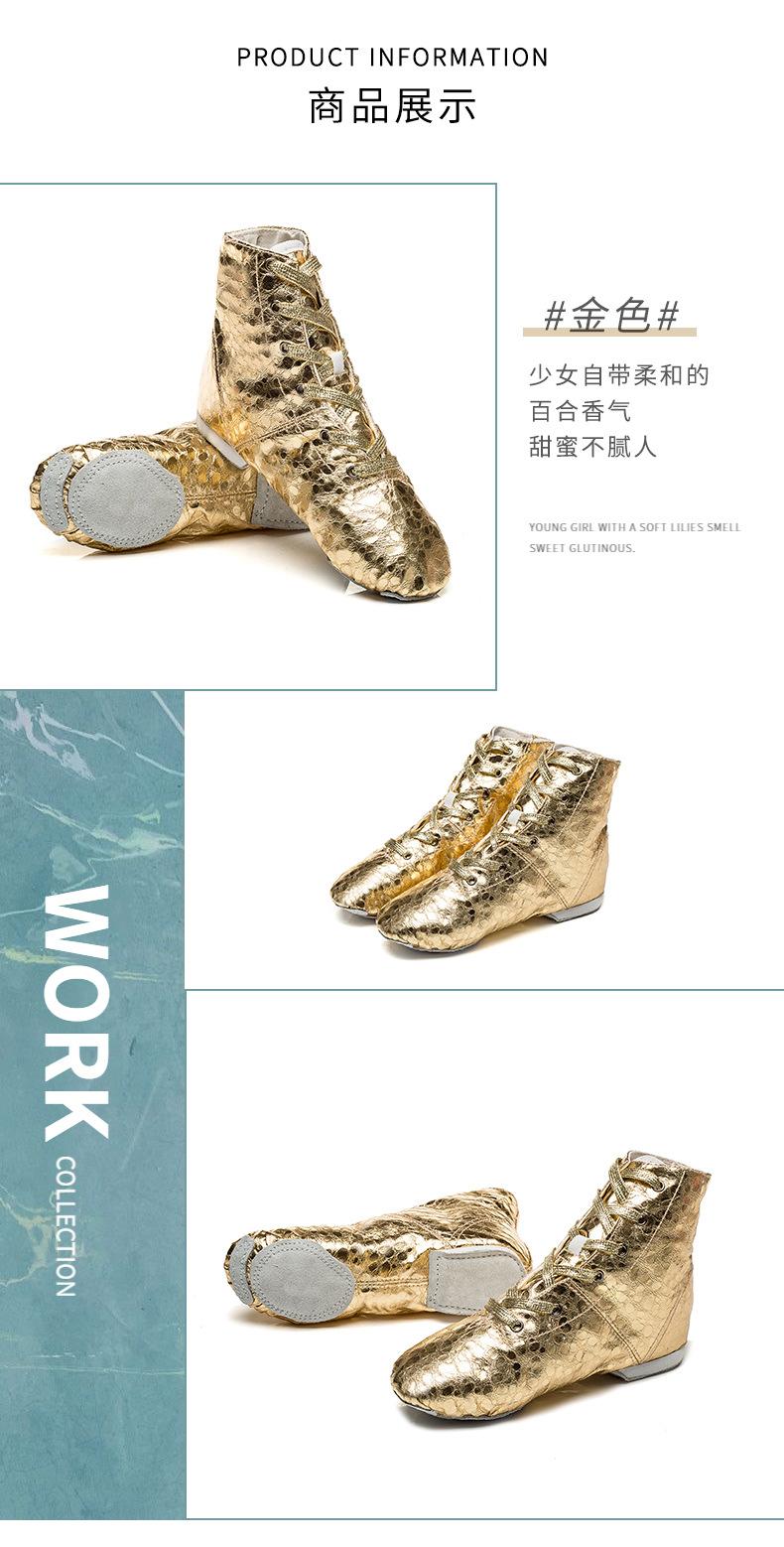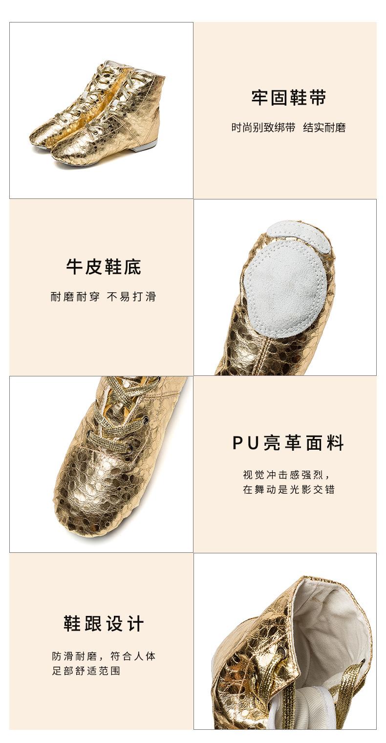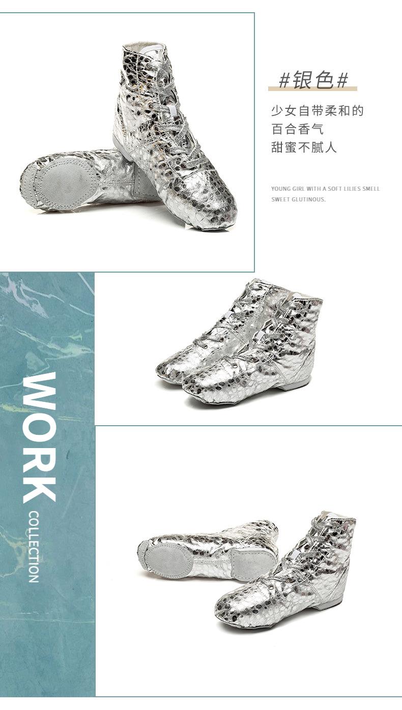 | |  | | Venta al por mayor de zapatos de baile de jazz de caña alta, dorados y plateados, con punta explosiva, zapatos de entrenamiento, zapatos de ballet, botas de jazz de alto rendimiento de PU. ¥35 |  |