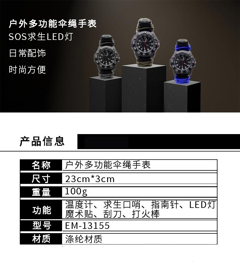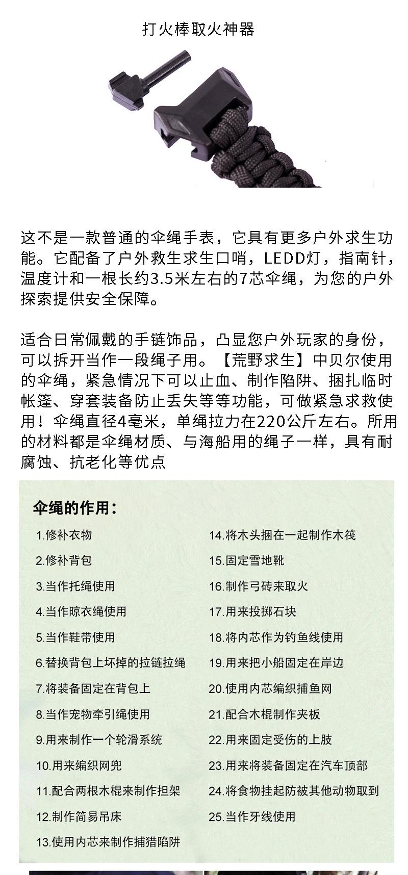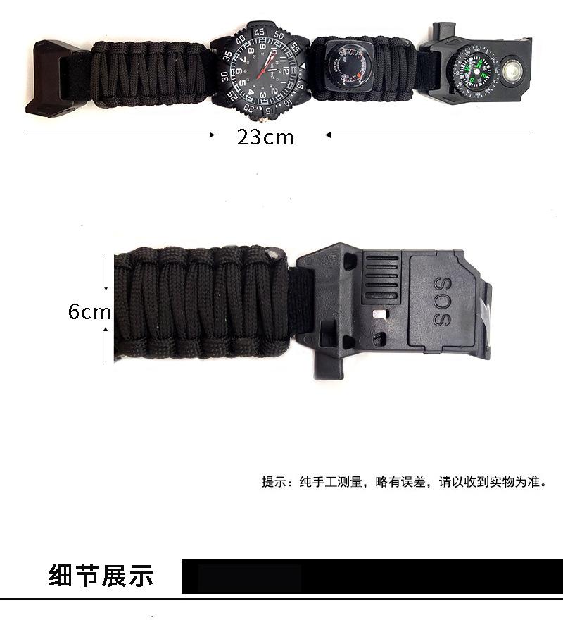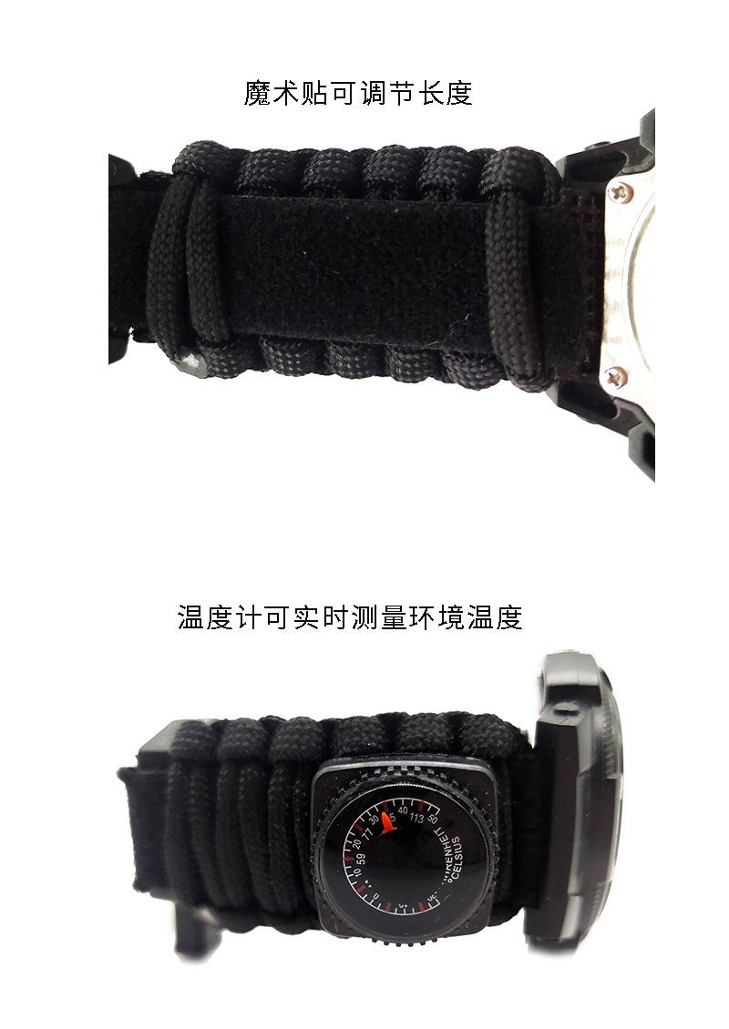 Componentes del producto: brújula, cabeza de reloj, cuerda de paracaídas de nailon, etc.