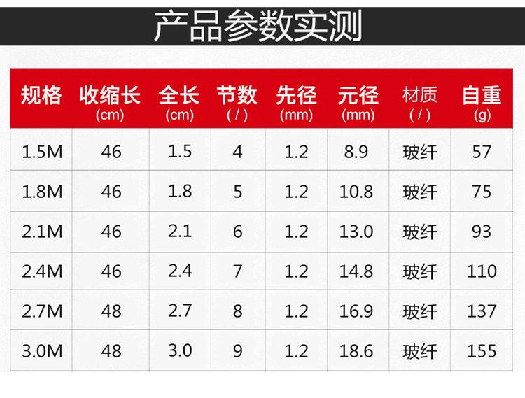 1.8 m, 2.1 m, 2.4 m, 2.7 m, 3.0 m, 1.5 m, Spinning wheel for 13-axis 2000 fishing