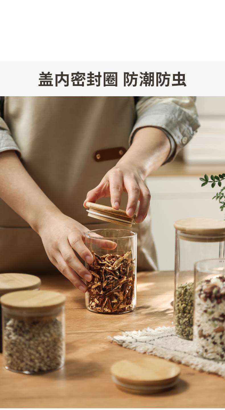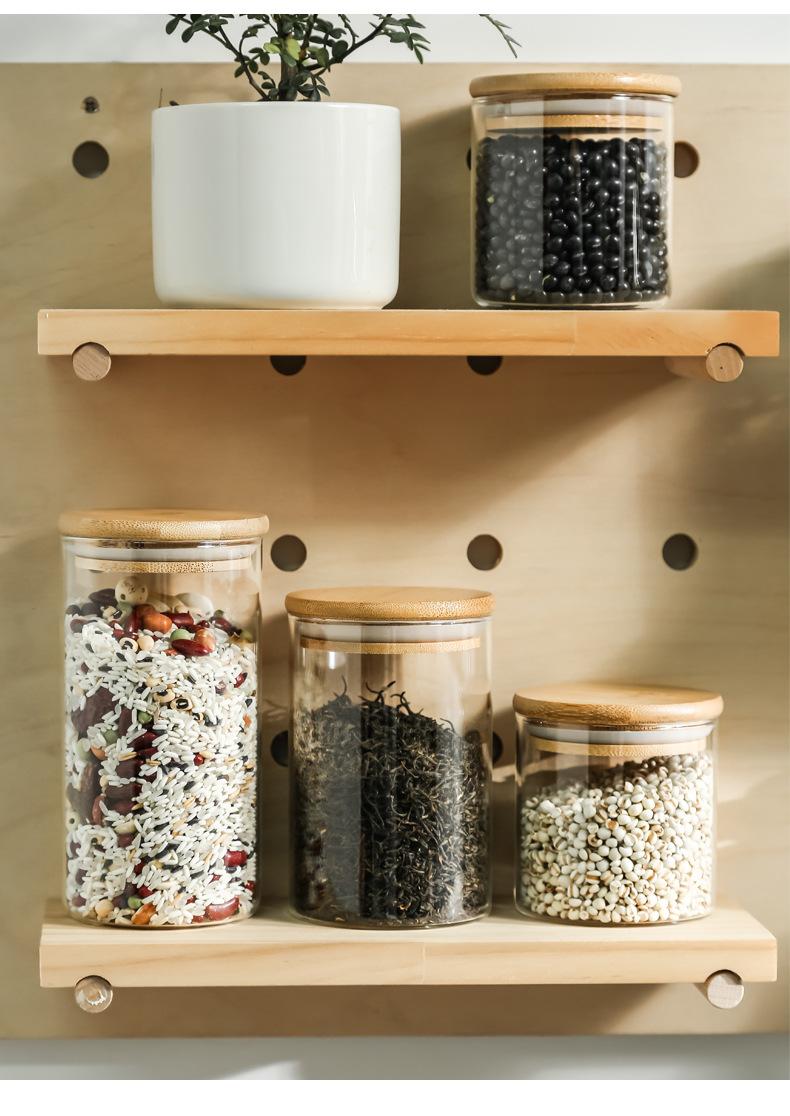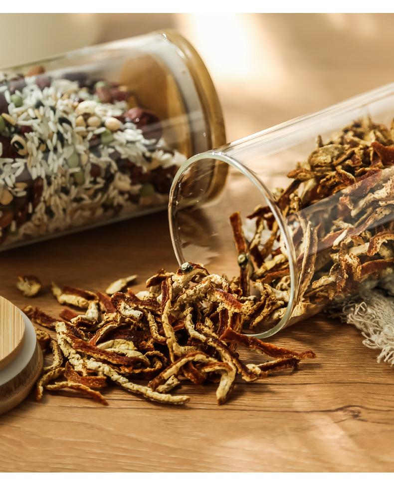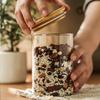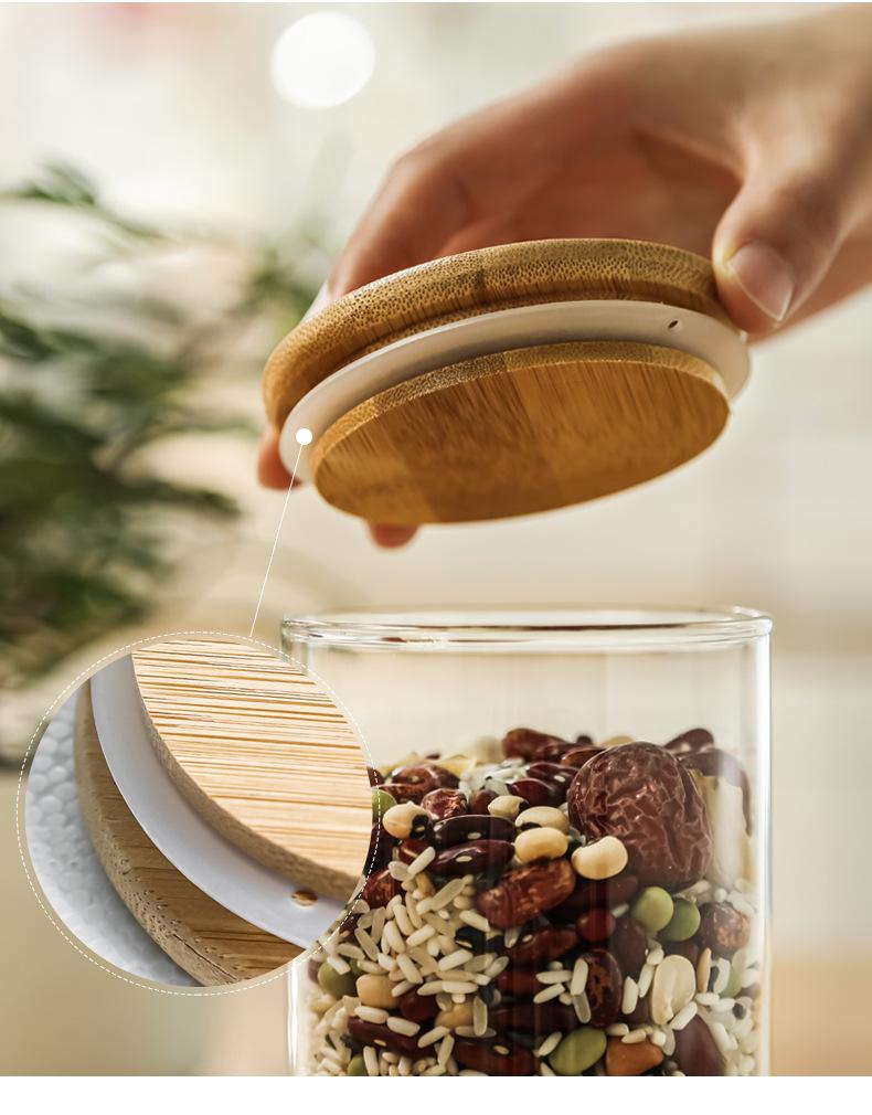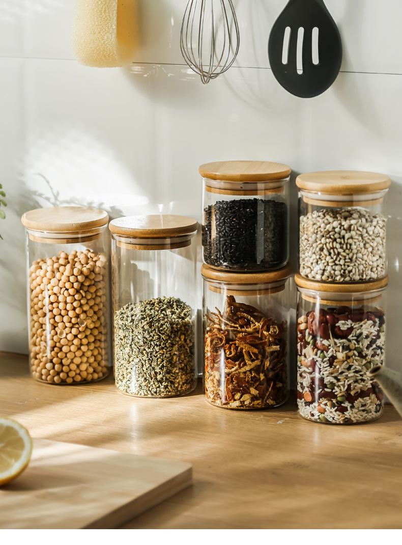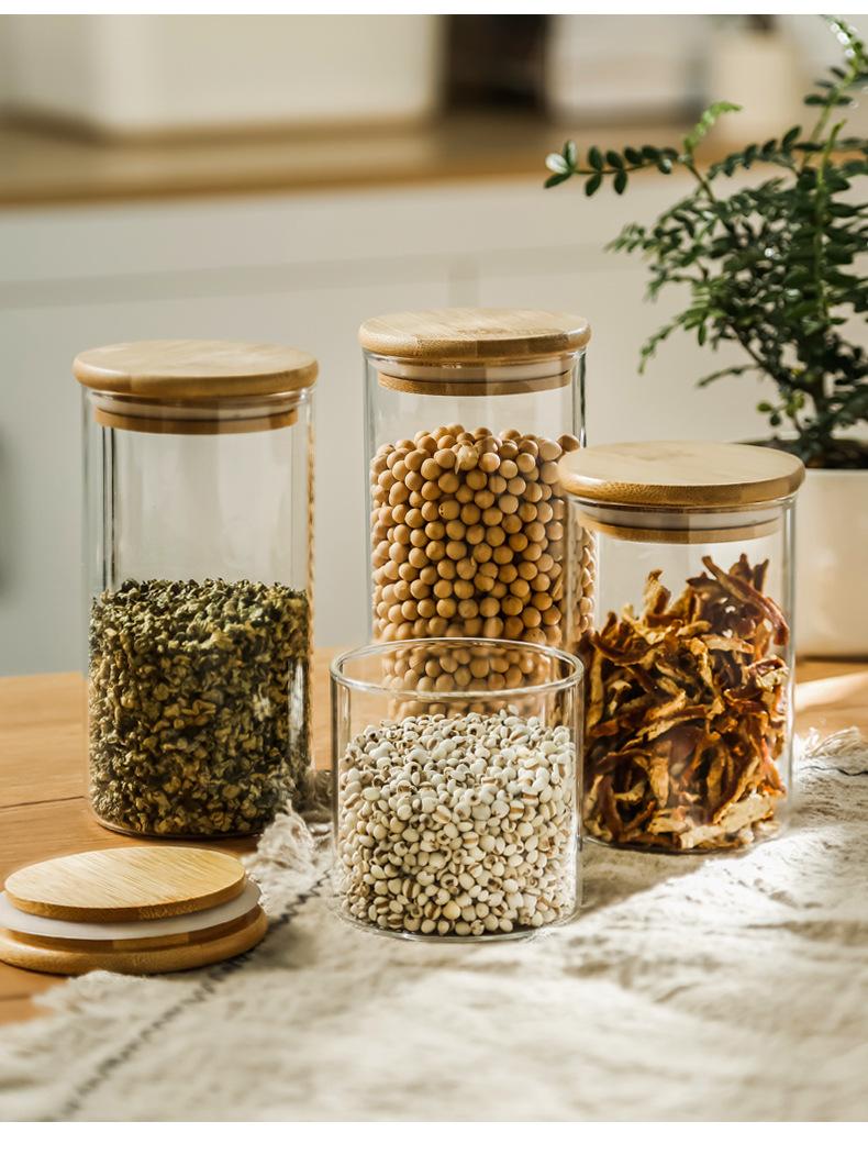 Frasco de vidrio sellado con tapa, apto para uso alimentario, para almacenar granos, té y frutos secos.