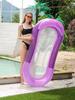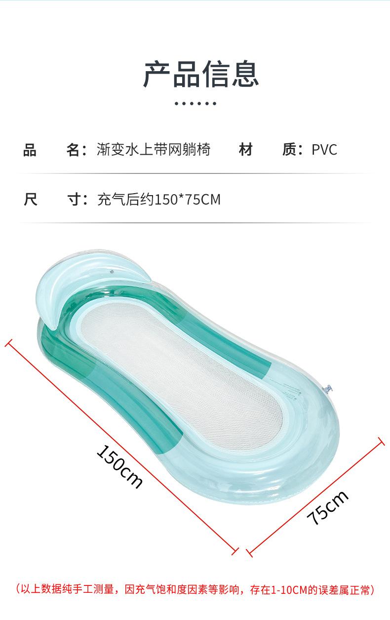 NOMBRE|Nombre: Sillón inflable de agua con color degradado TAMAÑO|Tamaño: 150*75CM EMBALAJE: Bolsa OPP PESO: Individual 0.465KG Caja completa 29KG TAMAÑO DEL PAQUETE|Tamaño del paquete individual: 23*21.5*5CM MATERIAL|Material: PVC + malla de nailonCOLOR|Color: morado, verde ESPECIFICACIÓN|Tamaño de la caja: 46*43*36CM CANTIDAD|Cantidad de embalaje: 60PCS