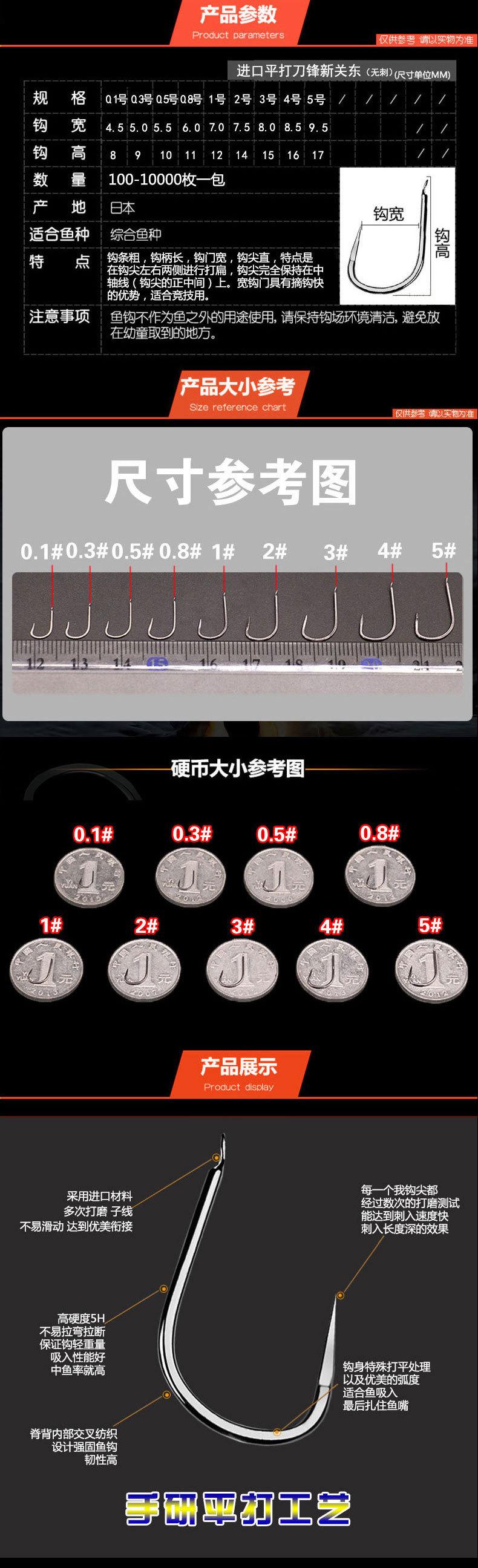 Los anzuelos se dividen en seis partes: mango, mango, parte inferior, extremo, punta y púa. La función del mango es evitar que la línea se salga. Existen diversas formas, como cabeza plana recta, cabeza plana lateral, cabeza con bucle y cabeza con púa. Siempre que sea moderada, no es necesario ser específico. El mango puede ser largo o corto. Los anzuelos de mango largo son adecuados para ensartar cebos largos como lombrices e insectos, mientras que los de mango corto son adecuados para ensartar cebos granulares pequeños como gluten y granos de arroz. El lomo puede ser redondo, plano, oblicuo, arqueado, etc. Desde un punto de vista mecánico, el anzuelo de lomo redondo soporta mayor tensión, mientras que el de lomo plano y oblicuo es peor. Si la rigidez es buena, el anzuelo de lomo arqueado se cae fácilmente después de engancharse. El lomo también tiene diferentes anchos. La distancia entre el mango y el extremo es el ancho del lomo. Si es demasiado estrecho, la boca del pez tendrá poca carne y este se soltará fácilmente; si es demasiado ancho, la tensión que soporta se reduce relativamente. El ancho ideal se basa en el tamaño del anzuelo, de modo que la punta, el lomo y el mango formen un círculo.