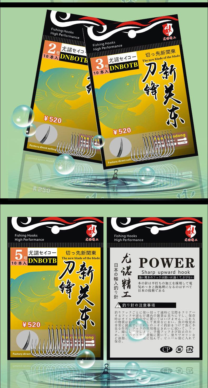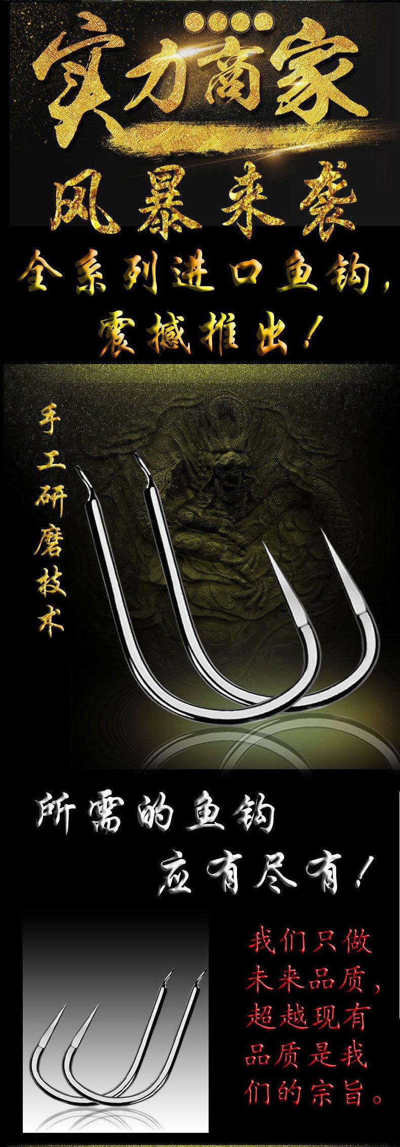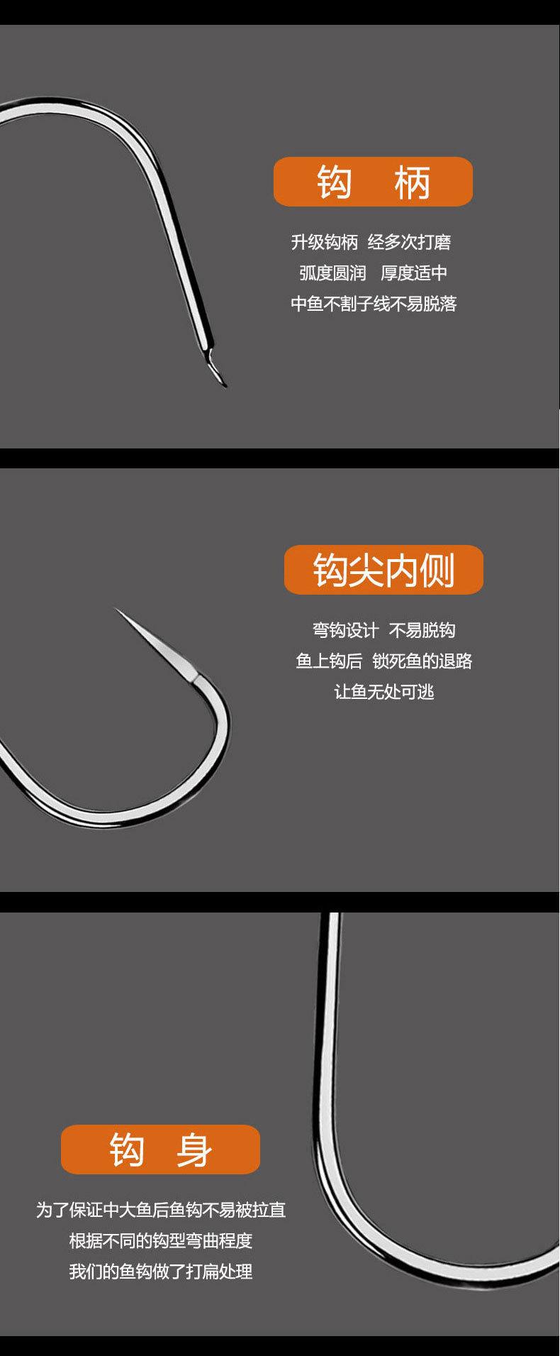 Manga: Este tipo de anzuelo no tiene púas. La punta es afilada, el mango es largo, el anzuelo es delgado y el cuerpo es ligero. Es adecuado para peces pequeños que se alimentan por succión. Es rápido de atrapar y de morder. Se utiliza principalmente para capturar carpas blancas, pequeños peces blancos, etc.