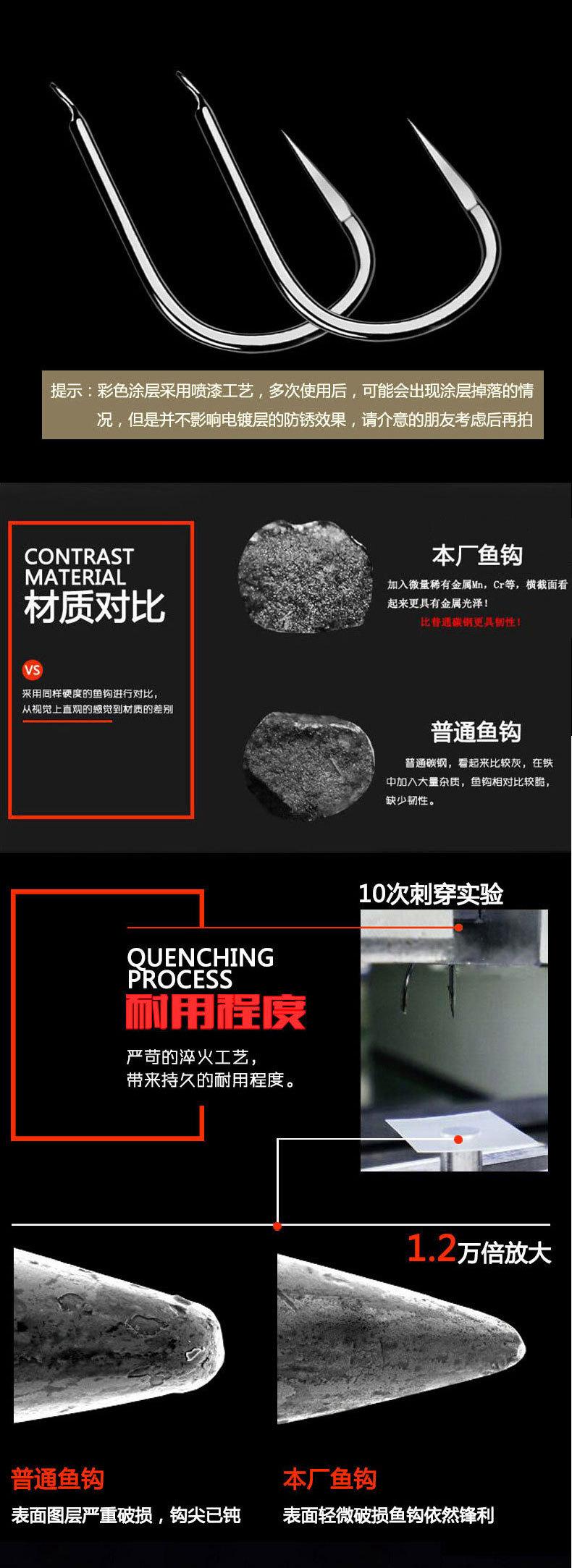 Los anzuelos vienen en diferentes tamaños, formas y grosores. El grosor del anzuelo está relacionado con su tamaño. Normalmente, el tamaño del anzuelo es proporcional a su grosor; es decir, cuanto mayor sea el tamaño, más grueso será y mayor será su resistencia a la tracción. Por el contrario, cuanto menor sea el tamaño del anzuelo, más delgado será y menor será su resistencia a la tracción. Sin embargo, no todos los anzuelos pequeños son delgados y tienen poca resistencia. Sabemos que la fuerza de tracción depende principalmente del material del anzuelo. Cuanto mejor sea la calidad del alambre de acero, mayor será la resistencia a la tracción. Además, un ángulo razonable y científico del anzuelo también puede mejorar su resistencia a la tracción. Tomemos como ejemplo el anzuelo Ise-ni. El grosor de la punta del anzuelo es diferente, lo que hace que el anzuelo grueso y el delgado tengan funciones diferentes. Los anzuelos gruesos se utilizan principalmente para capturar peces más grandes. Por ejemplo, los peces carnívoros feroces como la carpa negra, la carpa herbívora, la carpa común, la carpa plateada y la carpa cabezona en agua dulce, o el besugo negro y el besugo rojo en agua salada, tienden a ser agresivos y poderosos. Si se pescan con anzuelos delgados, es fácil que se enderecen, se rompan y el pez escape. El carpín y el pargo son cautelosos al alimentarse, son pequeños, se resisten poco y tienen bocas pequeñas. El uso de anzuelos delgados puede ser eficaz. Las ventajas de los anzuelos delgados son su buena ocultación, su gran capacidad de perforación y su pequeño tamaño. Pueden usarse para capturar peces astutos en estanques con resultados ideales. Las ventajas de los anzuelos gruesos son su alta resistencia a la tracción y su dificultad para soltarlos después de capturar el pez. La desventaja es su baja capacidad de perforación, lo que puede provocar que los peces se vuelvan cautelosos y afectar la tasa de picadura. No son adecuados para pescar peces más pequeños.