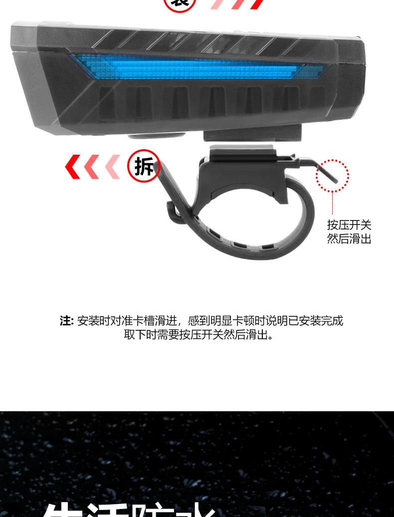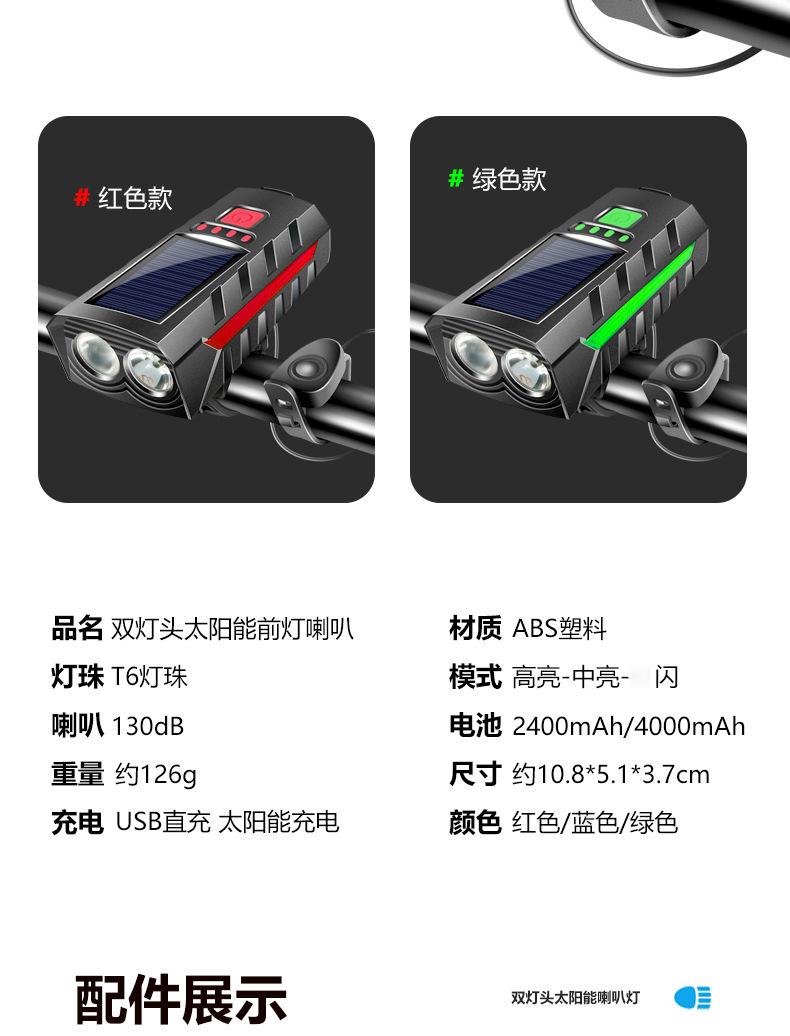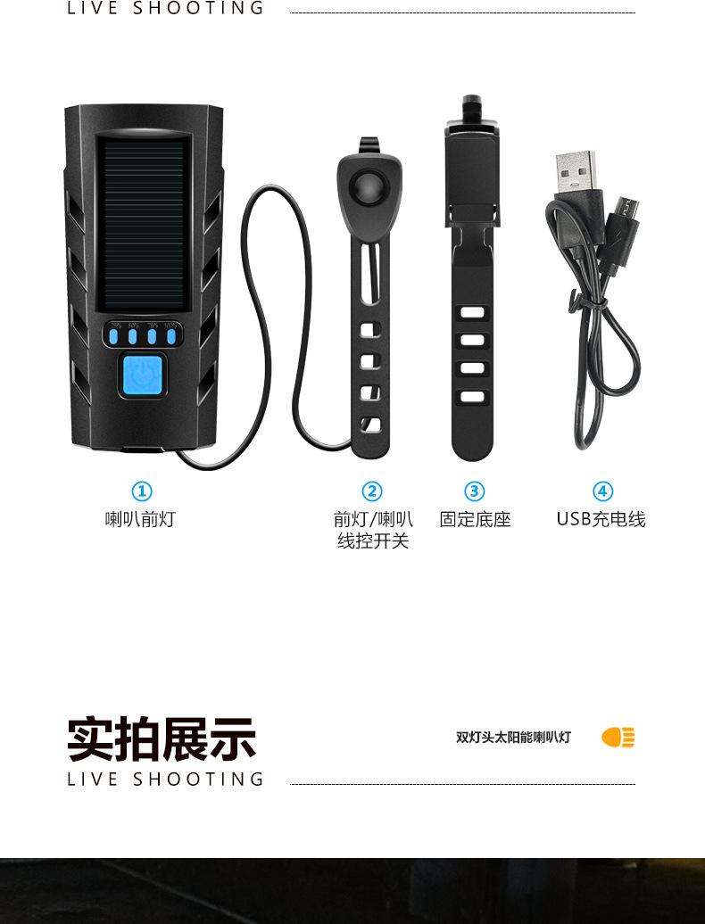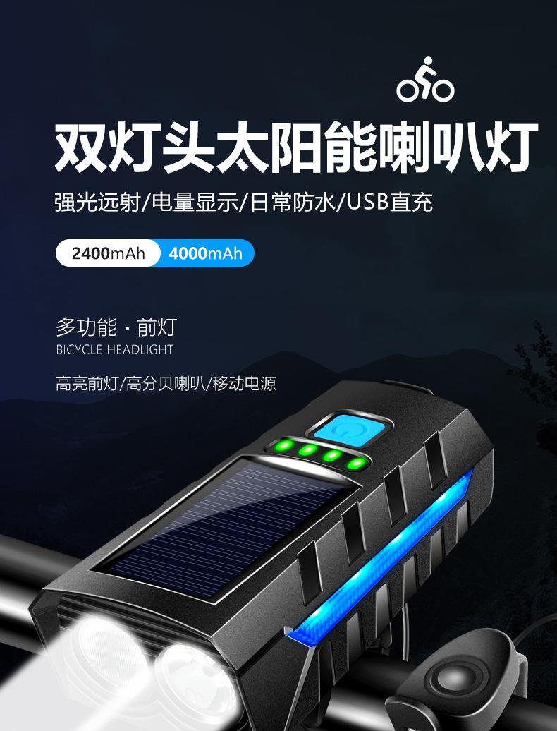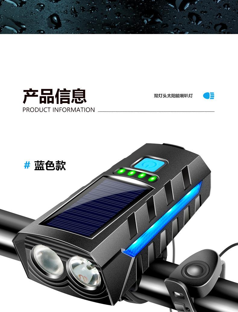 Nueva luz de bicicleta transfronteriza con bocina, luz dual, carga solar, linterna, equipo de iluminación para ciclismo nocturno