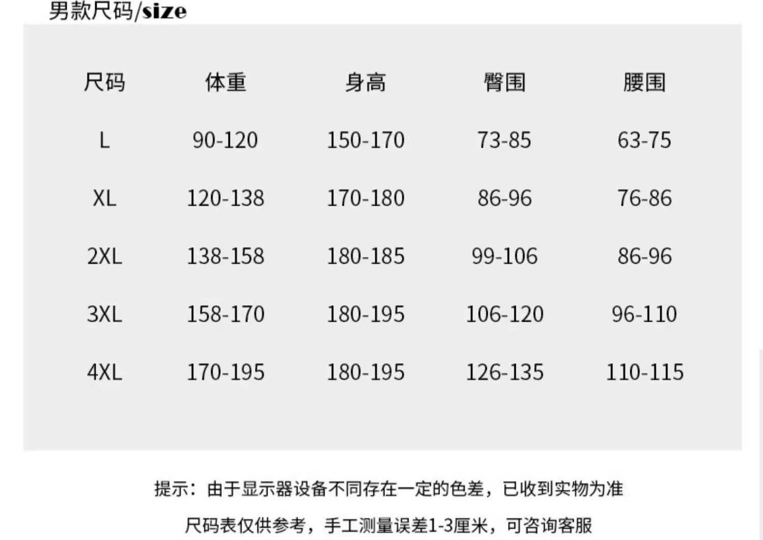 L (45.00 kg-60.00 kg, XL (60.00 kg-69.00 kg, 2X (69.00 kg-79.00 kg, 3XL (79.00 kg-85.00 kg, 4XL (85.00 kg-97.50 kg