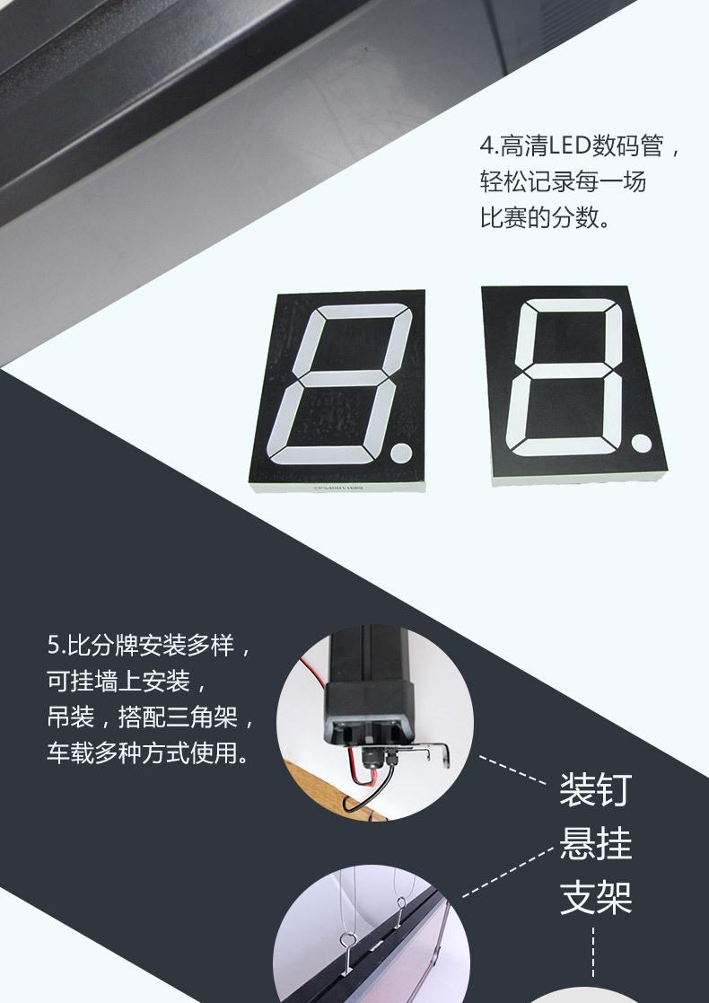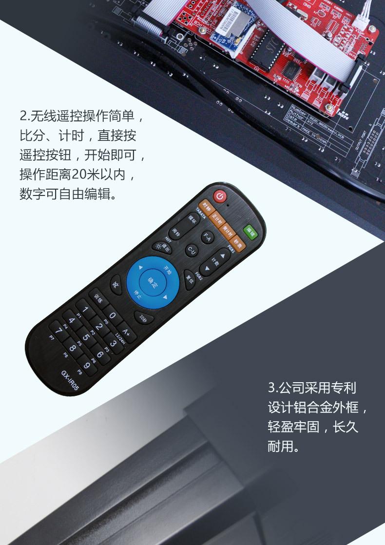Este producto utiliza un exquisito marco de aleación de aluminio, que es grueso y atmosférico, a prueba de golpes y resistente a las caídas; también utiliza tubos digitales LED para una clara visualización digital. Al mismo tiempo, este producto se controla mediante un control remoto, y no necesita preocuparse por el tradicional volteo del marcador.
