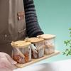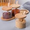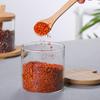 Tarro de condimentos de vidrio de borosilicato de alta calidad, tarro de condimentos de cocina con tapa de bambú y cuchara, tarro de condimentos Trinity Chili