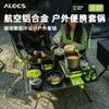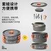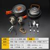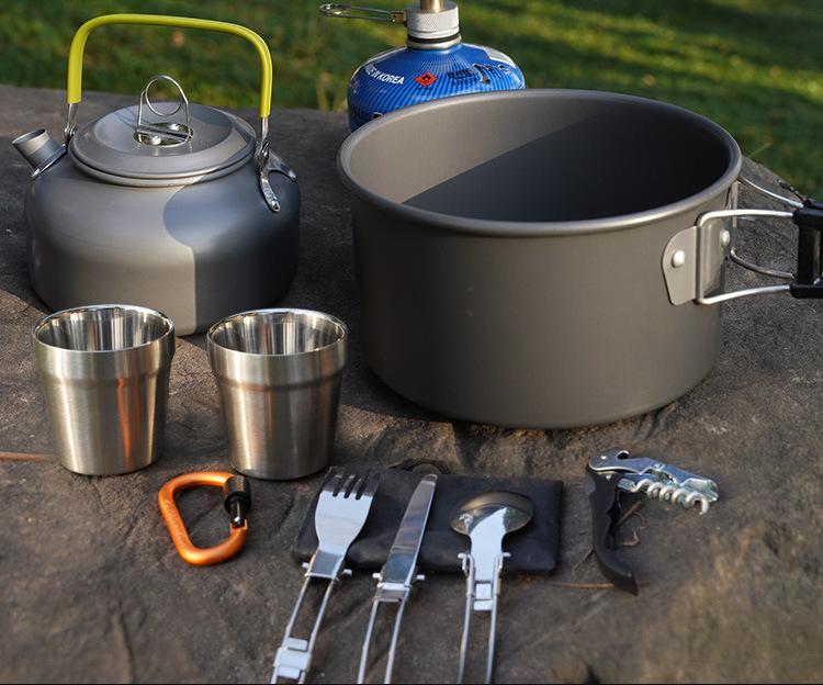 Lista: olla*1, tapa de olla*1, tetera*1, tapa de tetera*1, sartén*1, tazas*2, abridor de botellas*1, mosquetón en D*1, juego de cubiertos*1, bolsa de malla*1, caja de embalaje*1