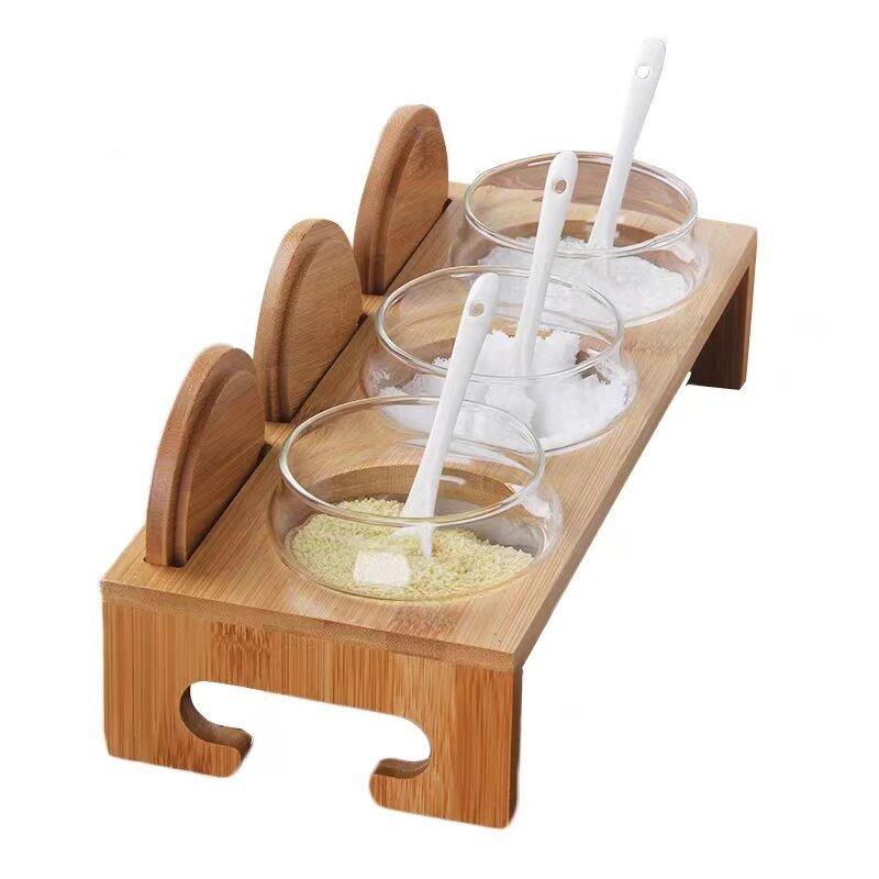 Suministros de cocina, tarro de condimento de vidrio de estilo japonés, botella de condimento, caja de condimento, botella de condimento, tarro de sal, tarro de azúcar, estante de madera de almacenamiento