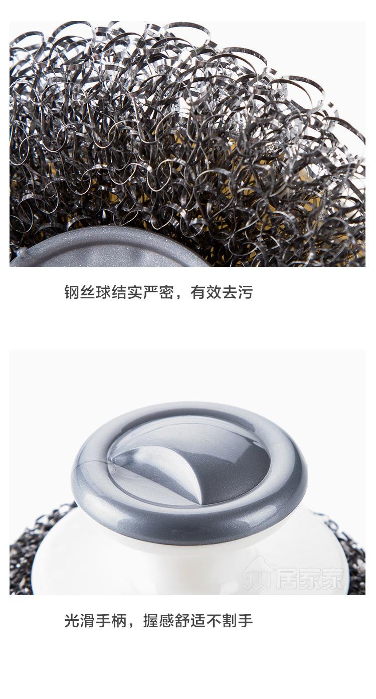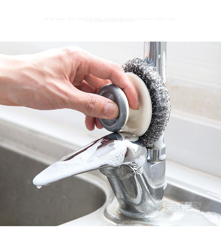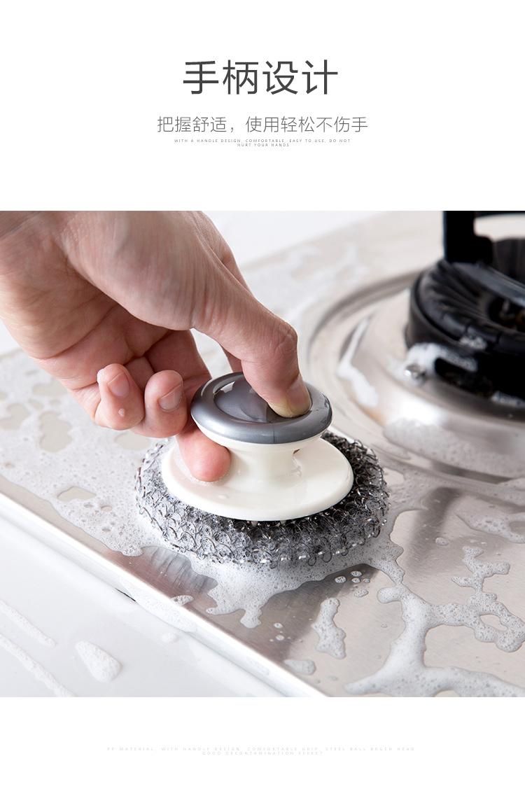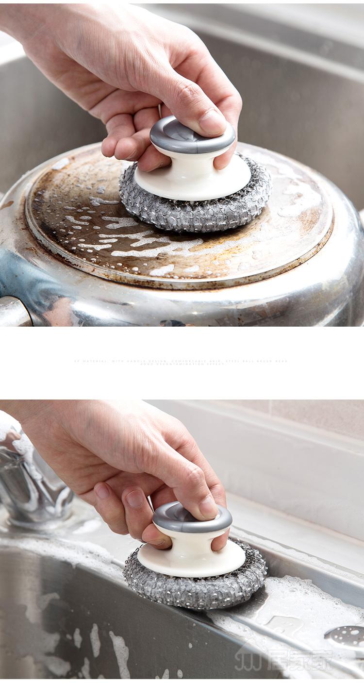 Hecho de material PP, con diseño de mango, cómodo de sostener, cabezal de cepillo de lana de acero, buen efecto descontaminante, conveniente para el uso diario para lavar ollas, lavar platos, limpiar estufas, haciendo su vida más conveniente