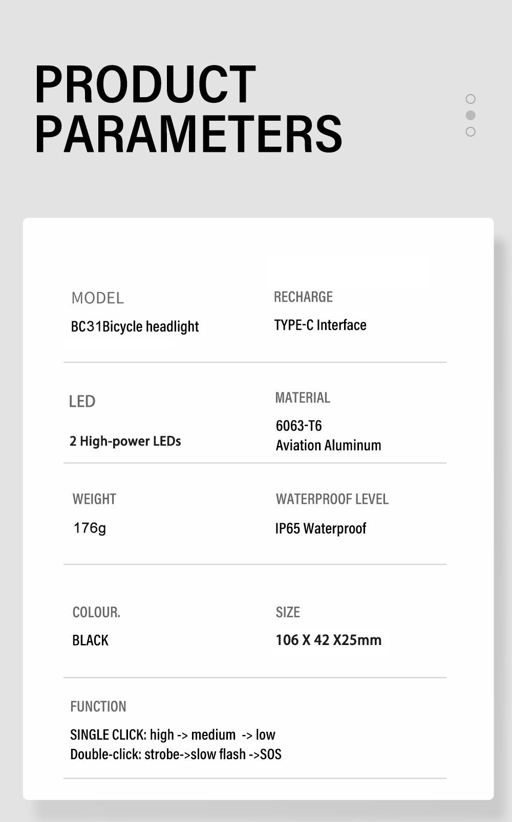Peso del paquete: Luz trasera BC31+T06: 308g (La luz trasera T06 es recargable, carga con cable Micro USB)