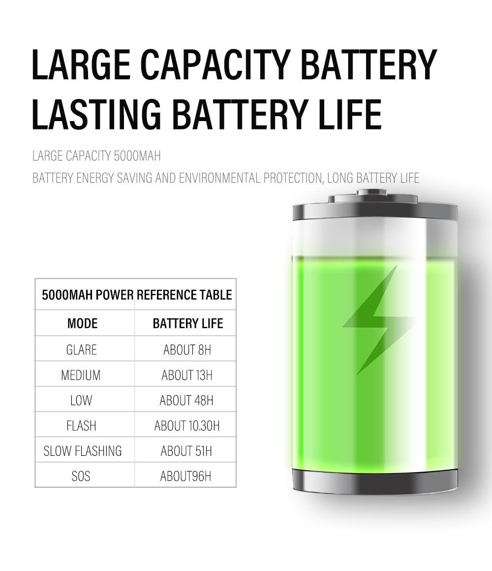 Tiempo de uso: luz fuerte 7.51h, luz media 12.23h, luz débil 48.04h; flash 10.27h, flash lento 50.45h, SOS 95.50h (los datos anteriores se obtienen mediante pruebas, los datos específicos están sujetos al uso real)