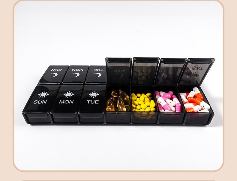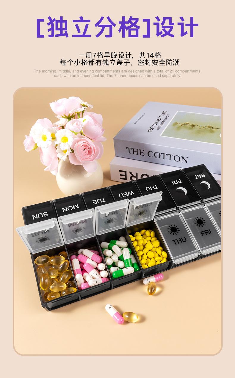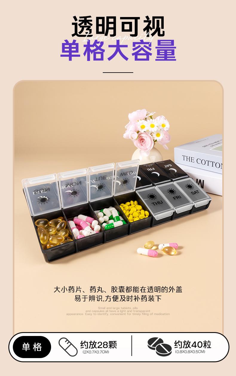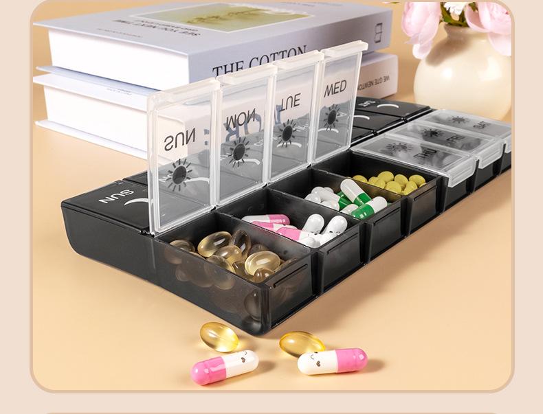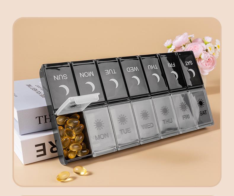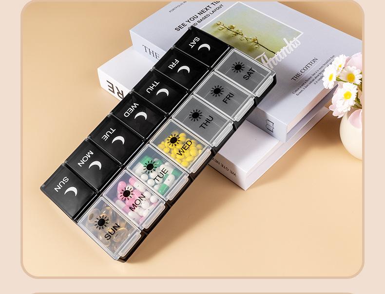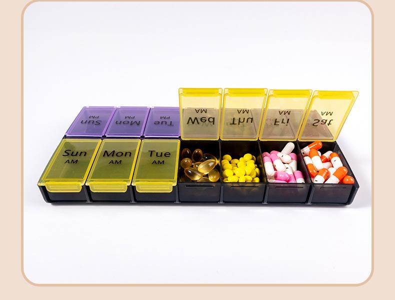Pastillero portátil de 14 compartimentos, Caja compacta para guardar pastillas, Almacenamiento multi-compartimento, Caja sellada para embalaje de pastillas y medicamentos
