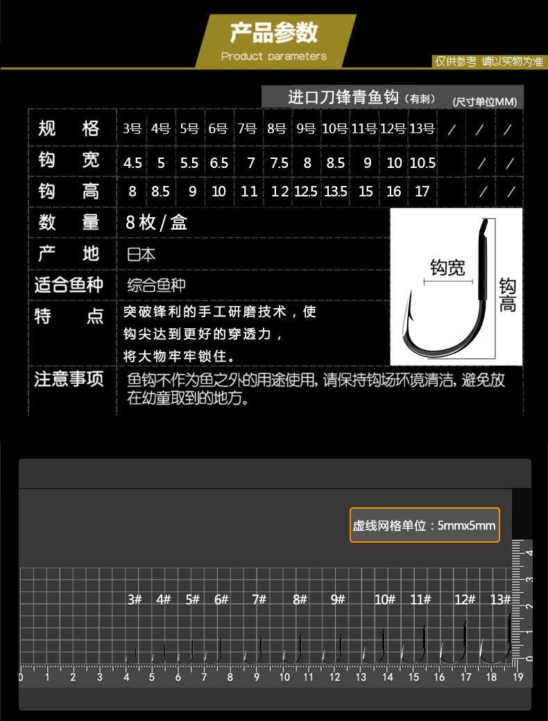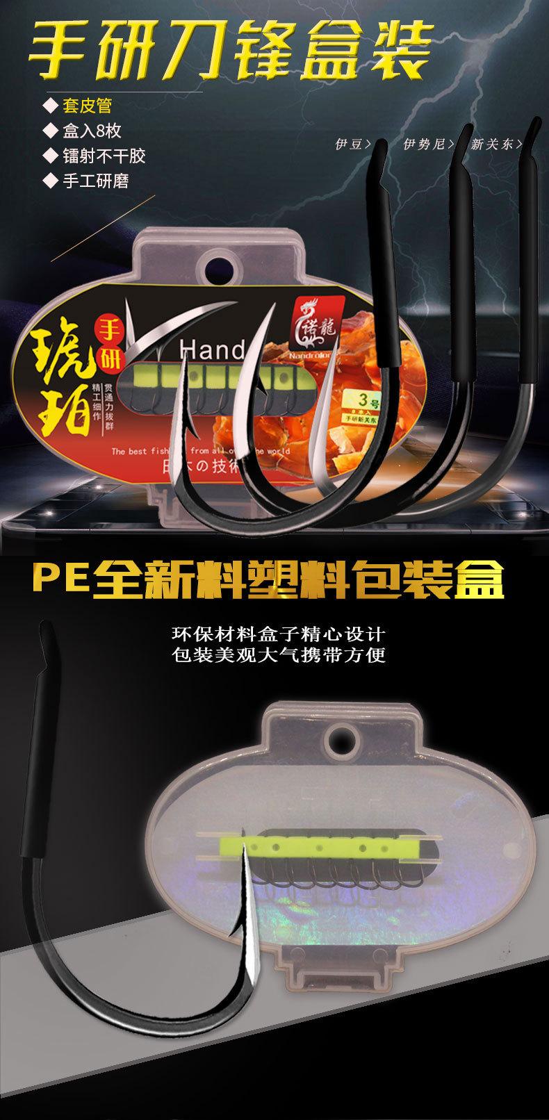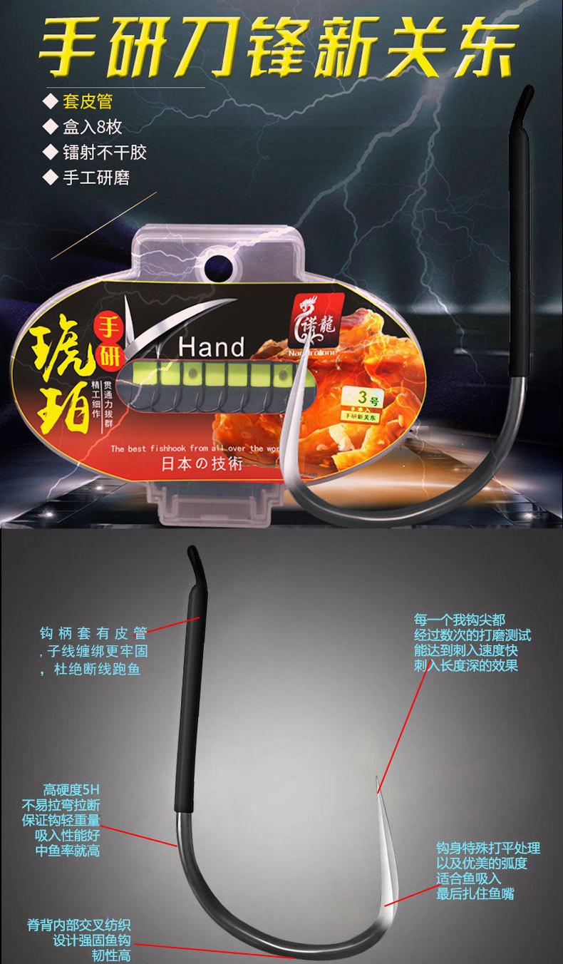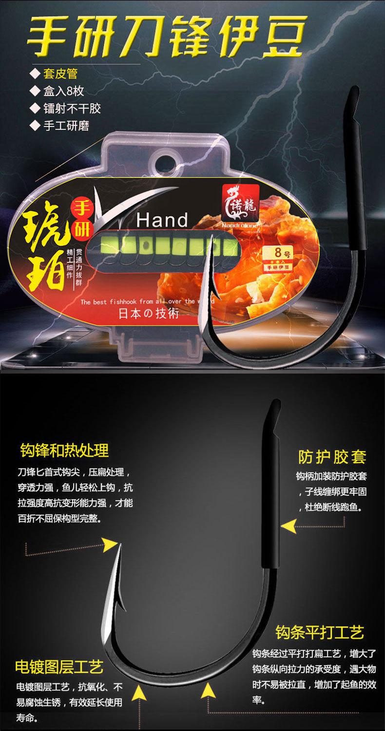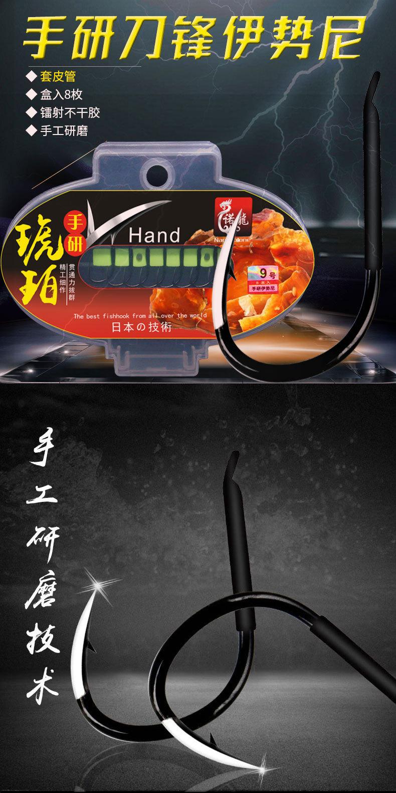 Manga: Este tipo de anzuelo no tiene púas. La punta es afilada, el mango es largo, el anzuelo es delgado y el cuerpo es ligero. Es adecuado para peces pequeños que se alimentan por succión. Es rápido de atrapar y de morder. Se utiliza principalmente para capturar carpas blancas, pequeños peces blancos, etc.