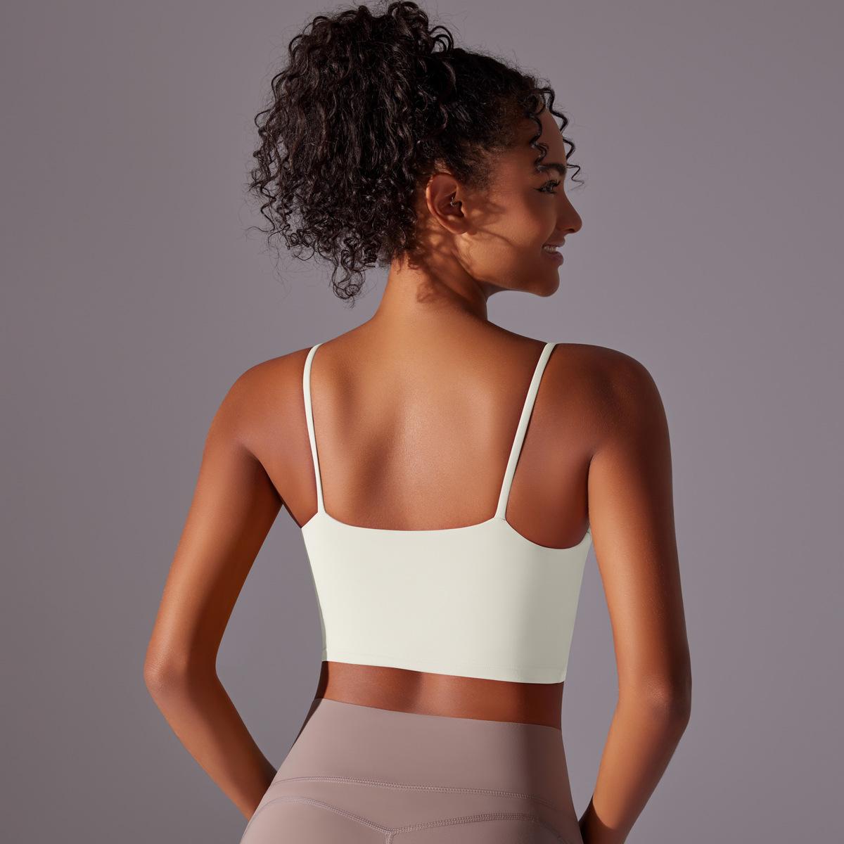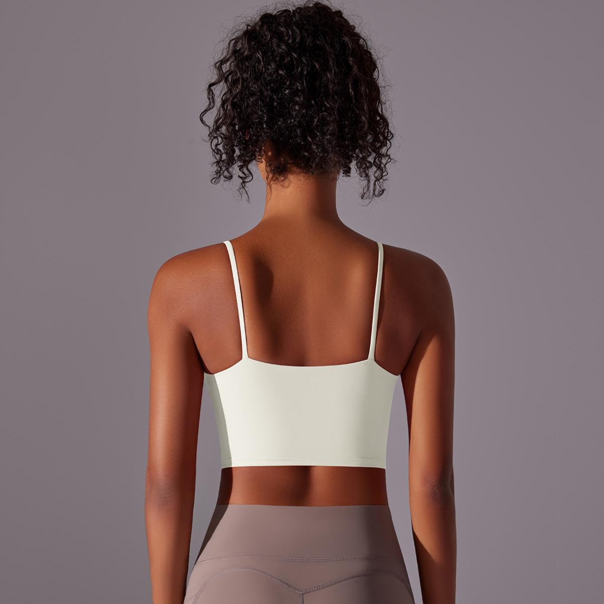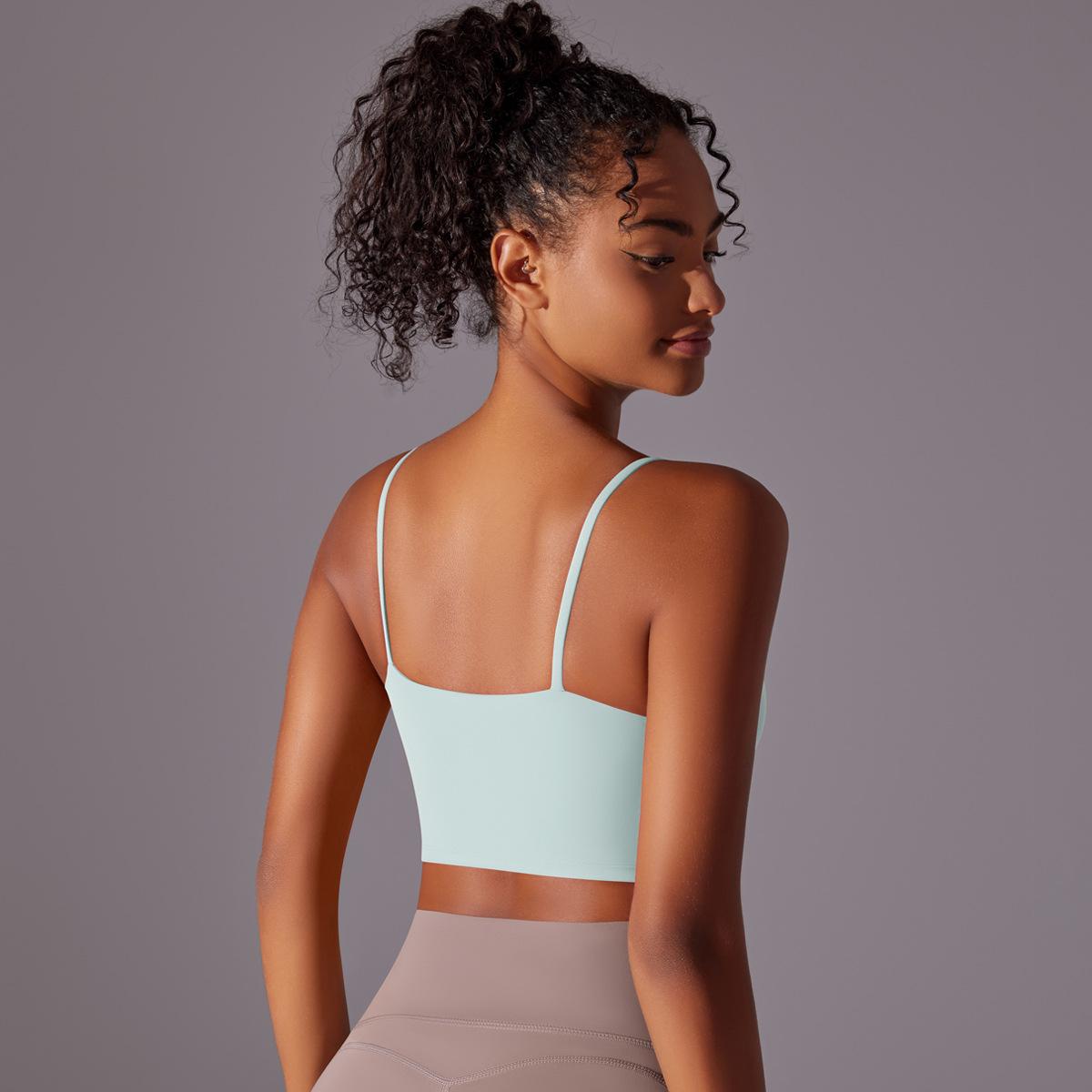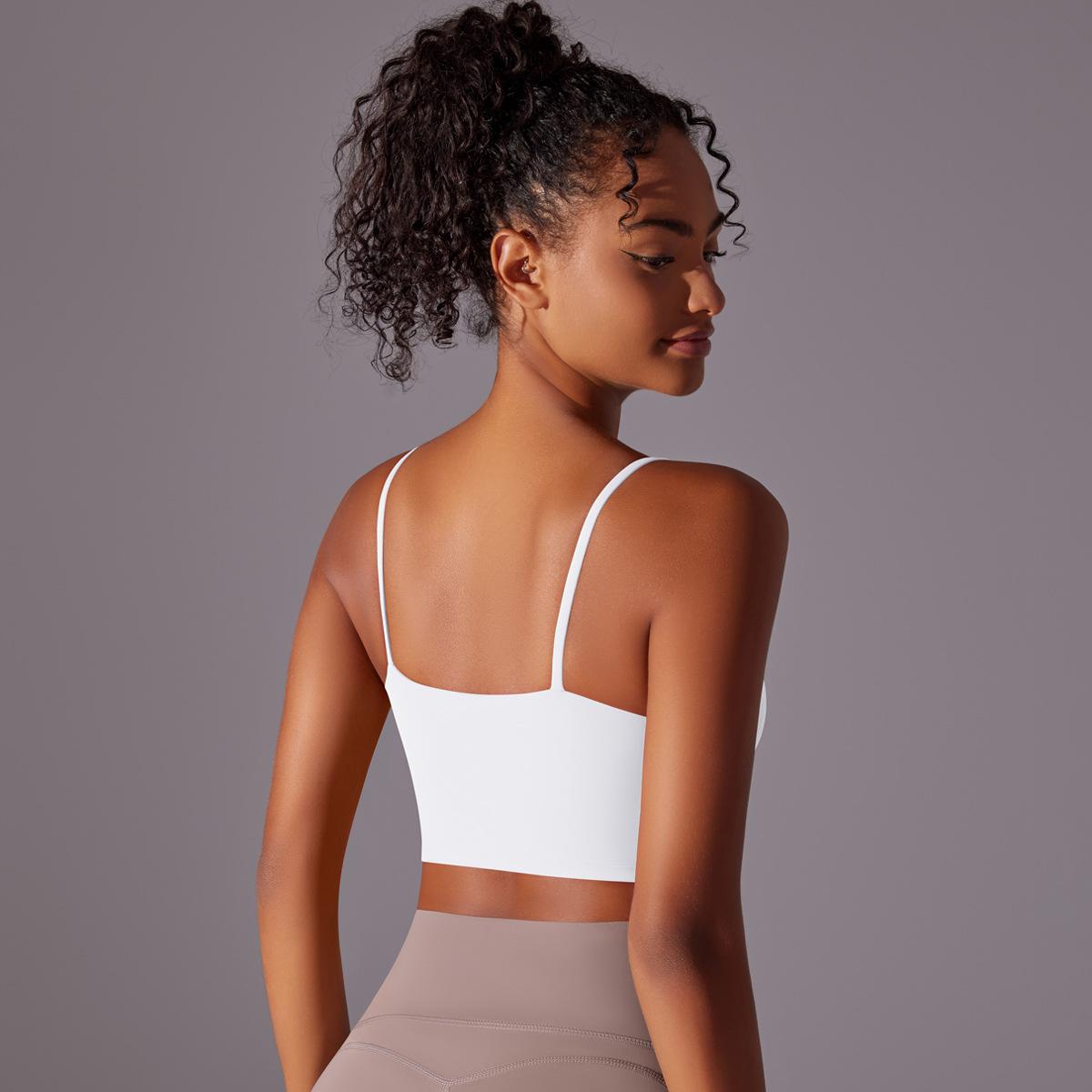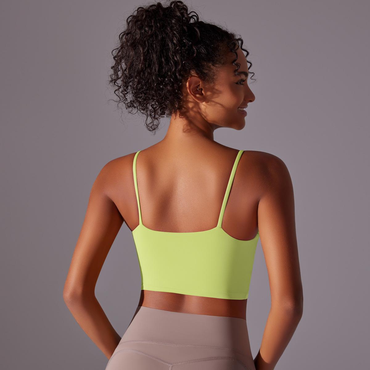 Chaleco de yoga de color sólido para mujer, nuevo, con almohadilla fija para el pecho, sexy, con tirantes finos, para fitness, ropa de yoga con media correa