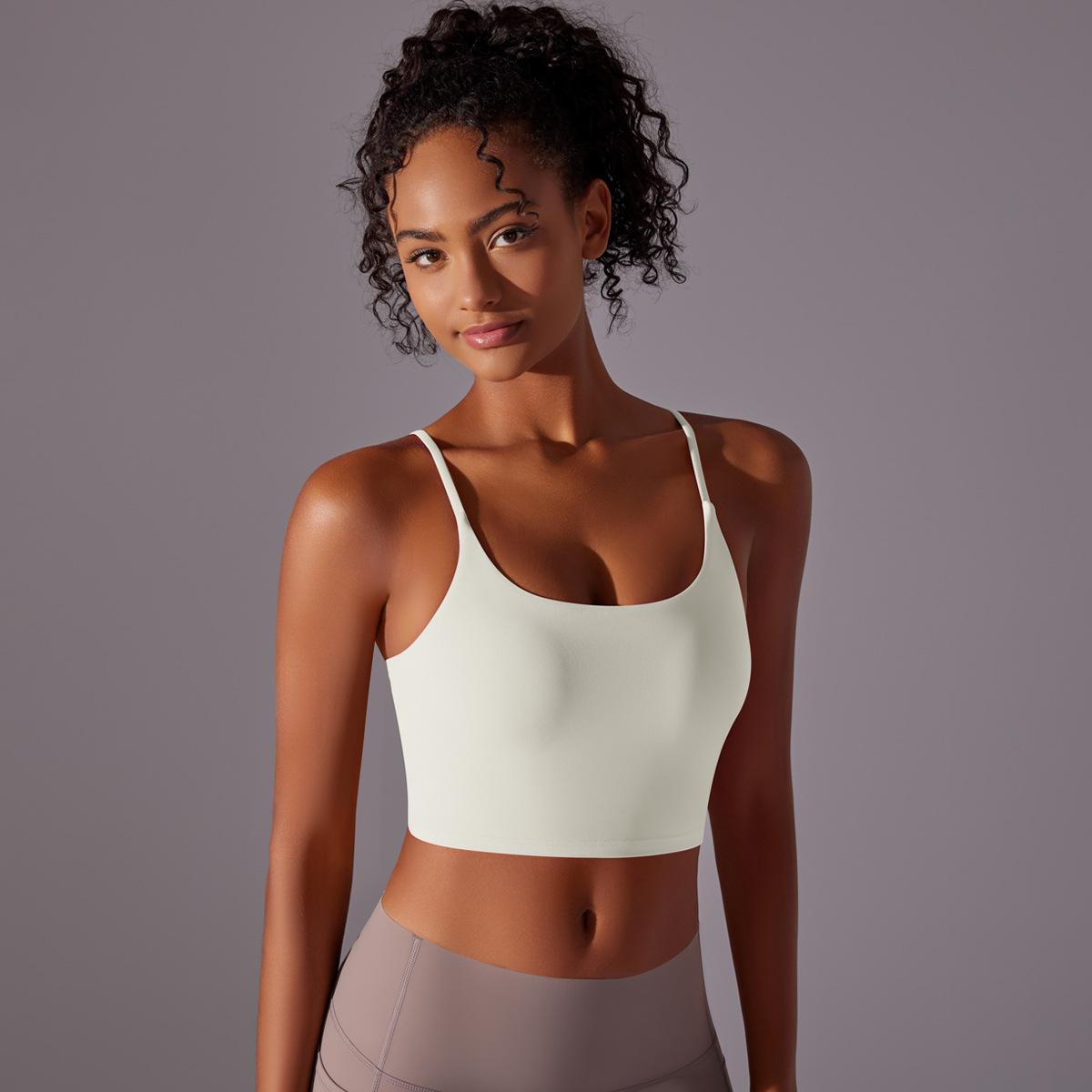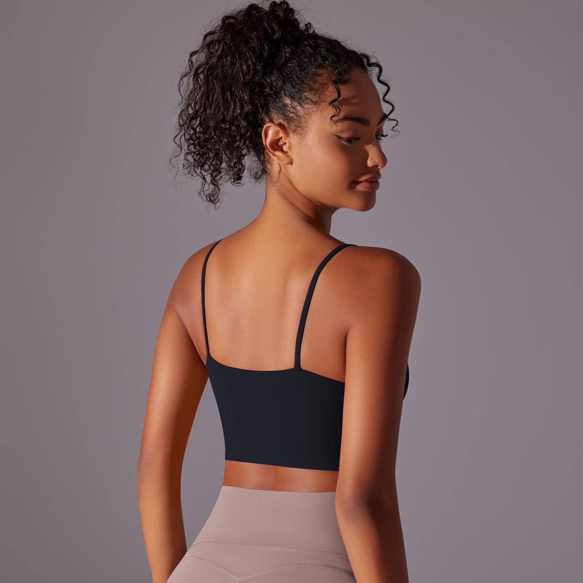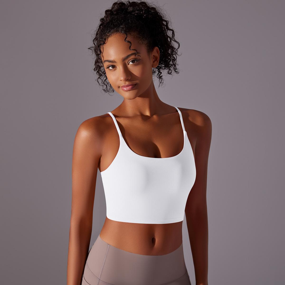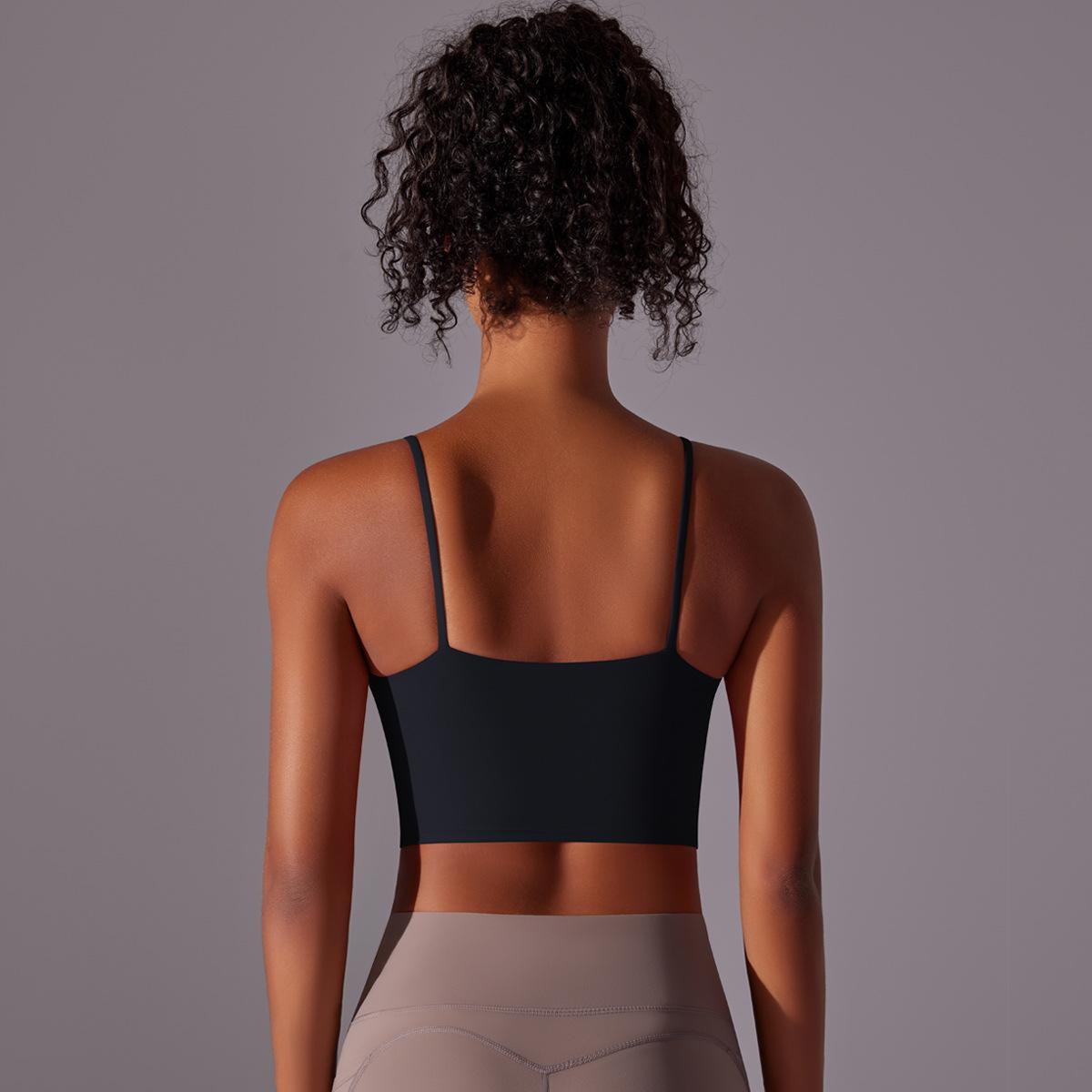 Chaleco de yoga de color sólido para mujer, nuevo, con almohadilla fija para el pecho, sexy, con tirantes finos, para fitness, ropa de yoga con media correa