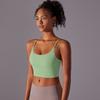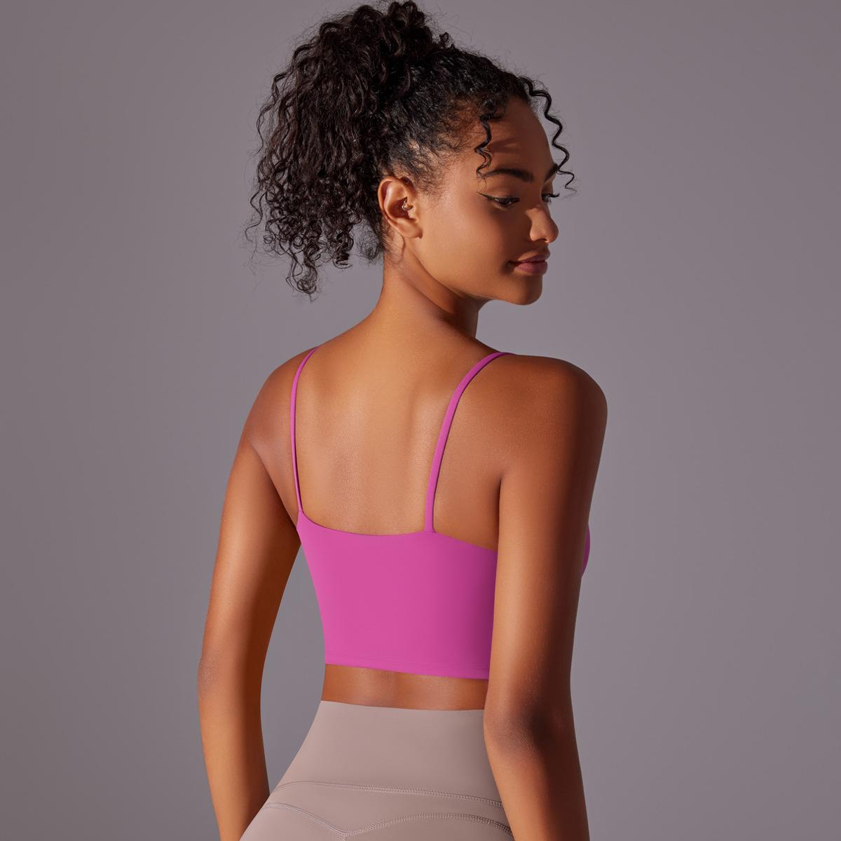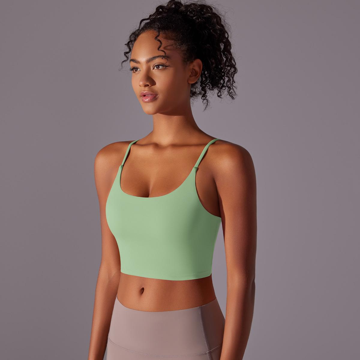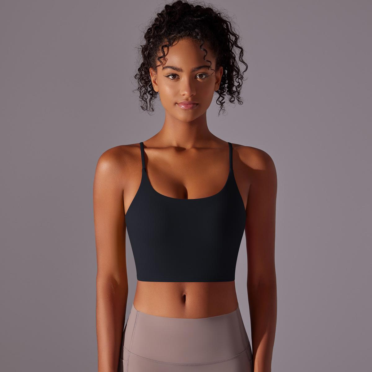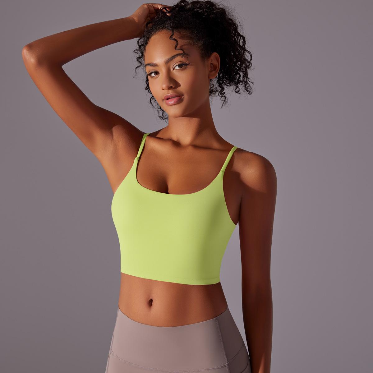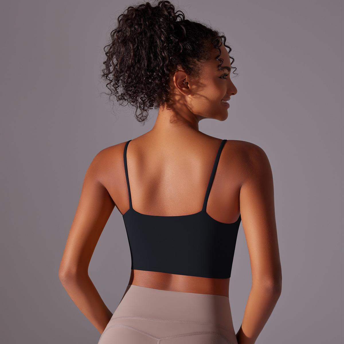 Chaleco de yoga de color sólido para mujer, nuevo, con almohadilla fija para el pecho, sexy, con tirantes finos, para fitness, ropa de yoga con media correa