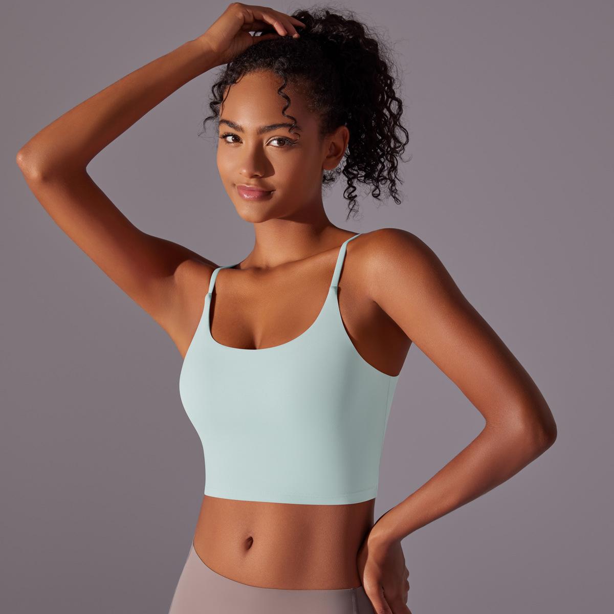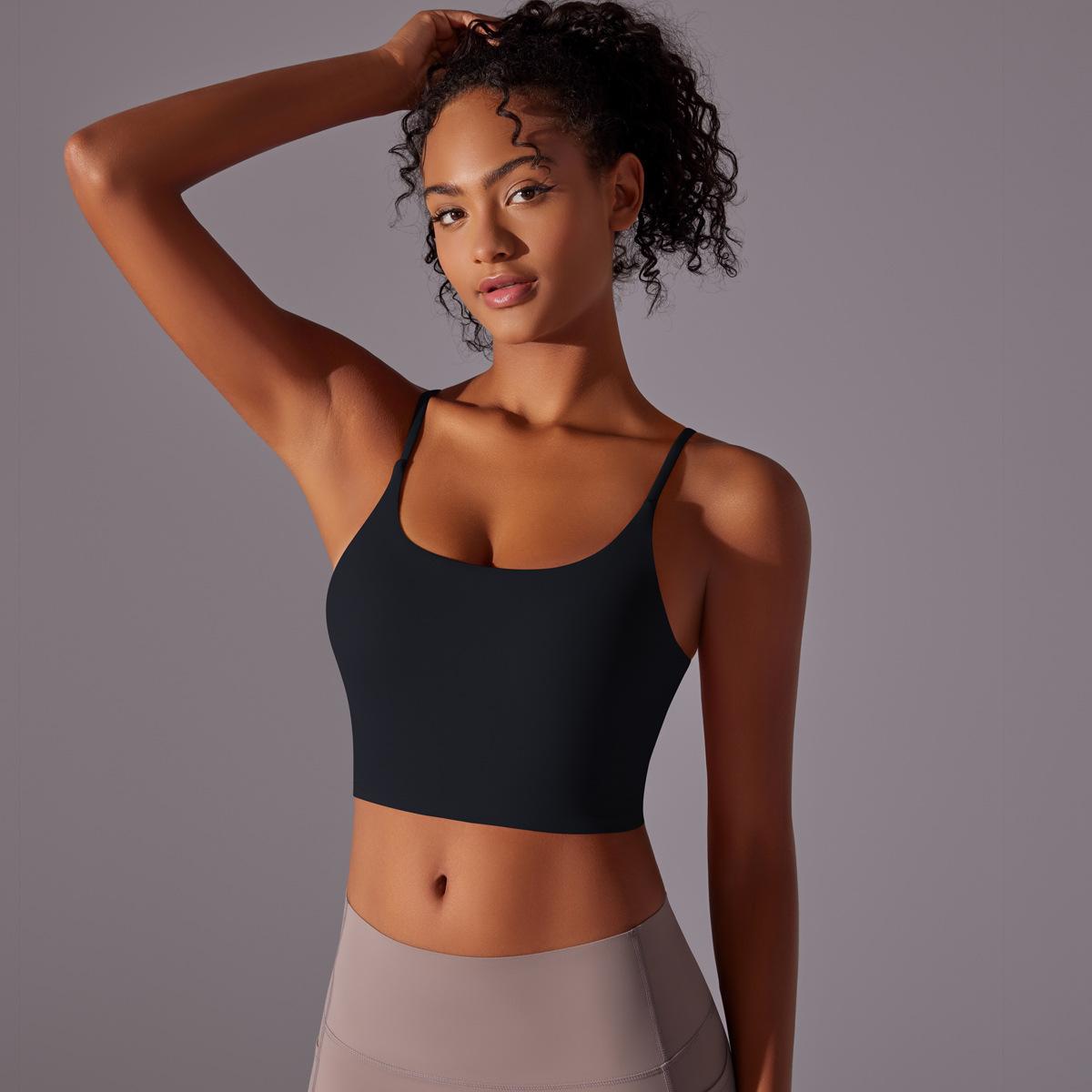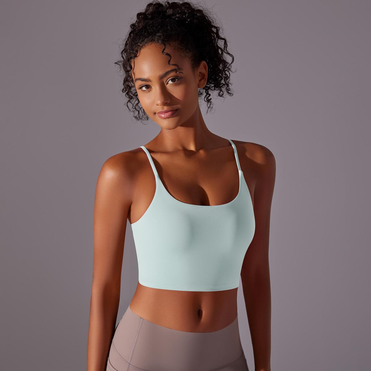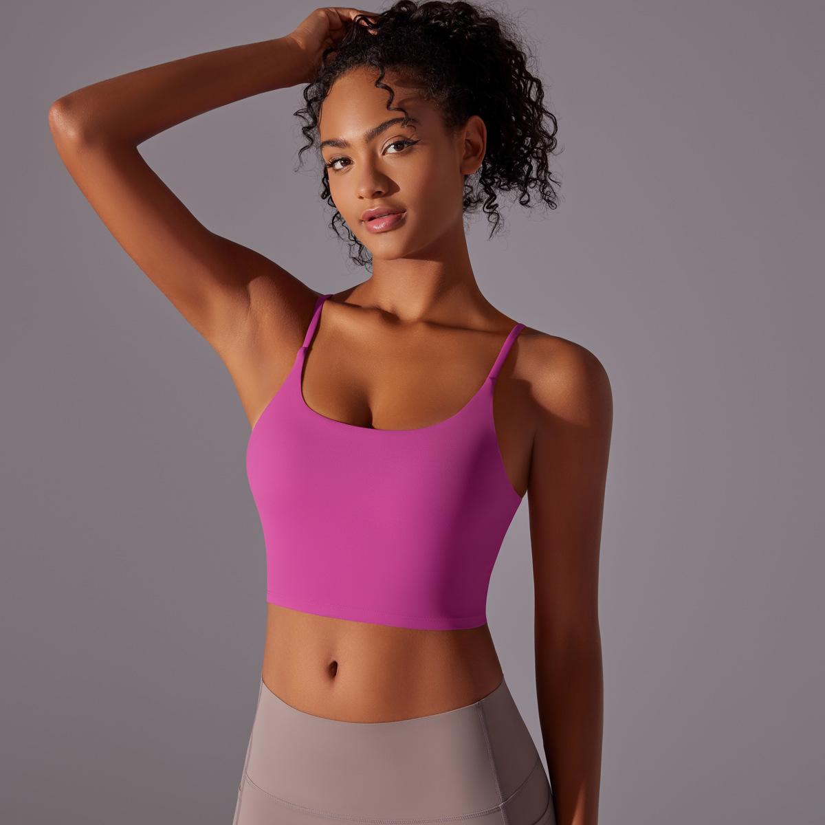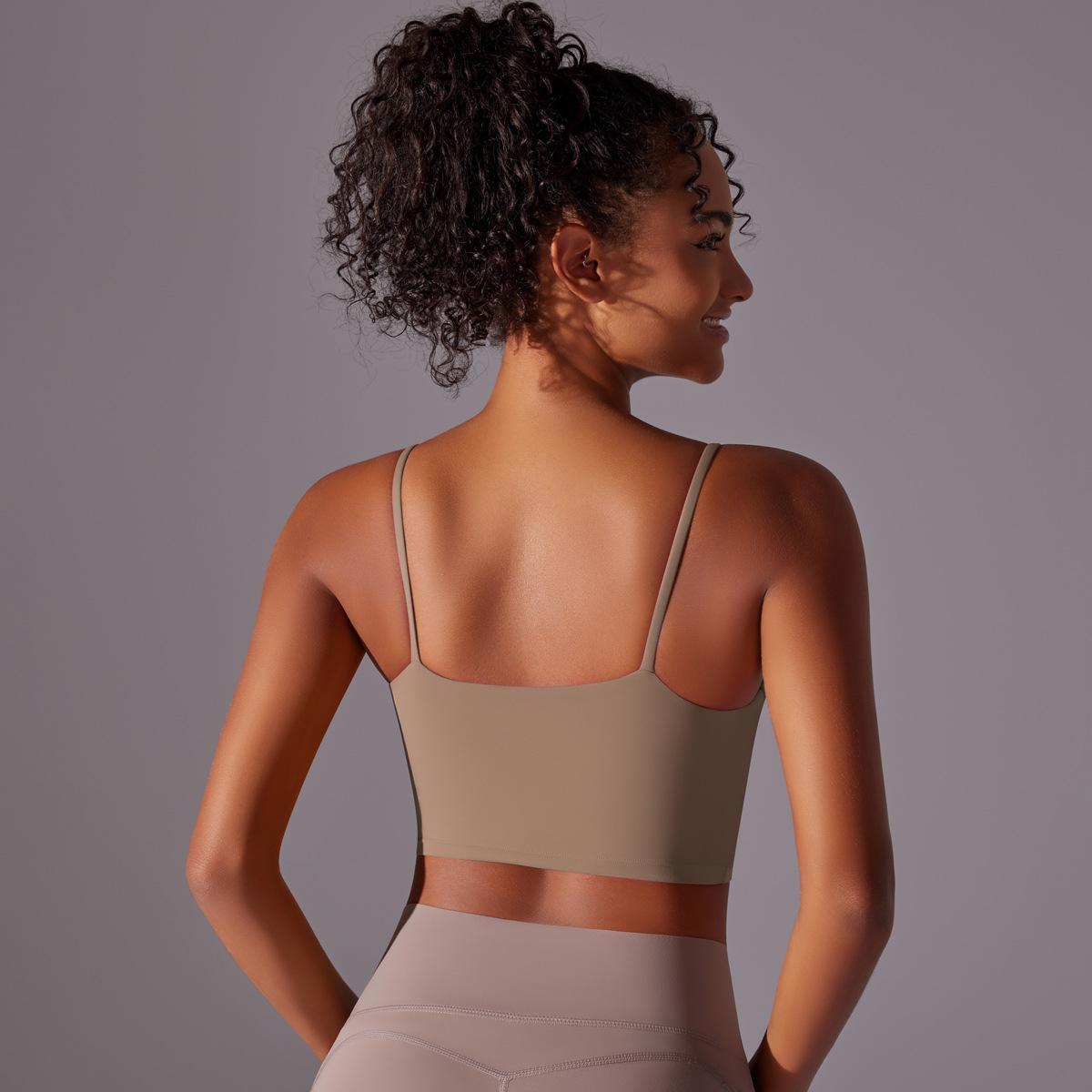 Chaleco de yoga de color sólido para mujer, nuevo, con almohadilla fija para el pecho, sexy, con tirantes finos, para fitness, ropa de yoga con media correa