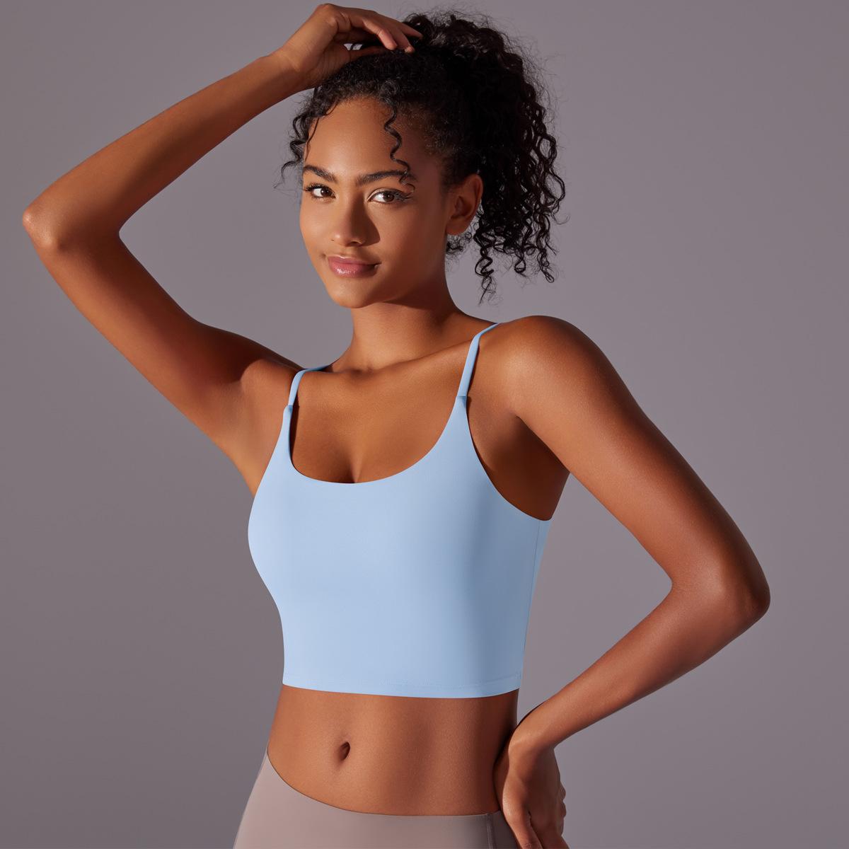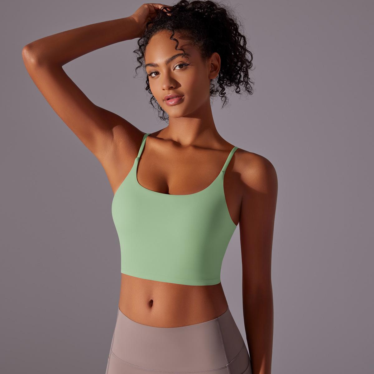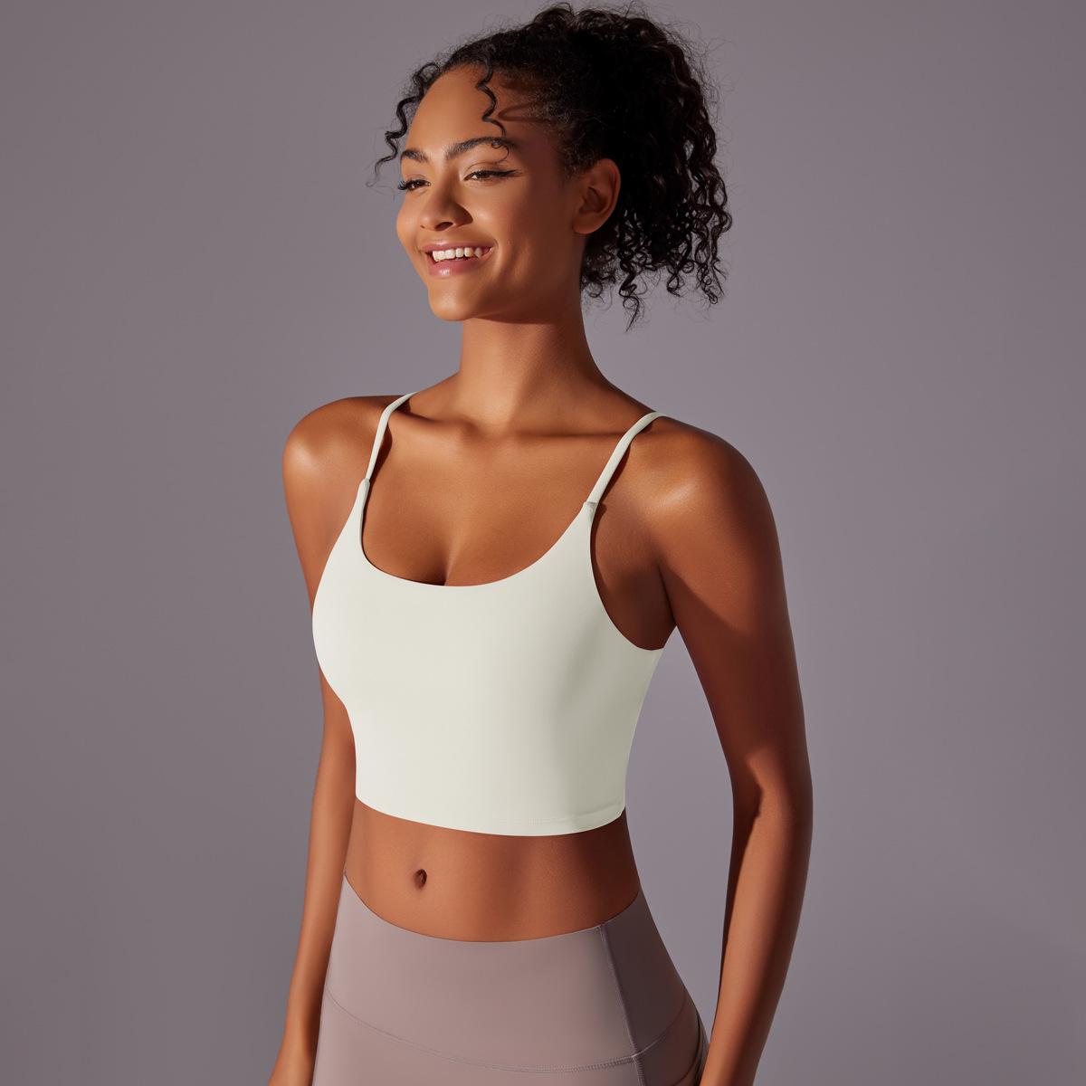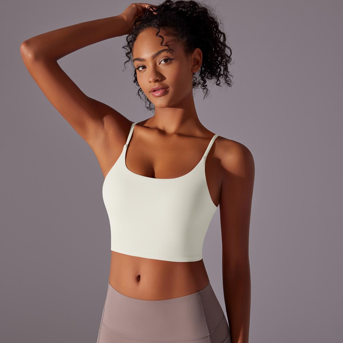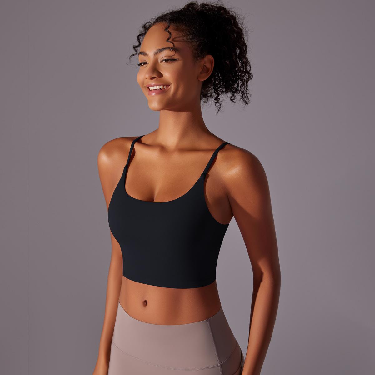 Chaleco de yoga de color sólido para mujer, nuevo, con almohadilla fija para el pecho, sexy, con tirantes finos, para fitness, ropa de yoga con media correa