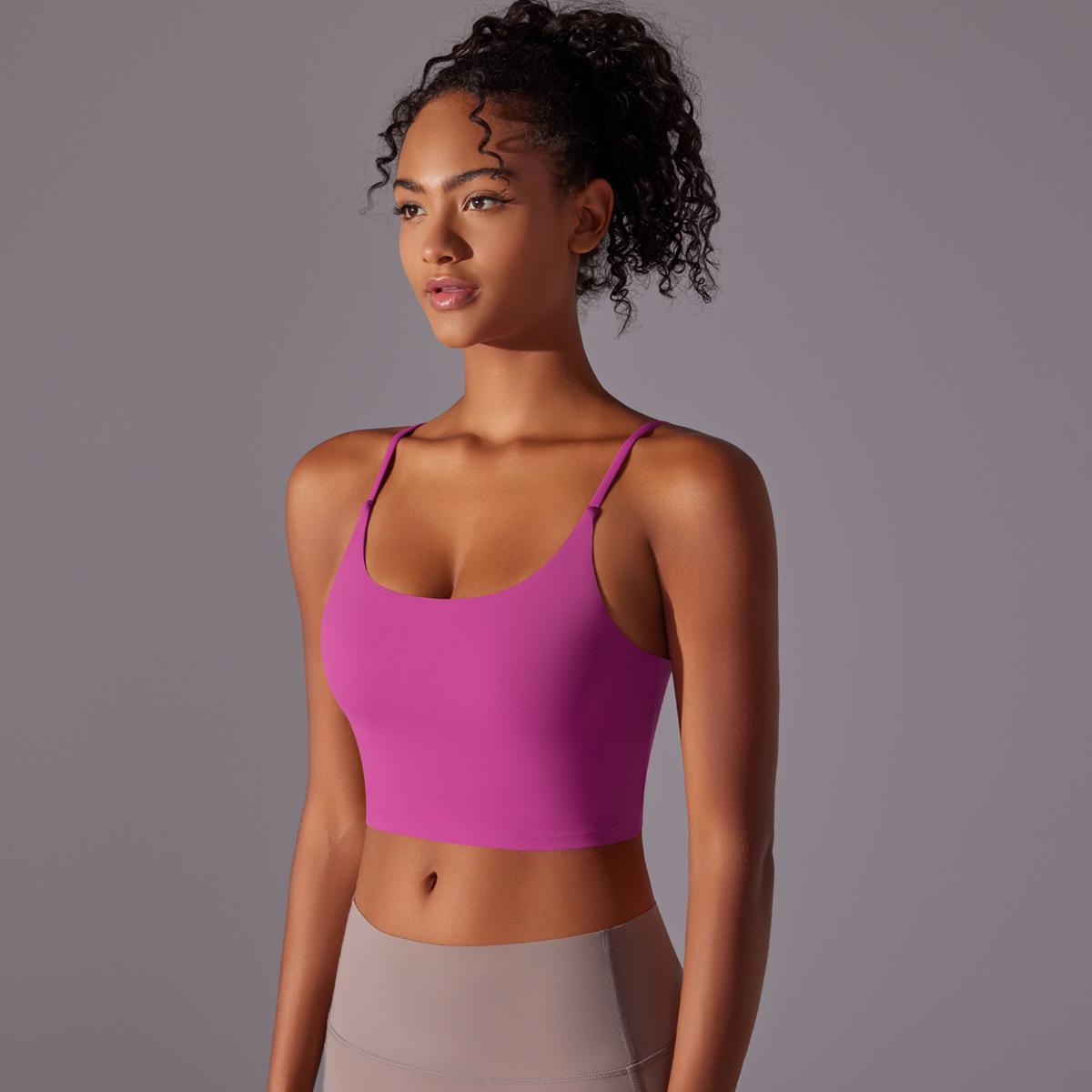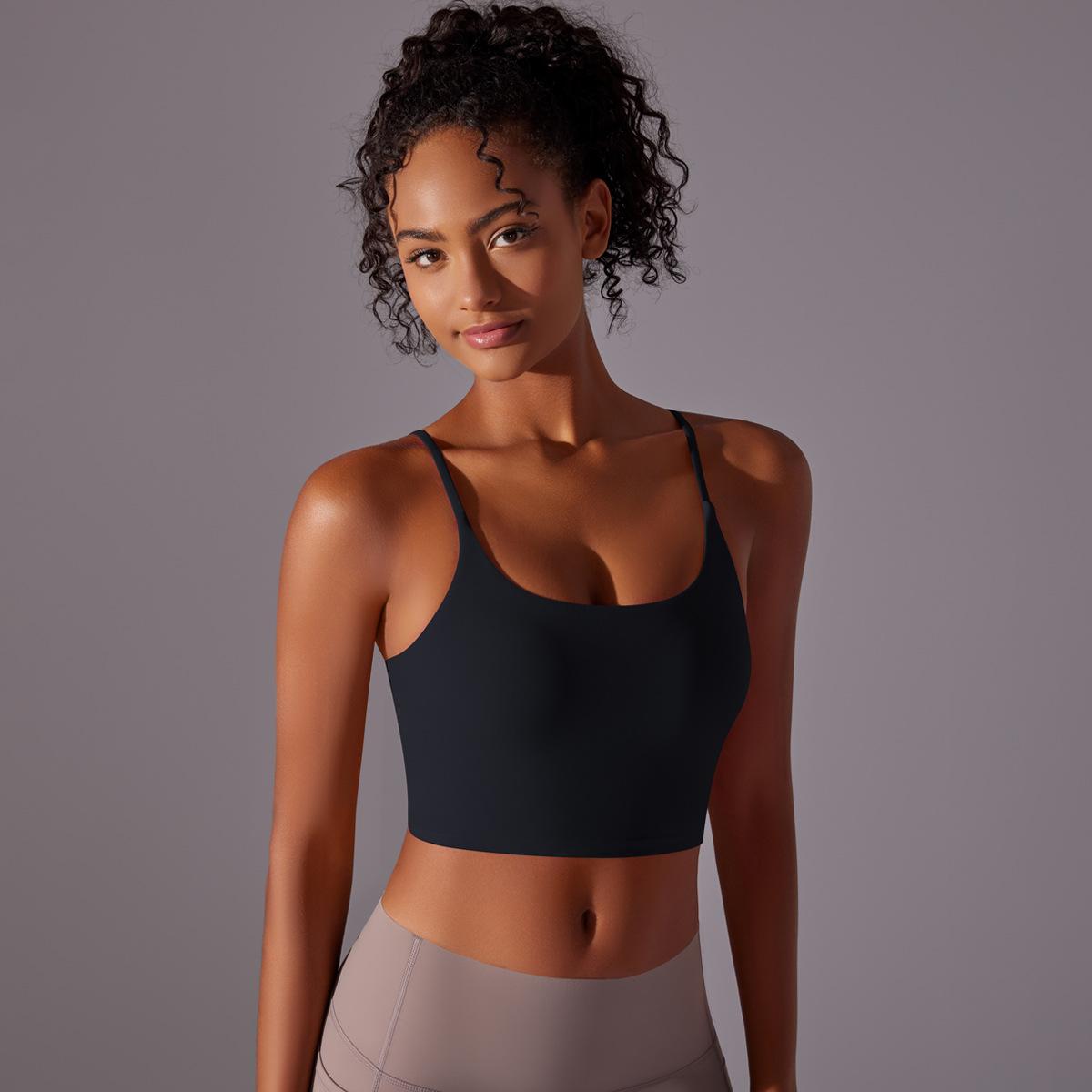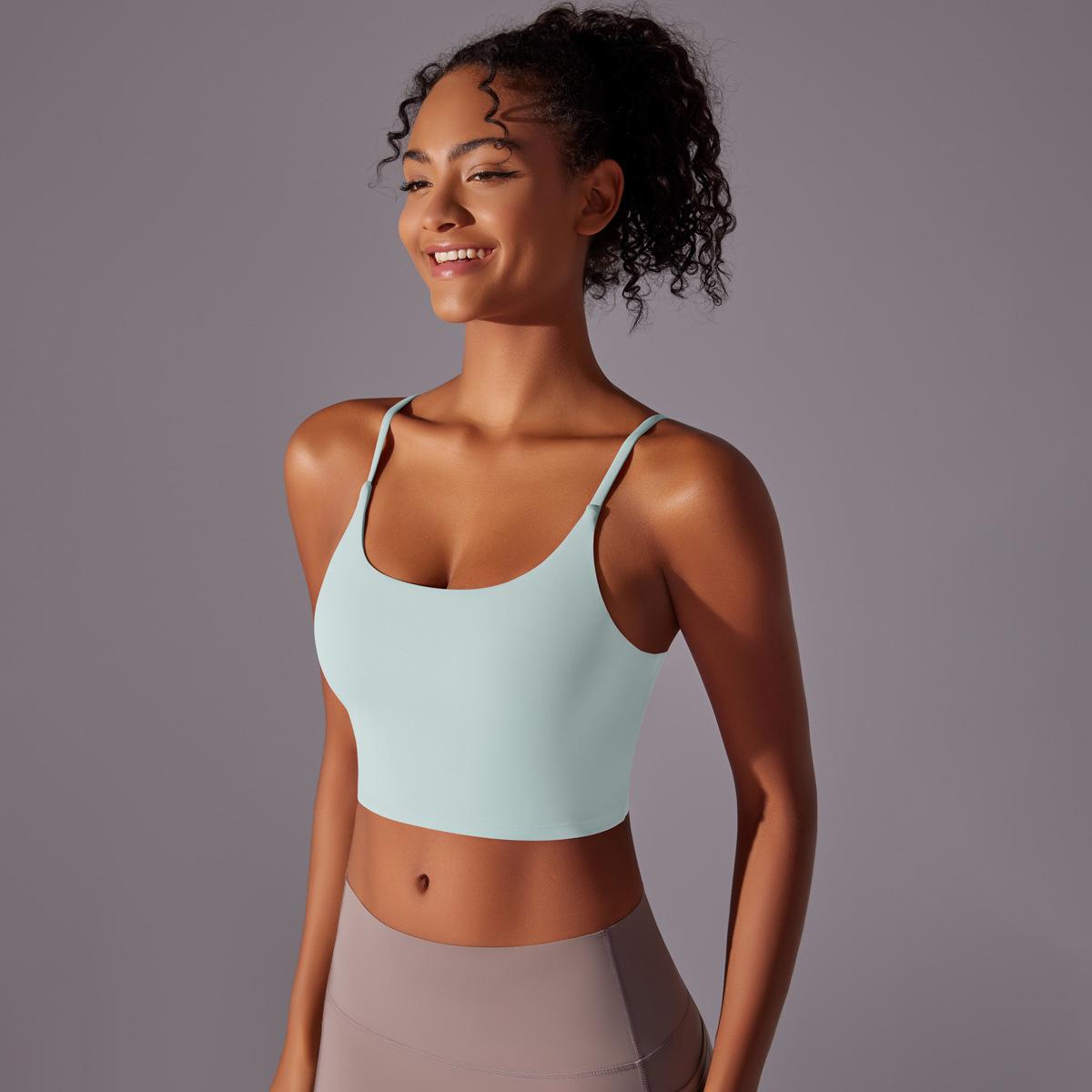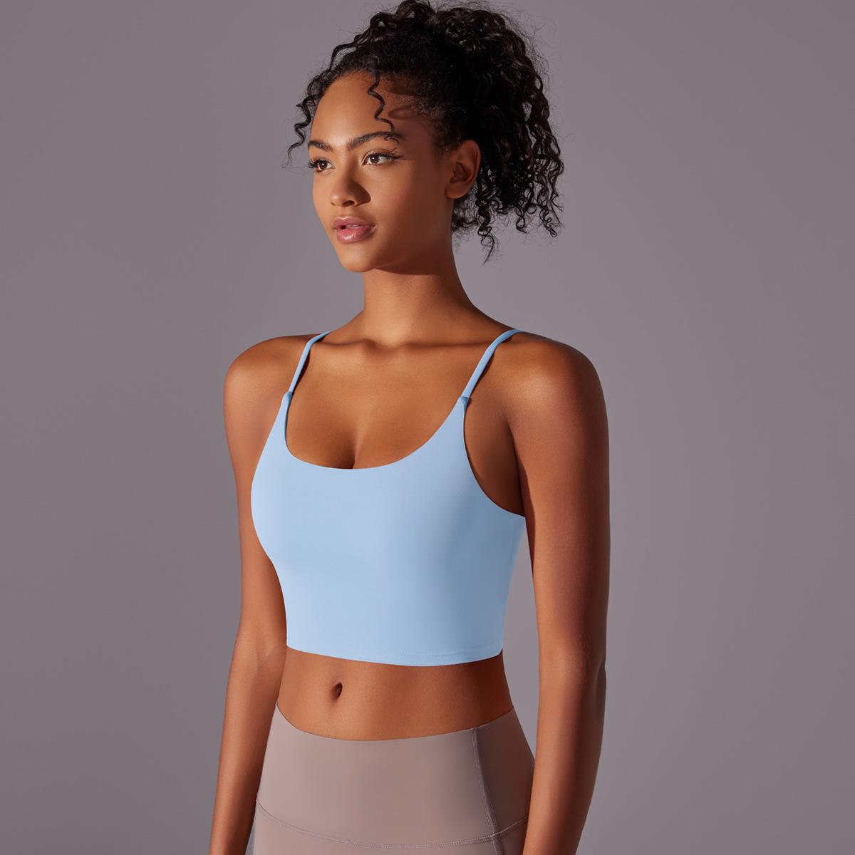 Chaleco de yoga de color sólido para mujer, nuevo, con almohadilla fija para el pecho, sexy, con tirantes finos, para fitness, ropa de yoga con media correa