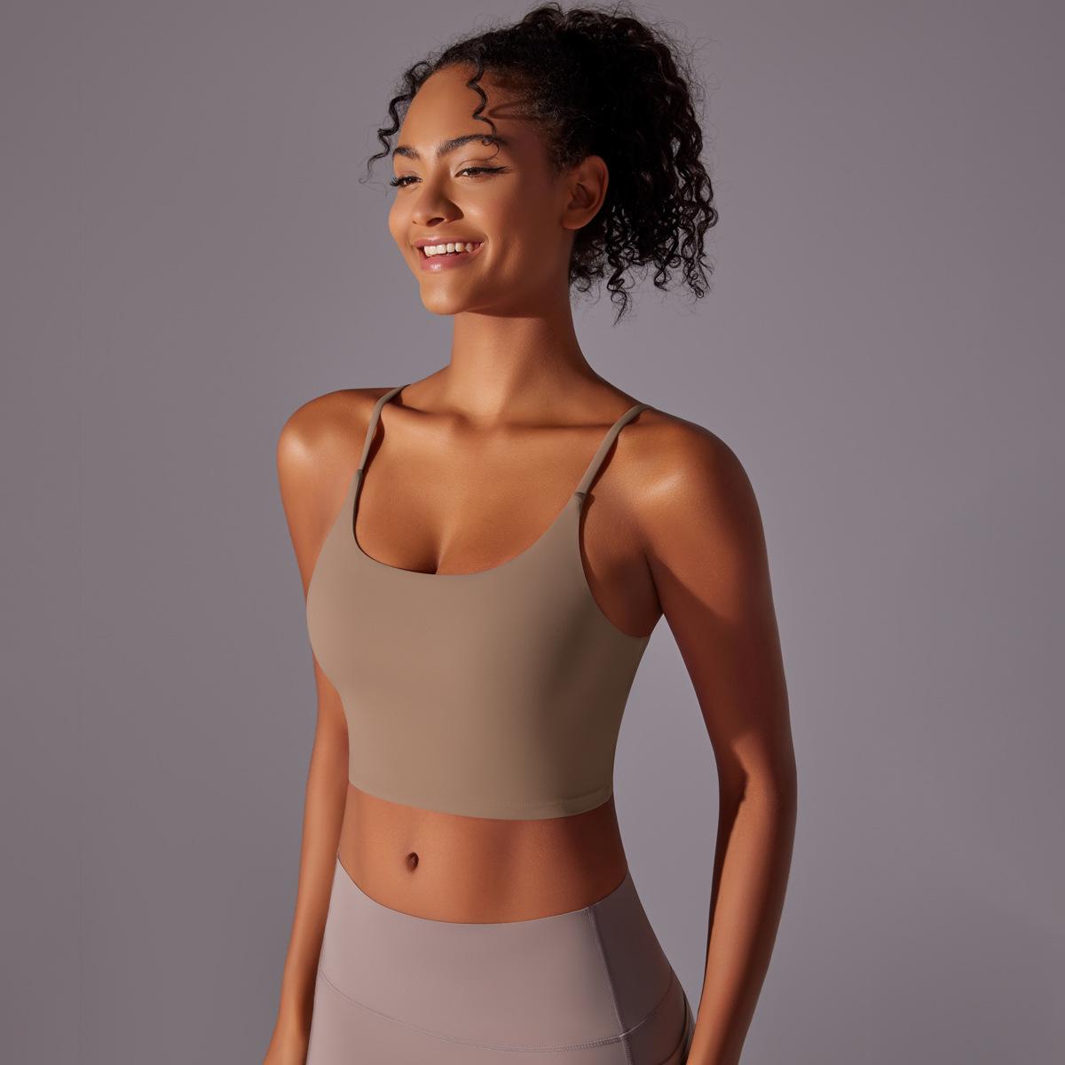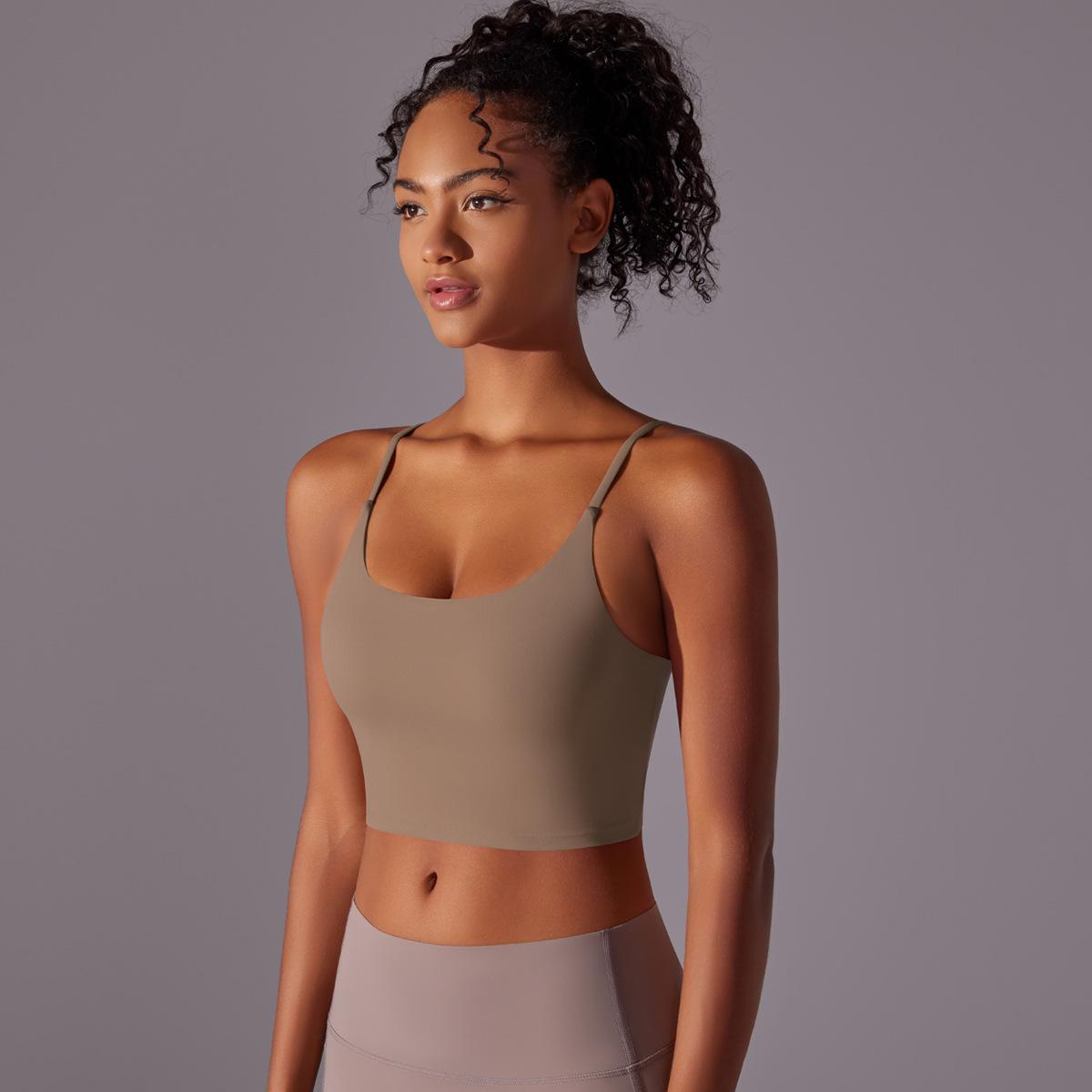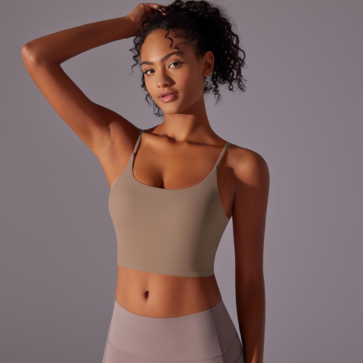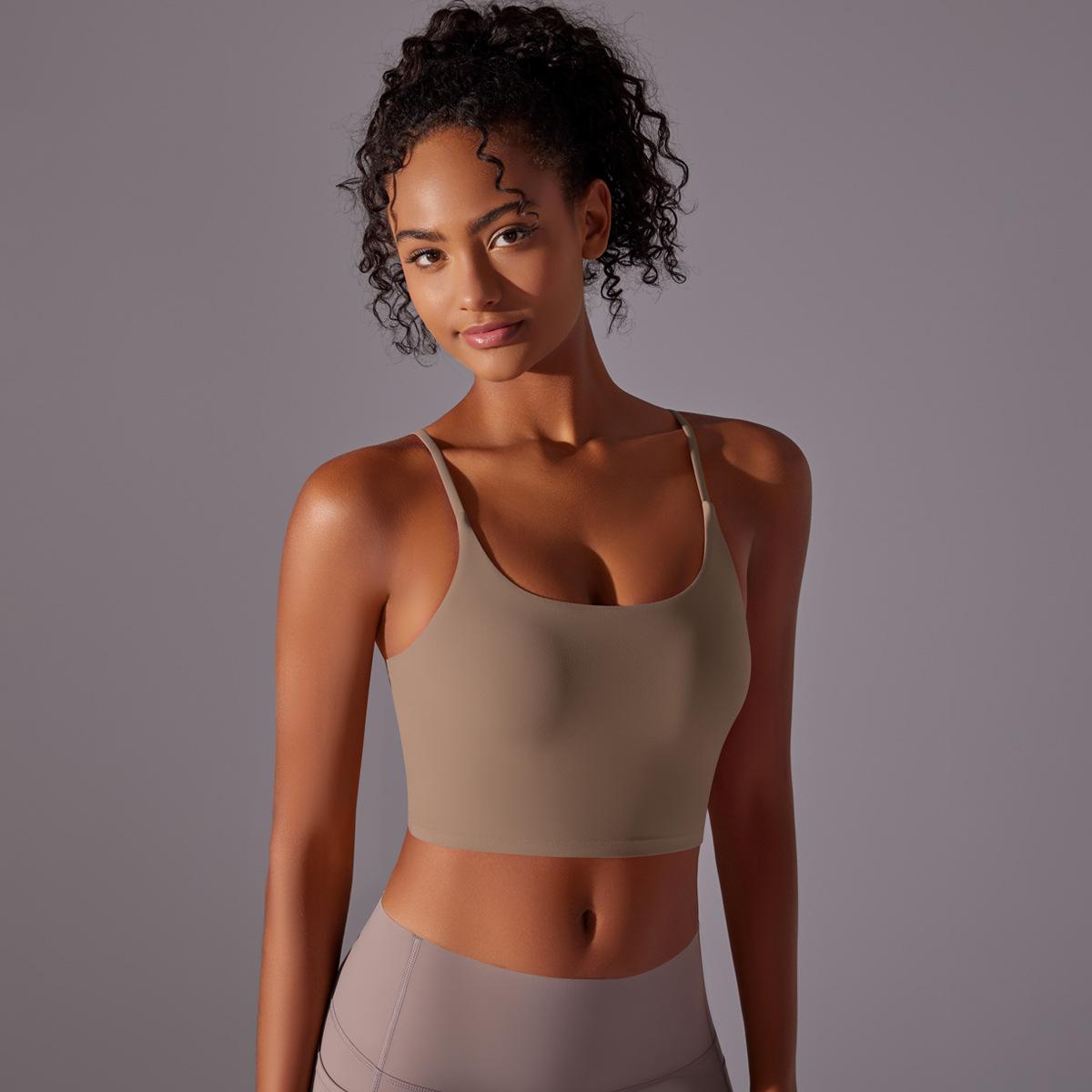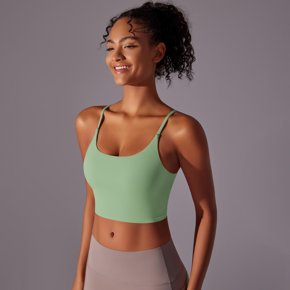 Chaleco de yoga de color sólido para mujer, nuevo, con almohadilla fija para el pecho, sexy, con tirantes finos, para fitness, ropa de yoga con media correa