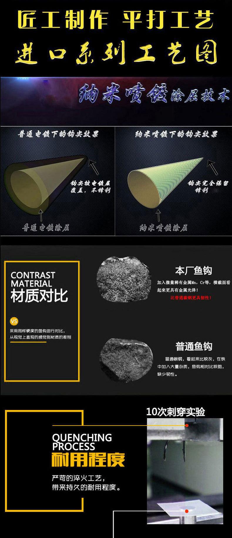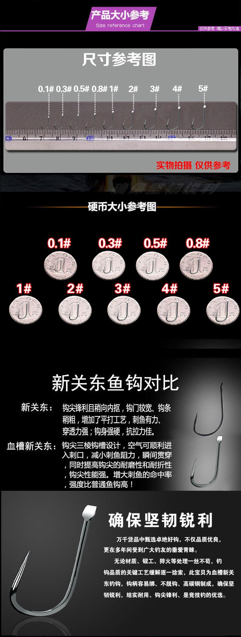 Los anzuelos vienen en diferentes tamaños, formas y grosores. El grosor del anzuelo está relacionado con su tamaño. Normalmente, el tamaño del anzuelo es proporcional a su grosor; es decir, cuanto mayor sea el tamaño, más grueso será y mayor será su resistencia a la tracción. Por el contrario, cuanto menor sea el tamaño del anzuelo, más delgado será y menor será su resistencia a la tracción. Sin embargo, no todos los anzuelos pequeños son delgados y tienen poca resistencia. Sabemos que la fuerza de tracción depende principalmente del material del anzuelo. Cuanto mejor sea la calidad del alambre de acero, mayor será la resistencia a la tracción. Además, un ángulo razonable y científico del anzuelo también puede mejorar su resistencia a la tracción. Tomemos como ejemplo el anzuelo Ise-ni. El grosor de la punta del anzuelo es diferente, lo que hace que el anzuelo grueso y el delgado tengan funciones diferentes. Los anzuelos gruesos se utilizan principalmente para capturar peces más grandes. Por ejemplo, los peces carnívoros feroces como la carpa negra, la carpa herbívora, la carpa común, la carpa plateada y la carpa cabezona en agua dulce, o el besugo negro y el besugo rojo en agua salada, tienden a ser agresivos y poderosos. Si se pescan con anzuelos delgados, es fácil que se enderecen, se rompan y el pez escape. El carpín y el pargo son cautelosos al alimentarse, son pequeños, se resisten poco y tienen bocas pequeñas. El uso de anzuelos delgados puede ser eficaz. Las ventajas de los anzuelos delgados son su buena ocultación, su gran capacidad de perforación y su pequeño tamaño. Pueden usarse para capturar peces astutos en estanques con resultados ideales. Las ventajas de los anzuelos gruesos son su alta resistencia a la tracción y su dificultad para soltarlos después de capturar el pez. La desventaja es su baja capacidad de perforación, lo que puede provocar que los peces se vuelvan cautelosos y afectar la tasa de picadura. No son adecuados para pescar peces más pequeños.