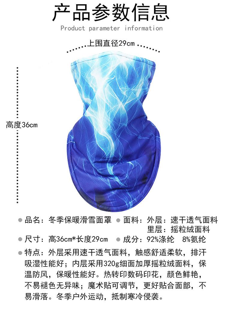 Características del producto: cómodo al tacto, la capa exterior está hecha de tela de seda Baiku de secado rápido y transpirable con impresión por transferencia térmica, la impresión respetuosa con la piel y transpirable es clara y no se desvanece ni hace bolitas, la capa interior está hecha de forro polar polar cálido engrosado, que tiene muy buen rendimiento de retención del calor. El velcro puede ajustar la tensión para adaptarse mejor al rostro.