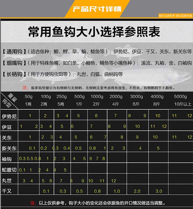 Al pescar peces grandes como carpas, carpas herbívoras, carpas plateadas y carpas cabezonas en grandes masas de agua como ríos, estanques y embalses, debe elegir anzuelos grandes como Senmata No. 2, Ise No. 9, Marusei No. 12 y carpa negra doméstica No. 8, Changhai No. 921 y superiores, con púas distintivas y una distancia no demasiado larga desde la punta del anzuelo hasta la púa. Si el objetivo de la pesca son peces omnívoros y feroces como la tilapia, la palometa plateada y la cola roja, debe elegir anzuelos un poco más grandes con mango largo, como Changhai No. 312-315, Marusei No. 13-19, stream No. 9-12 o Ise No. 12-14 y anzuelos grandes como Senmata No. 3 y superiores.