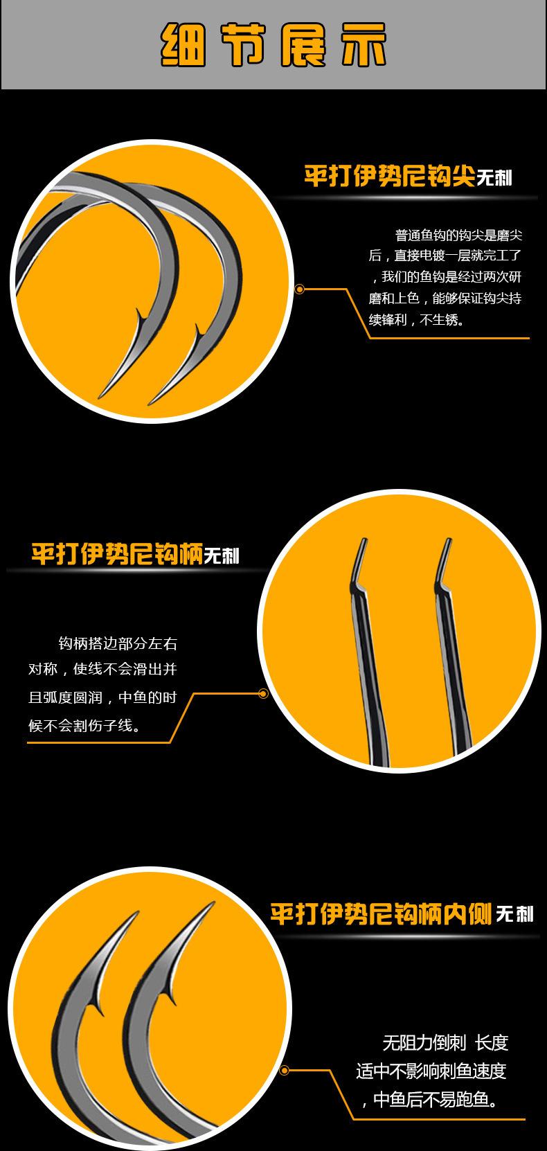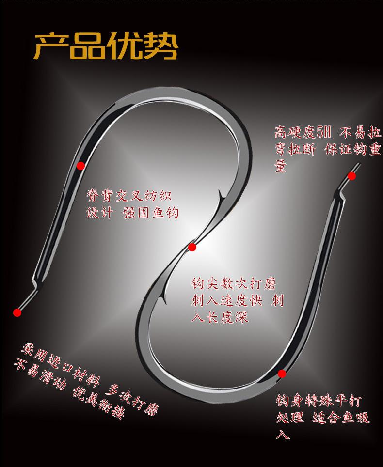 Manga: Este tipo de anzuelo no tiene púas. La punta es afilada, el mango es largo, el anzuelo es delgado y el cuerpo es ligero. Es adecuado para peces pequeños que se alimentan por succión. Es rápido de atrapar y de morder. Se utiliza principalmente para capturar carpas blancas, pequeños peces blancos, etc.