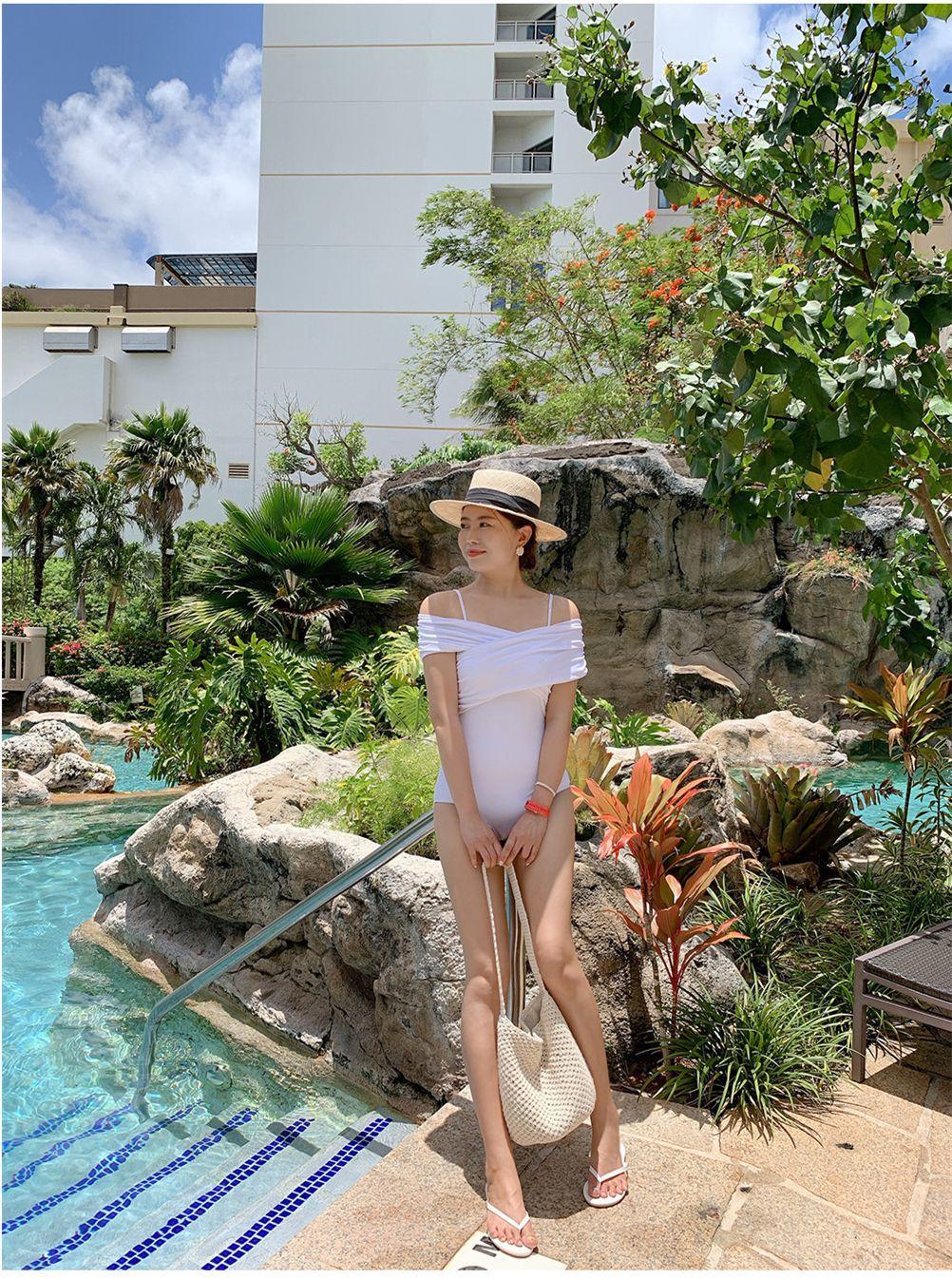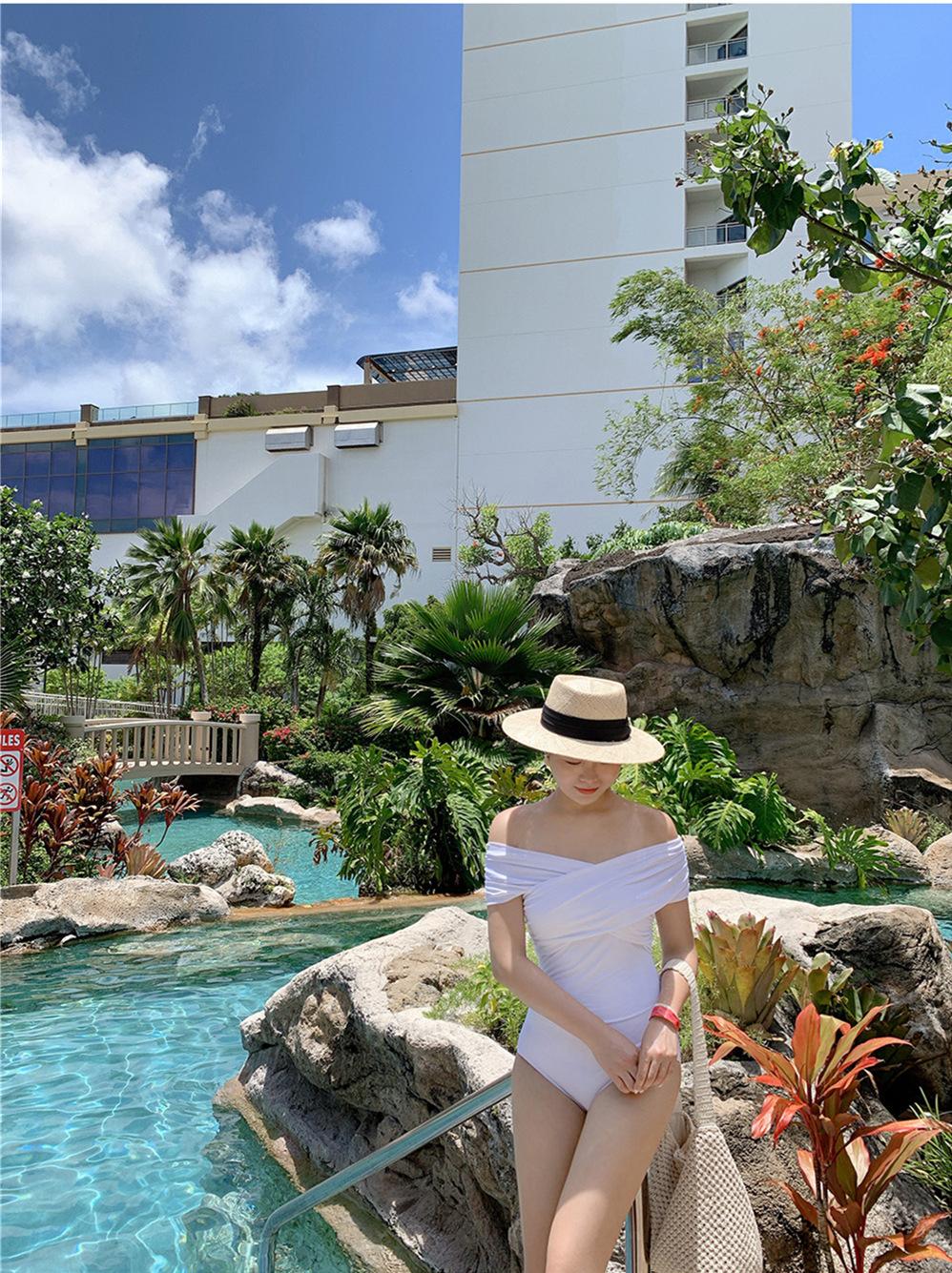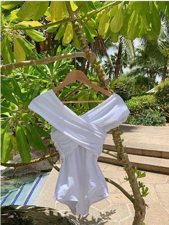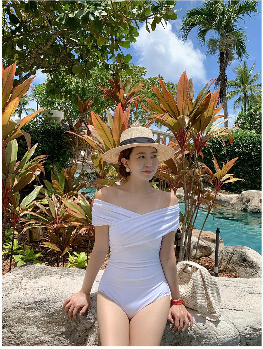 Fabricantes de origen versión coreana de estilo ins simple fuera del hombro delgado con vientre cubierto color sólido pecho pequeño fruncido traje de baño de una pieza para aguas termales
