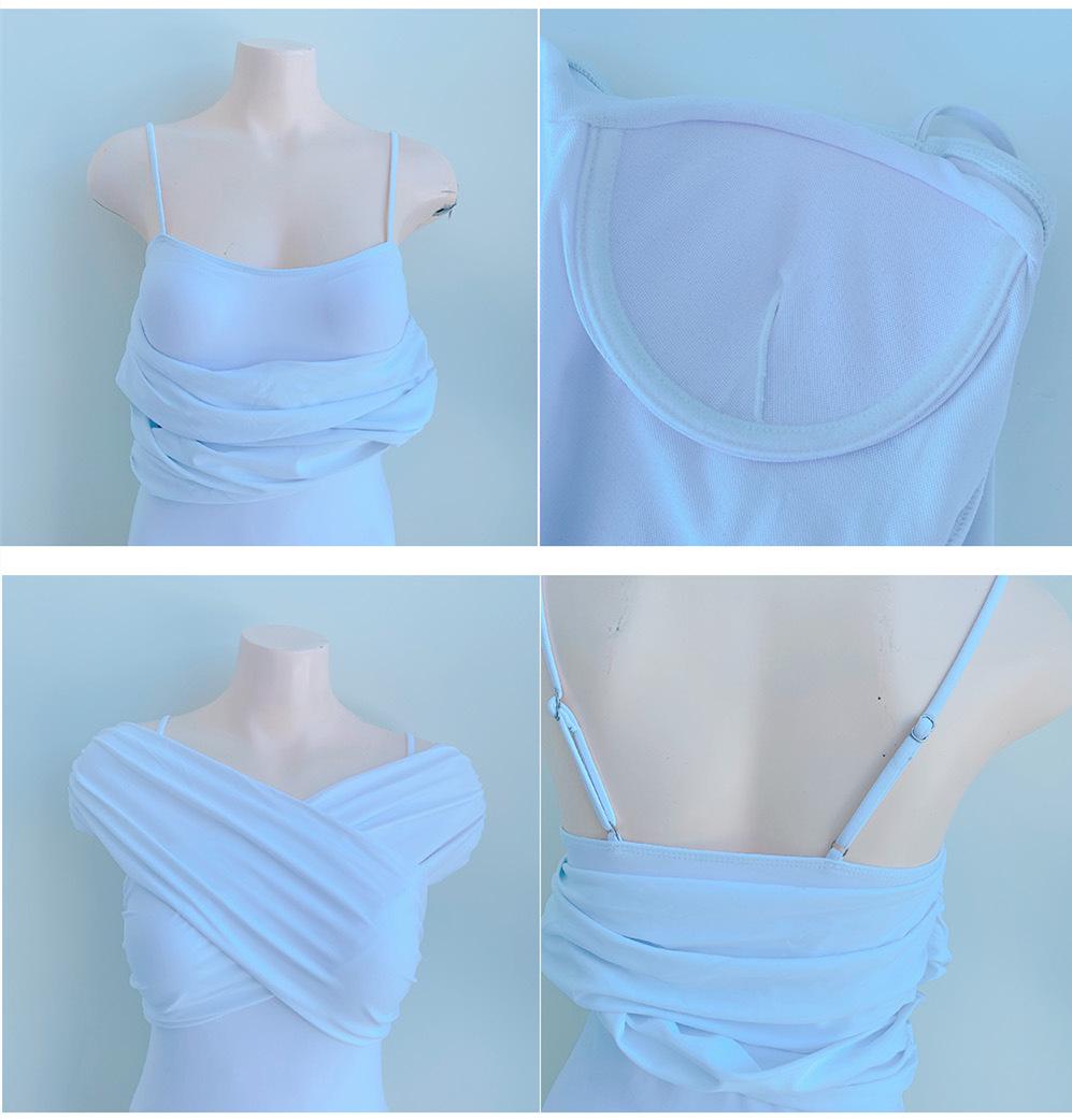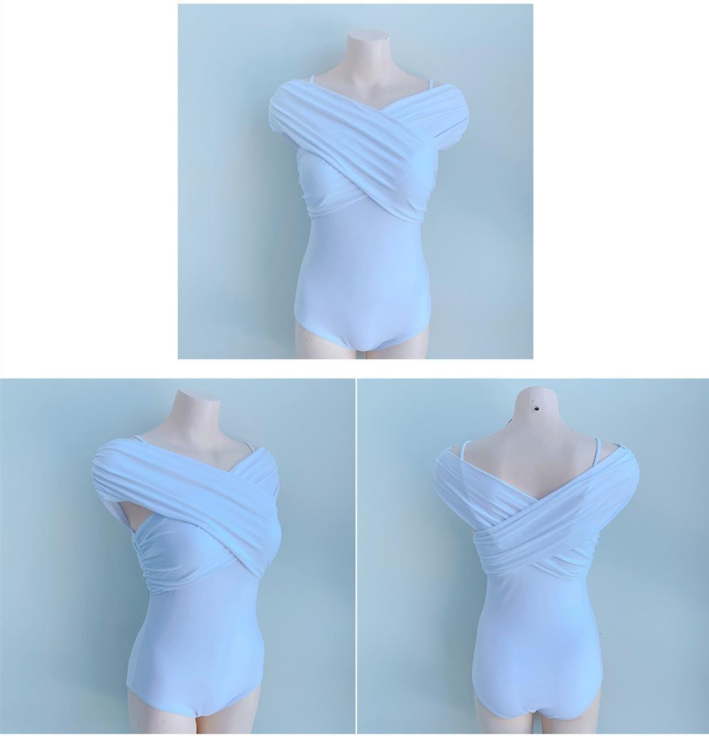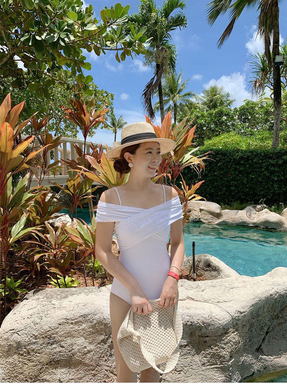 Fabricantes de origen versión coreana de estilo ins simple fuera del hombro delgado con vientre cubierto color sólido pecho pequeño fruncido traje de baño de una pieza para aguas termales