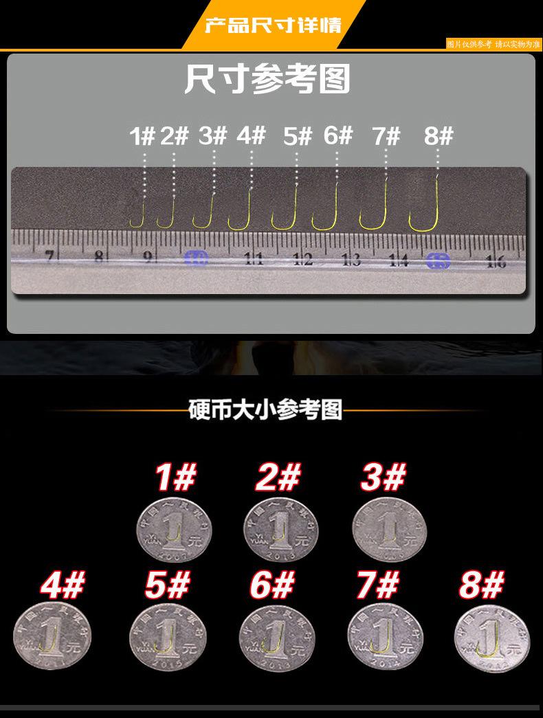 Los tipos representativos de anzuelos de mango corto incluyen los de forma Maru, Ise-ni, Maru-sode y Turtle, etc. Se utilizan principalmente para pescar en aguas poco profundas, en zonas de pesca con una profundidad de agua de 2 metros o menos. Dado que la tasa de mordida de los anzuelos de mango corto es mayor que la de los anzuelos de mango largo, se utilizan en una gama más amplia. Muchos pescadores los reprocesan y sueldan un anzuelo (anzuelo ascendente) con una ranura para atar la línea en el ojo del anzuelo para pescar peces de agua dulce. La diferencia entre los anzuelos de mango largo y los de mango corto es que los primeros se utilizan principalmente para pescar peces de aguas profundas, como carpas, carpas negras y carpas herbívoras. Los segundos se utilizan principalmente para pescar carpas crucianas, doradas y sargos en aguas poco profundas, etc.