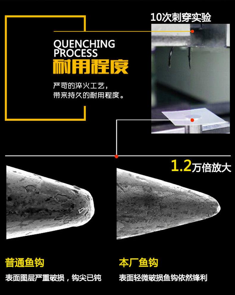 Además de estudiar la forma del anzuelo, también debe prestar atención a la calidad de la barra de acero al elegir un anzuelo. No es bueno si es demasiado frágil o demasiado blando. Un buen anzuelo debe ser fuerte, resistente y afilado. Fuerte significa fuerte. Si el anzuelo es demasiado fino, se deformará fácilmente durante el uso. Al encontrarse con un pez grande, el anzuelo se enderezará y el pez escapará. El grosor del anzuelo se puede juzgar por la intuición y el tacto. Si el anzuelo está afilado también es muy importante. Si el anzuelo está afilado, cuando el pez muerde el cebo, el pescador solo necesita mover ligeramente la caña, y el anzuelo puede enganchar la boca. Hay un método de prueba simple para comprobar si el anzuelo está afilado: coloque un trozo de tela de algodón plano sobre la mesa, coloque un anzuelo sobre la tela casualmente y luego tire de un lado de la tela con ambas manos para levantarlo. El anzuelo afilado puede enganchar la tela. Además, al comprar anzuelos, los pescadores pueden querer llevar algunos para realizar pruebas destructivas: sujetar el mango con alicates de punta fina, clavar la punta en la madera y tirar de él para comprobarlo. El acero que se rompe al tirar es demasiado frágil, y el que se endereza al tirar es demasiado blando. Ninguno de los dos se puede usar. Si has pescado peces grandes, hierba o rocas, y ves que el anzuelo está deformado, debes desecharlo. No pierdas la perspectiva general por algo pequeño y te arrepientas después.