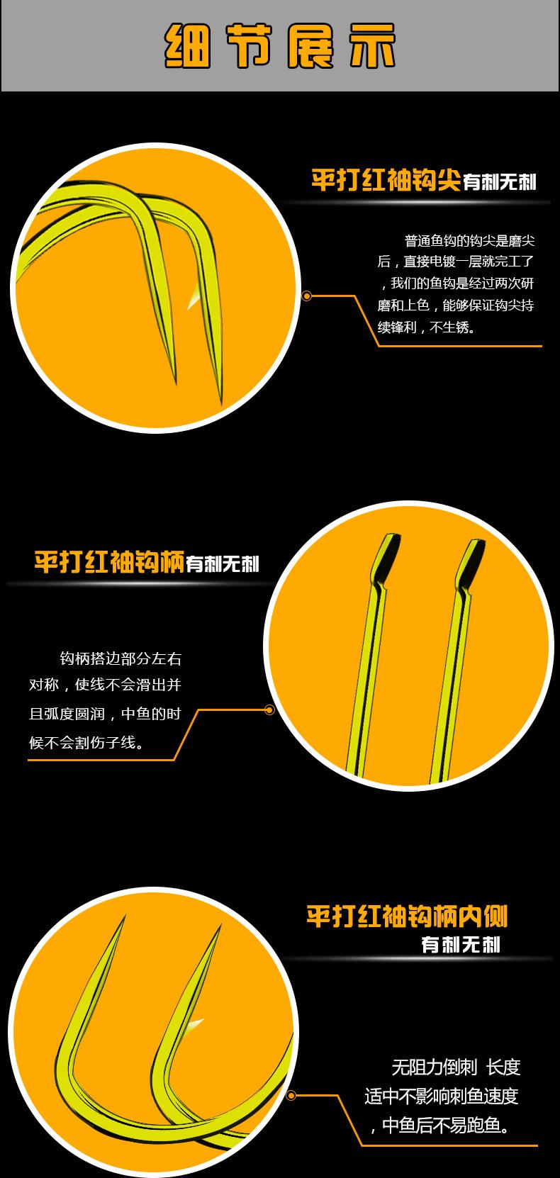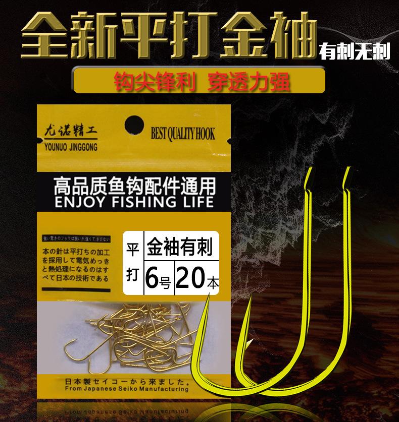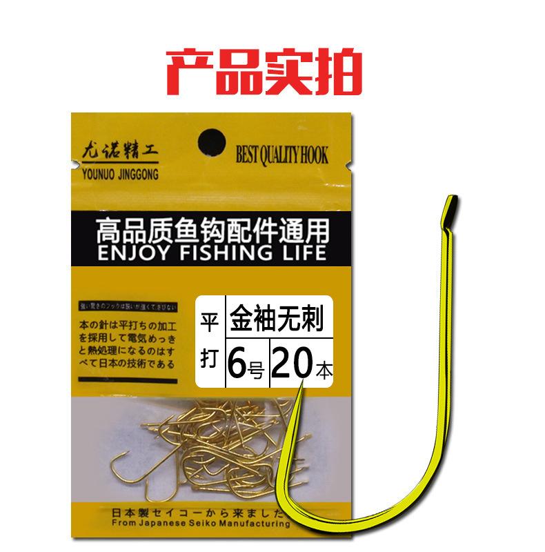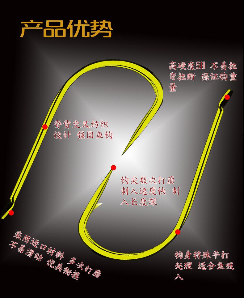 Manga: Este tipo de anzuelo no tiene púas. La punta es afilada, el mango es largo, el anzuelo es delgado y el cuerpo es ligero. Es adecuado para peces pequeños que se alimentan por succión. Es rápido de atrapar y de morder. Se utiliza principalmente para capturar carpas blancas, pequeños peces blancos, etc.