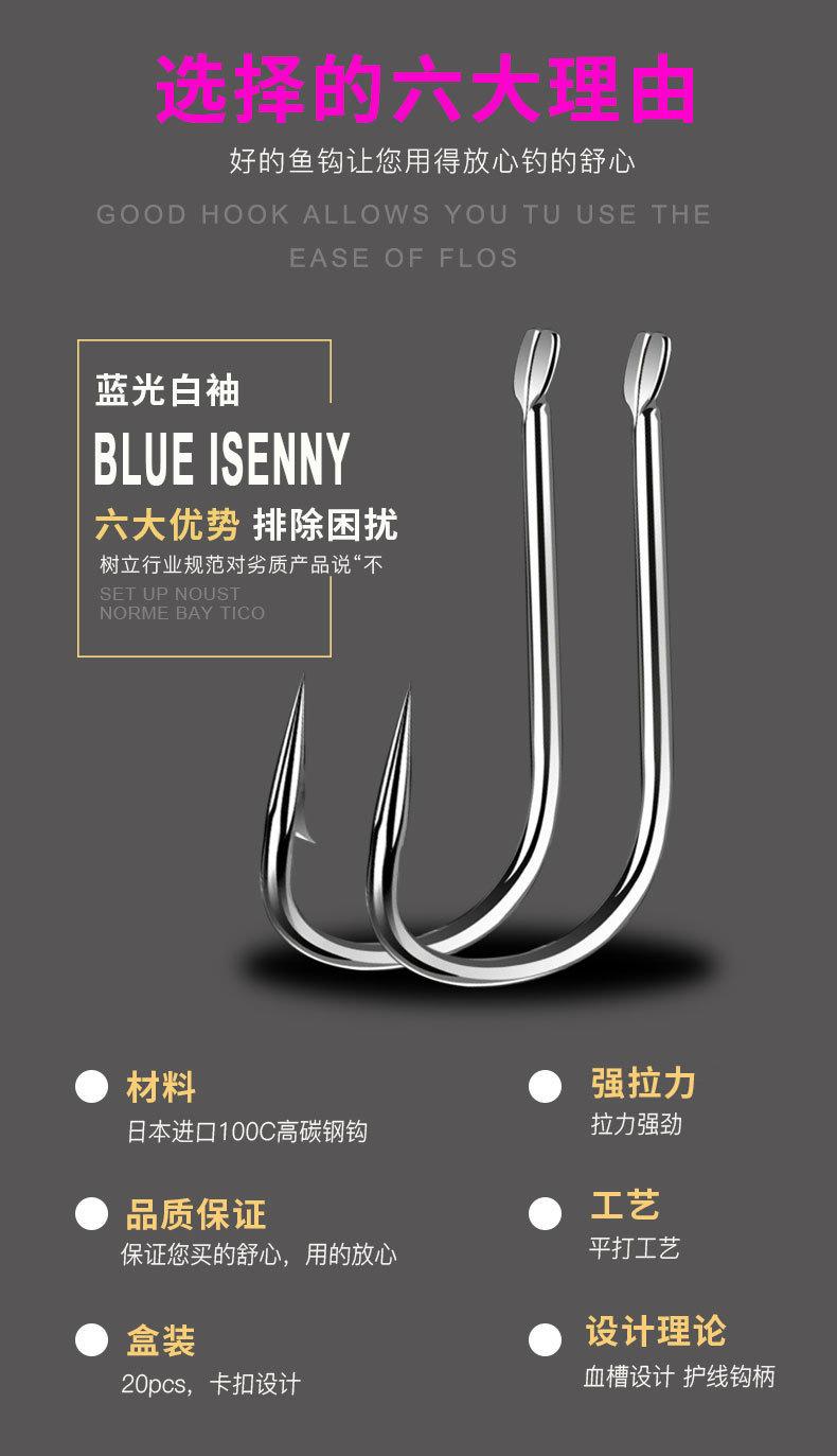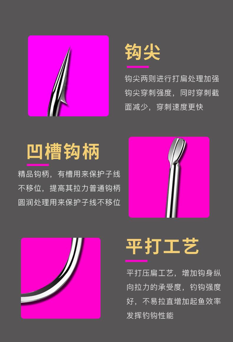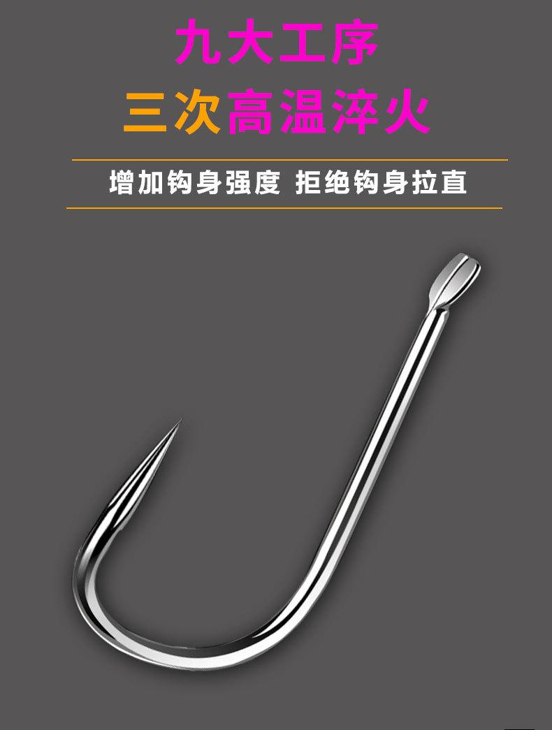 Manga: Este tipo de anzuelo no tiene púas. La punta es afilada, el mango es largo, el anzuelo es delgado y el cuerpo es ligero. Es adecuado para peces pequeños que se alimentan por succión. Es rápido de atrapar y de morder. Se utiliza principalmente para capturar carpas blancas, pequeños peces blancos, etc.