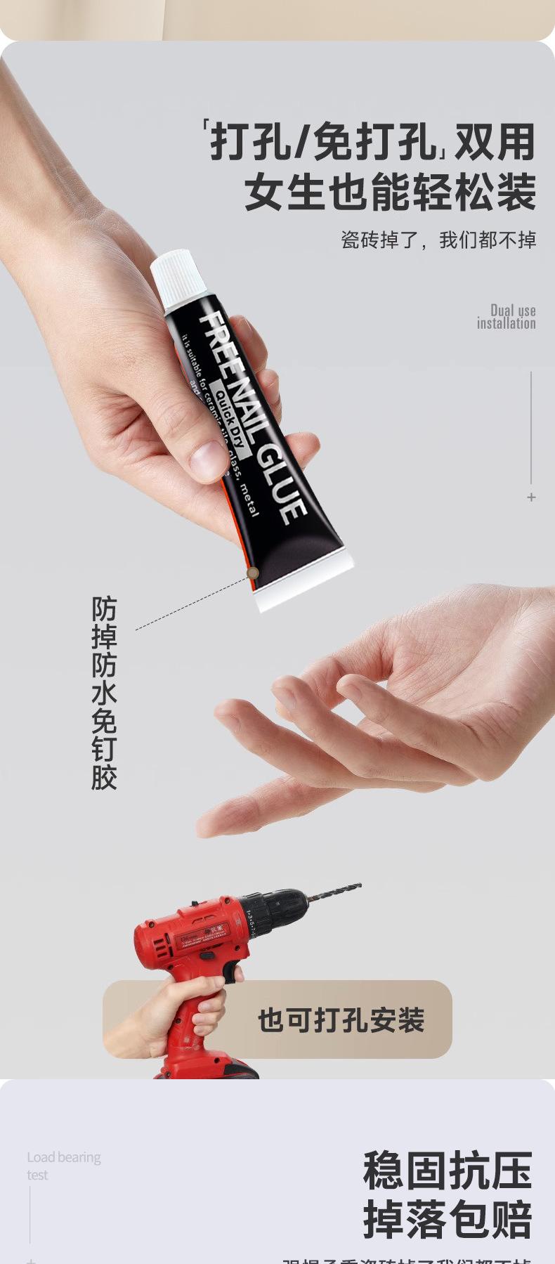 (2) Para una instalación sin perforaciones, tenga en cuenta que la superficie de la pared debe ser plana y sólida, como baldosas de vidrio.No disponible enEn paredes irregulares e inestables como paredes pintadas, papel tapiz, paredes de cal, etc. Después de aplicar el pegamento en la pared, debe esperar de 3 a 5 días para que el pegamento sin clavos se seque completamente antes de usarlo.
