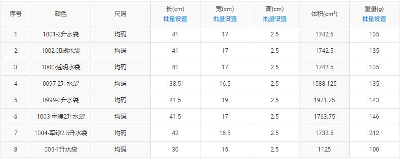 1001-2 liter water bag, 1002-Printed water bag, 1000-Clear water bag, 0097-2 liter water bag, 0999-3 liter wat...