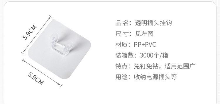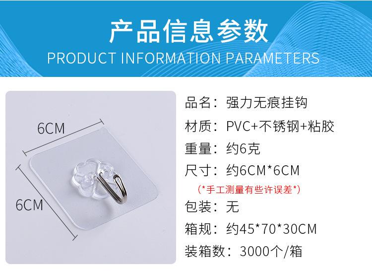 Nombre del producto: gancho Tamaño del producto: 6 x 6 cm Peso del producto: aproximadamente 7 g Material del producto: PET+sin rastro+AS Embalaje del producto: Ninguno Embalaje del producto: 2500/caja Tamaño de la caja del producto: 69 x 46 x 30 cm