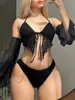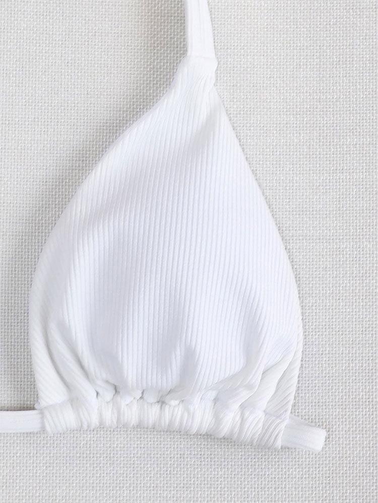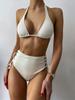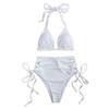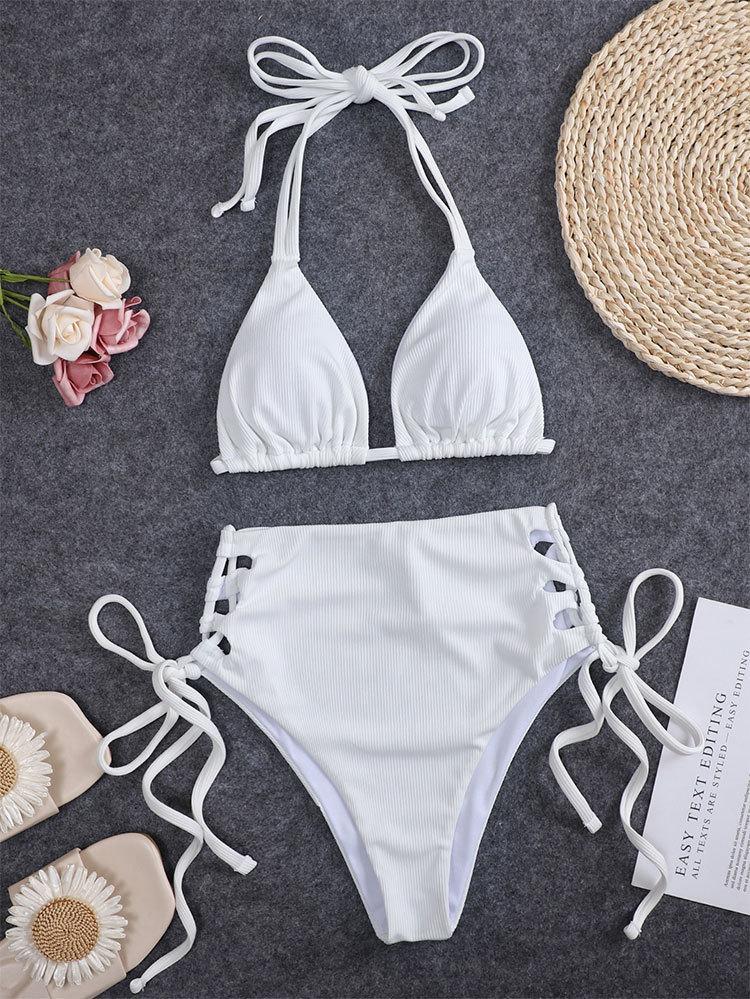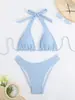 Bikini de cintura alta con abertura en color sólido sexy de Amazon, traje de baño con cordones para mujer, traje de baño de copa triangular con cuello halter, novedad de 2024