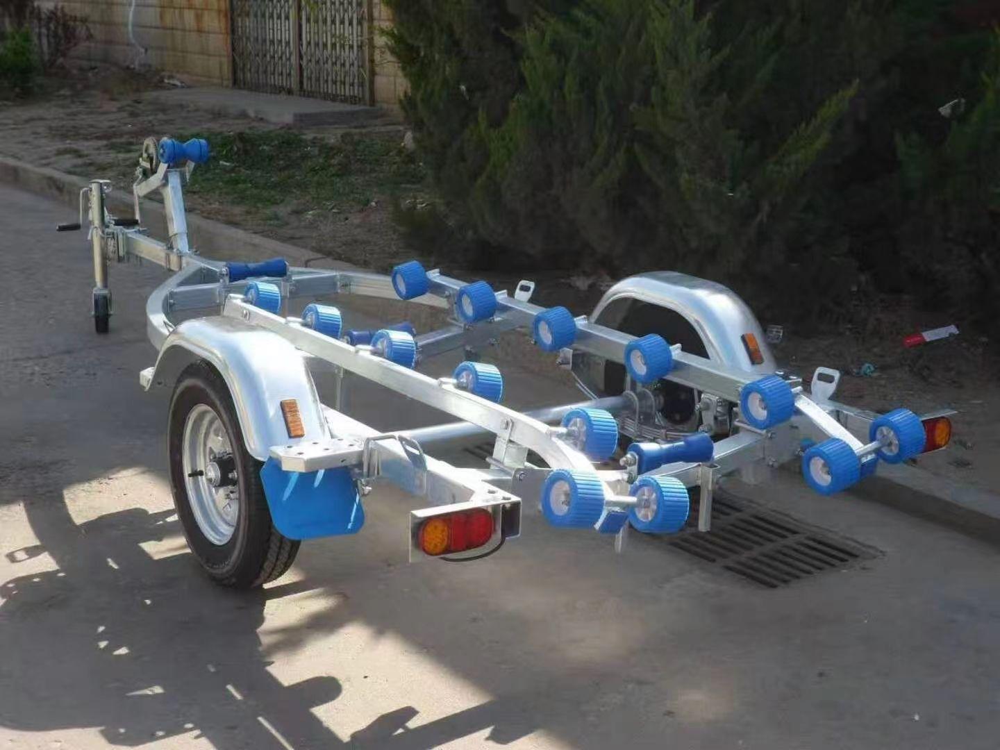 1) Las vigas laterales del remolque están hechas de tubos cuadrados galvanizados engrosados de 50*100*3 mm, las vigas transversales son tubos cuadrados galvanizados engrosados de 70*70*3 mm, y las barras de remolque son tubos cuadrados galvanizados por inmersión en caliente engrosados de 70*70*3 mm. 2) El remolque está equipado con un cabrestante manual personalizado de 1200 libras, un gato de rueda guía de 1200 libras, una luz trasera LED impermeable de 12-30 V, un arnés de cableado para la luz trasera del remolque, un juego de enchufes y tomas europeos de siete pines y un neumático de vacío 185R14 con capacidad de carga.